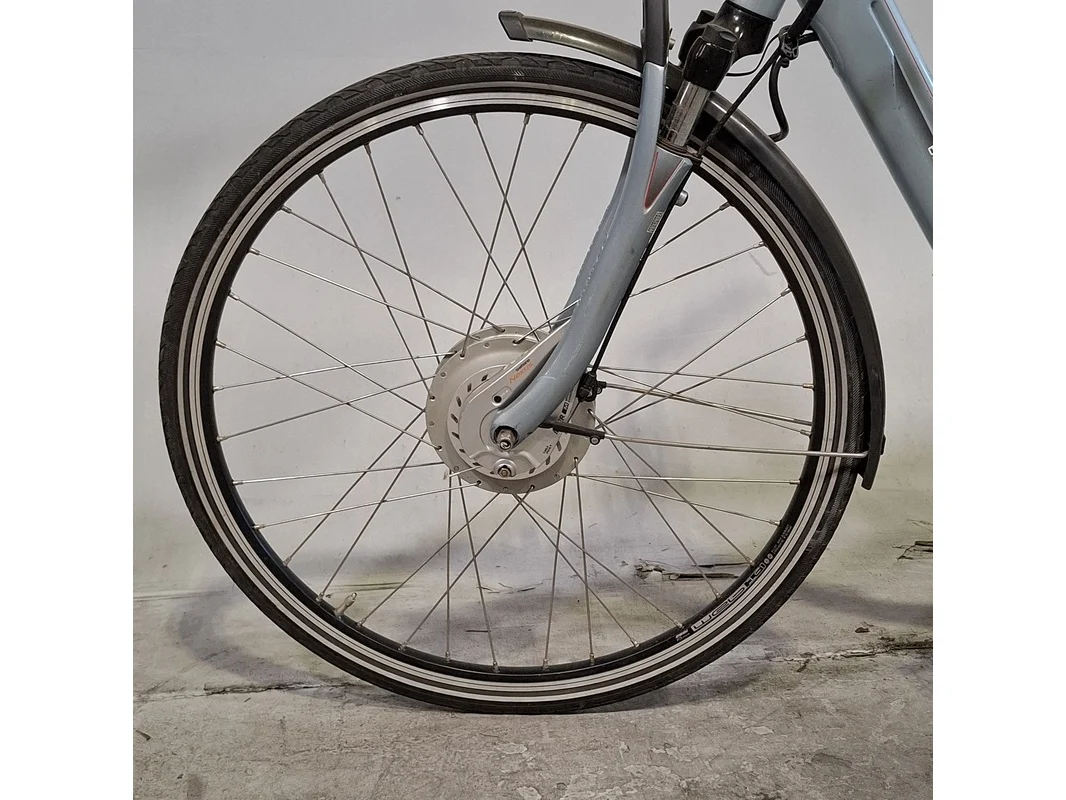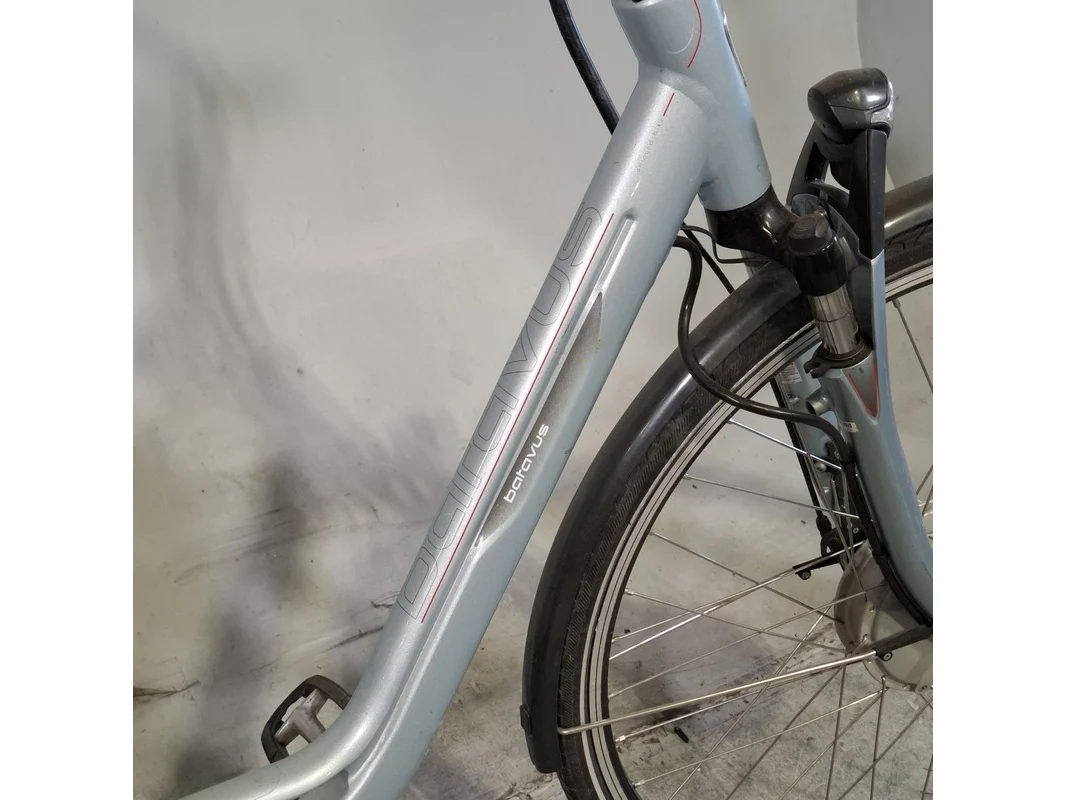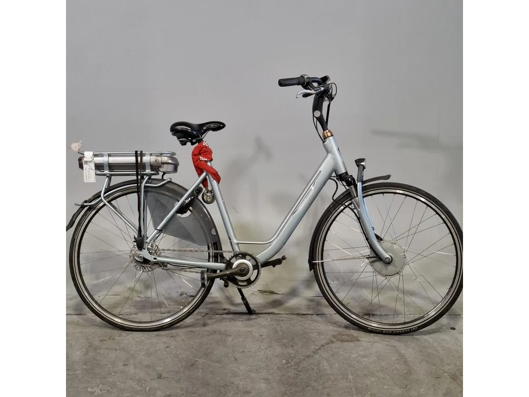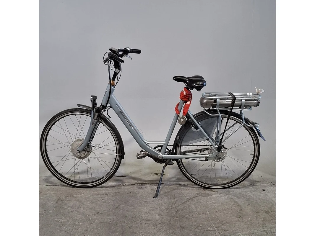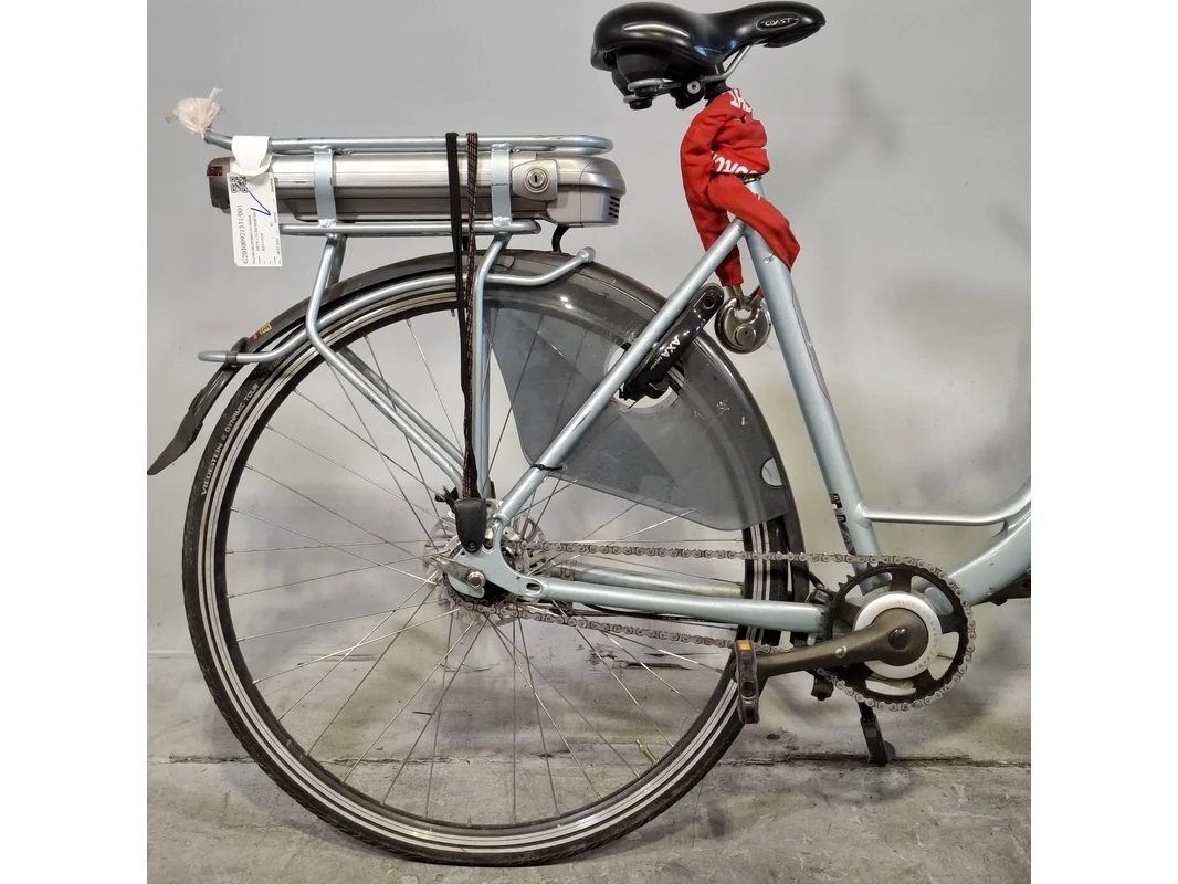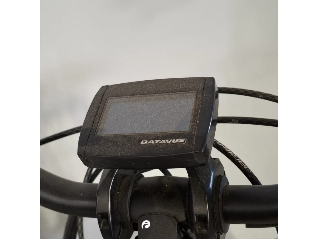 Merk: Batavus Product: Elektrische damesfiets Afmeting: Framemaat ca. 54 cm. Conditie: Gebruikt Specificaties: 7 versnellingen Geveerde voorvork Geveerde zadelpen Inclusief fietscomputer en accu Fiets gaat niet aan, bedieningskastje ontbreekt Voorwielmotor Exclusief acculader en sleutels Accu staat op slot, slot fiets doorgezaagd