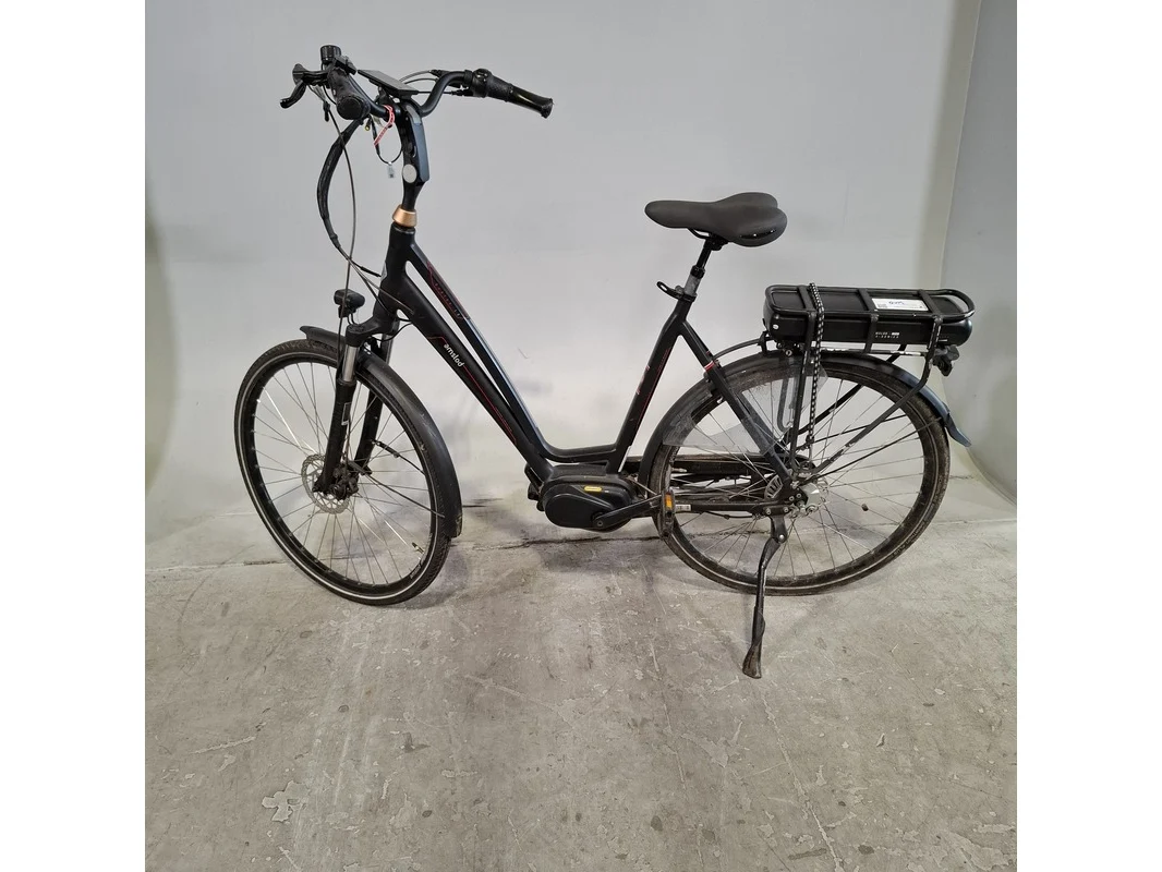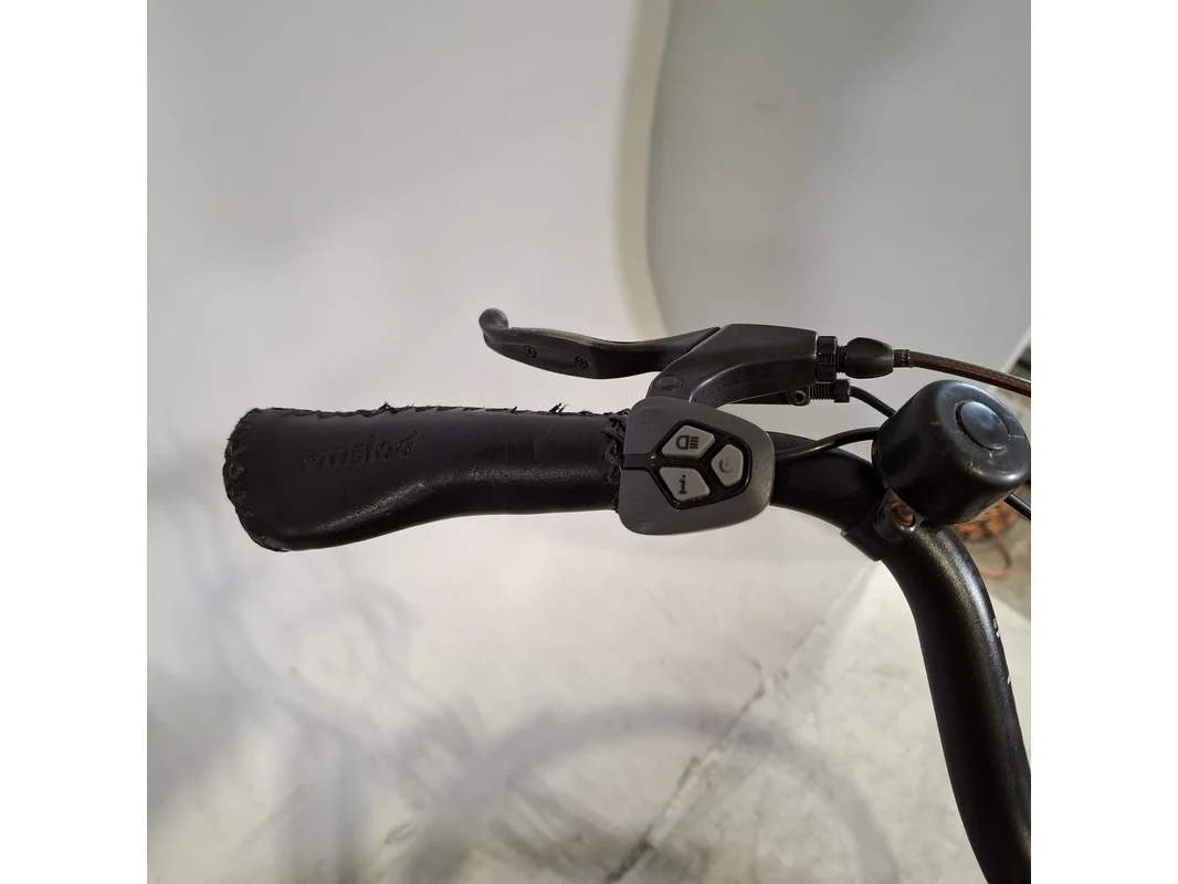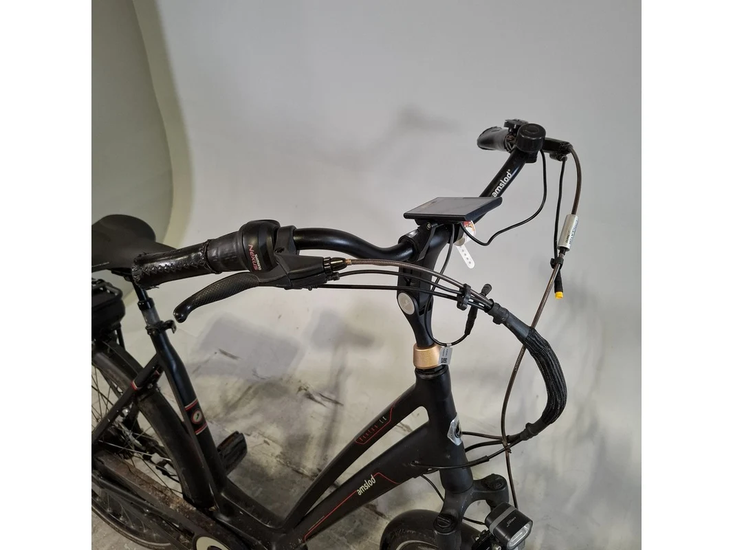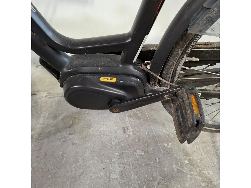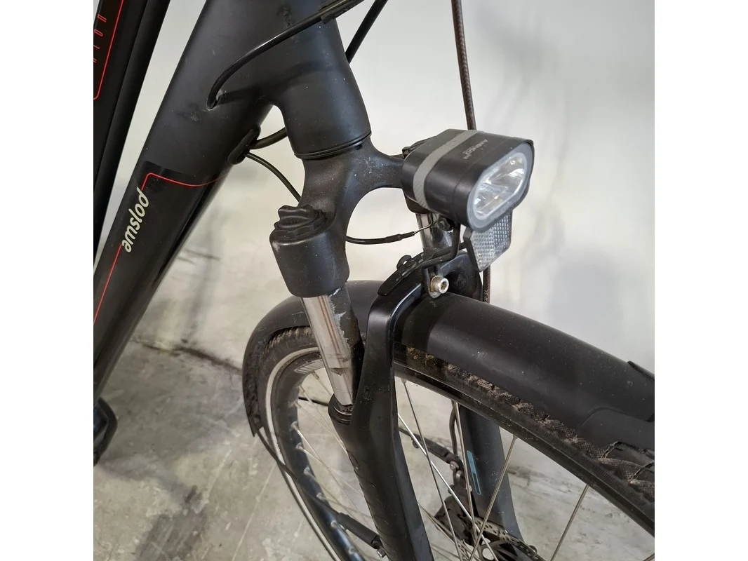 Merk: Amslod Product: Elektrische damesfiets Afmeting: Framemaat ca. 58 cm Conditie: gebruikt Specificaties: Geveerde voorvork en zadelpen 7 versnellingen Schijfrem voor en achter Amslod M400 middenmotor Inclusief fietscomputer en accu Accu is leeg. Exclusief sleutel accu.