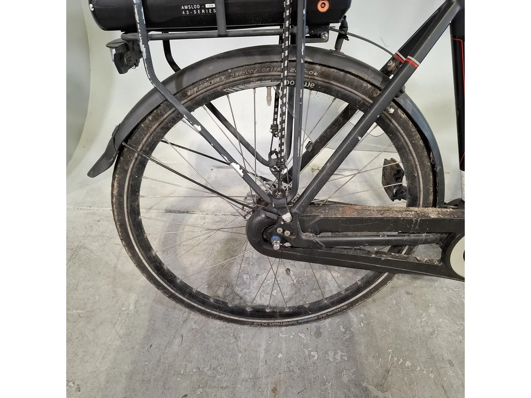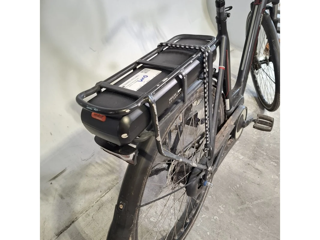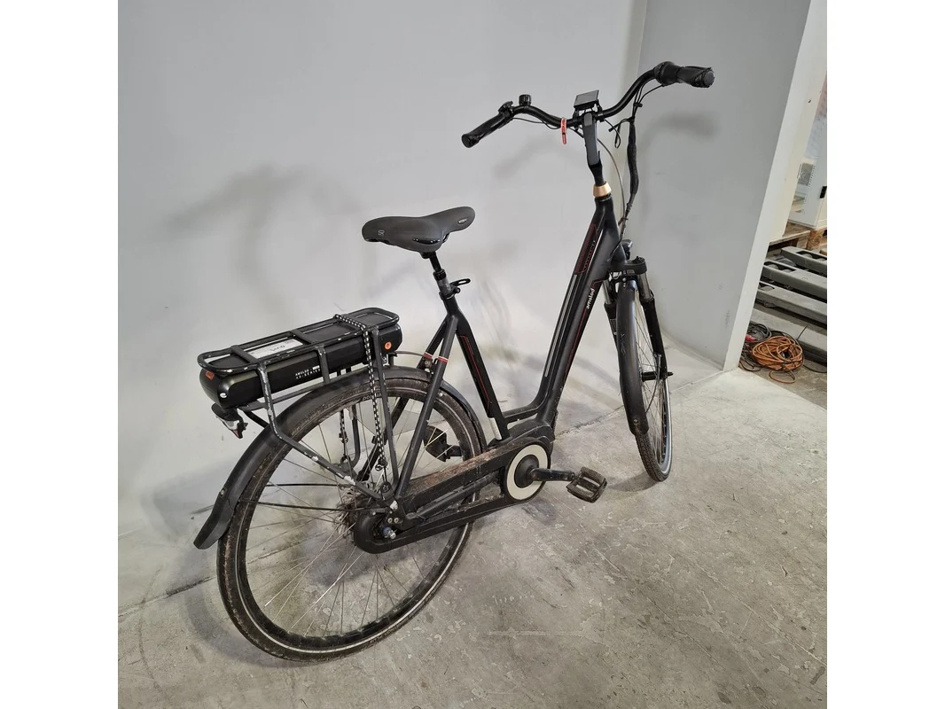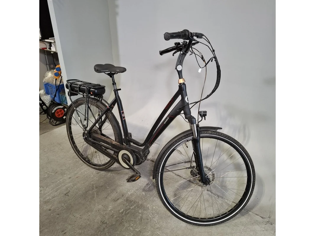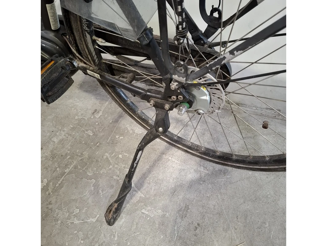 Merk: Amslod Product: Elektrische damesfiets Afmeting: Framemaat ca. 58 cm Conditie: gebruikt Specificaties: Geveerde voorvork en zadelpen 7 versnellingen Schijfrem voor en achter Amslod M400 middenmotor Inclusief fietscomputer en accu Accu is leeg. Exclusief sleutel accu.