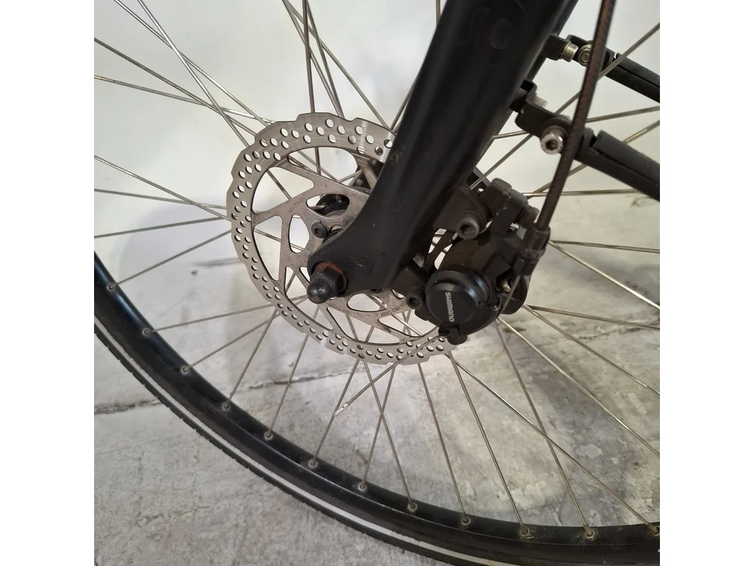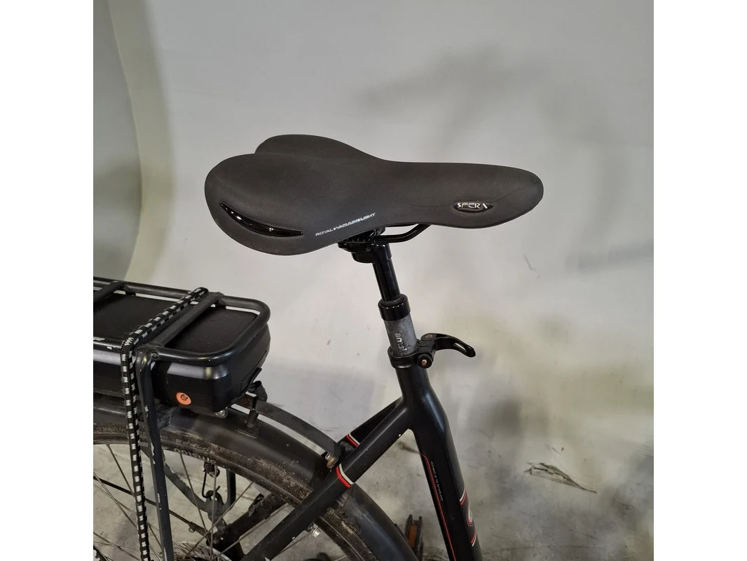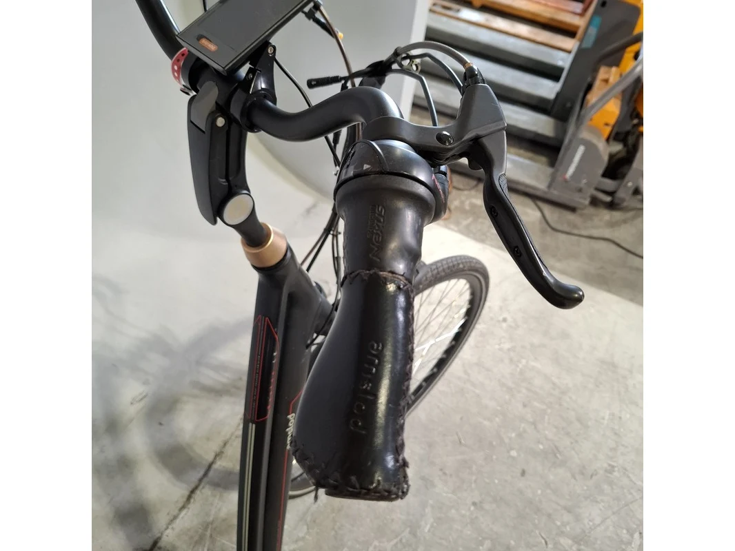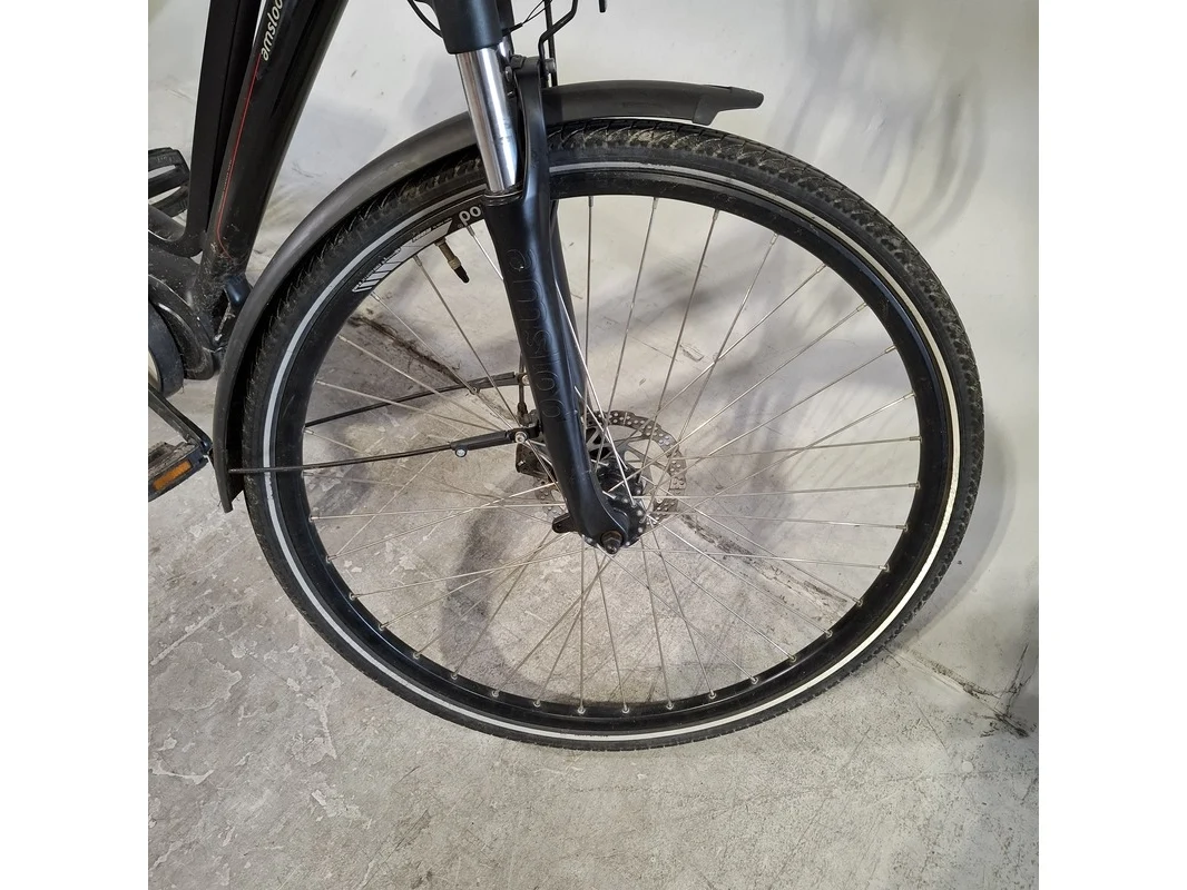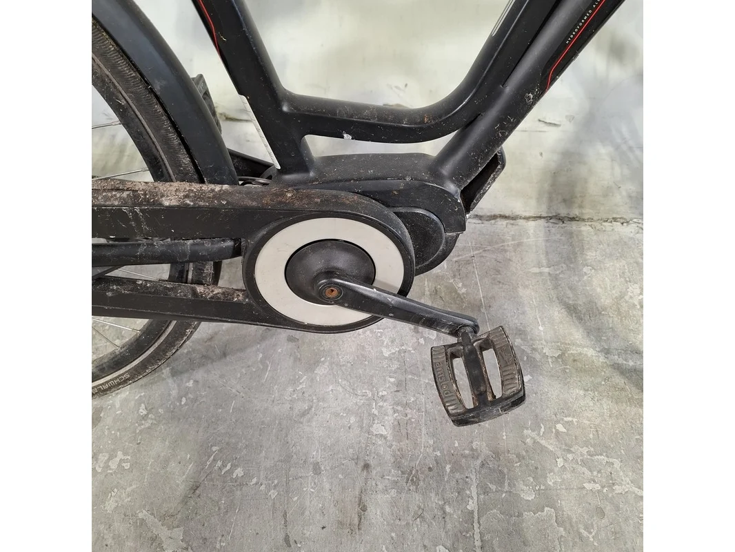 Merk: Amslod Product: Elektrische damesfiets Afmeting: Framemaat ca. 58 cm Conditie: gebruikt Specificaties: Geveerde voorvork en zadelpen 7 versnellingen Schijfrem voor en achter Amslod M400 middenmotor Inclusief fietscomputer en accu Accu is leeg. Exclusief sleutel accu.