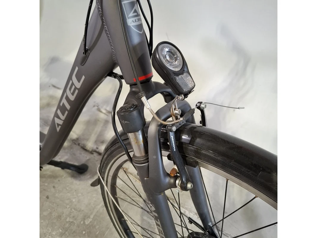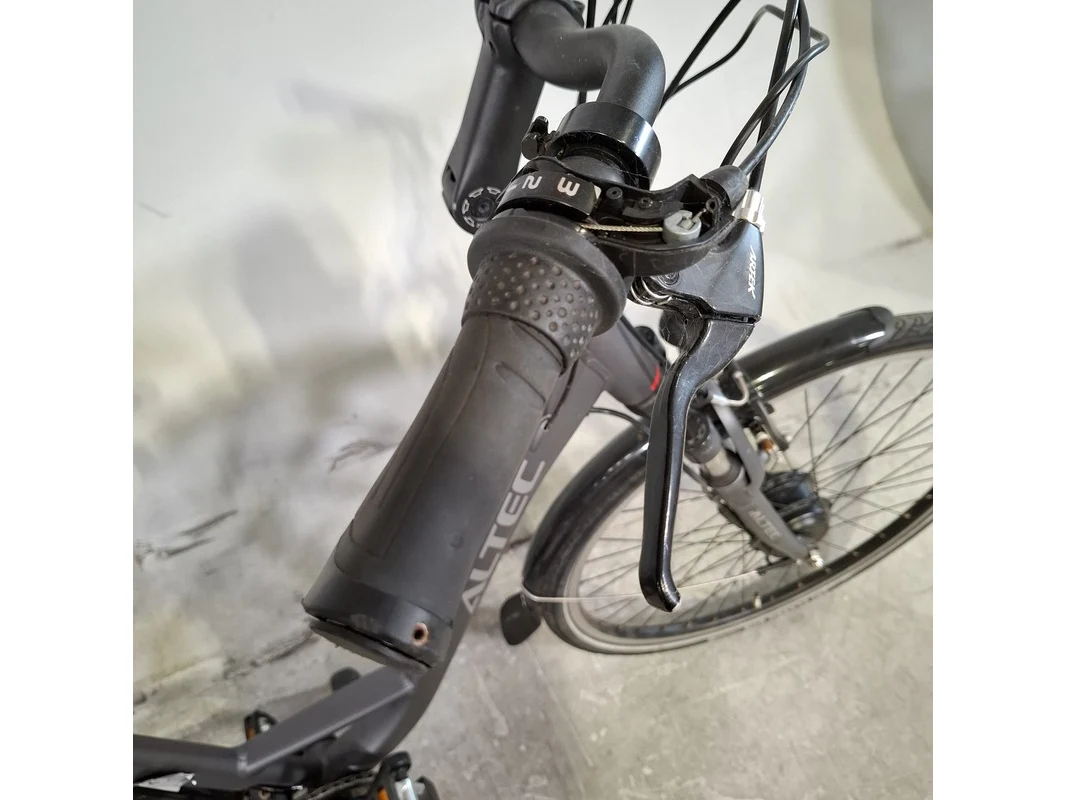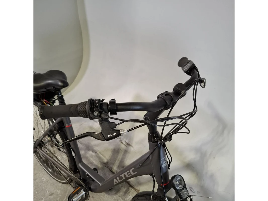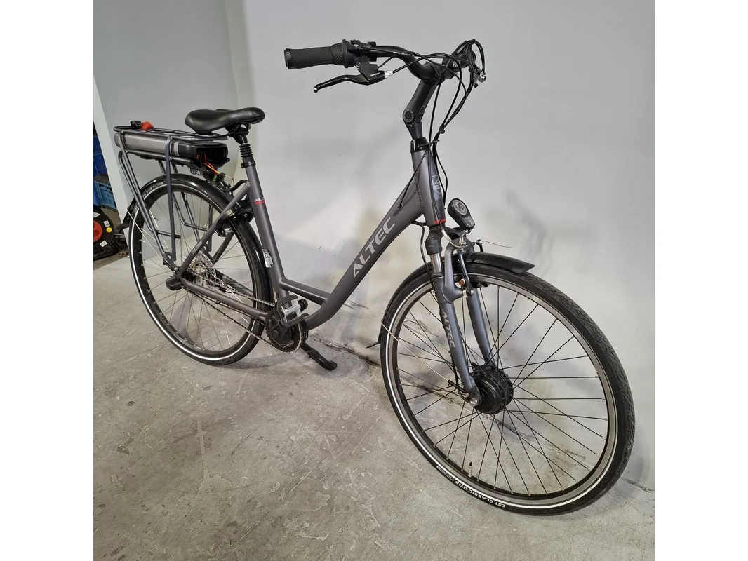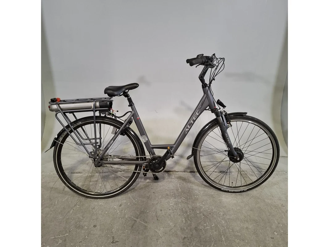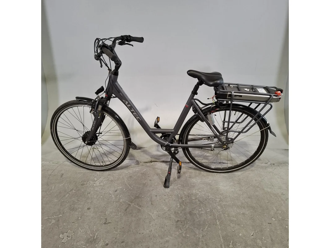 Merk: Altec Product: Elektrische damesfiets Afmeting: Framemaat ca. 53 cm Conditie: gebruikt Specificaties: 3 versnellingen Geveerde zadelpen Accu defect, afdek kap versnelling afgebroken. Exclusief sleutels, fiets staat op slot.