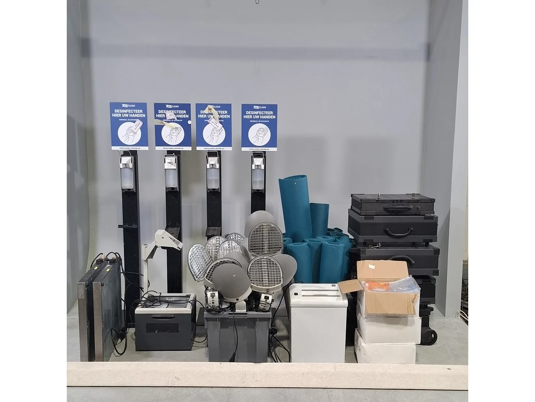 Product: Partij diverse bedrijfsinventaris Afmeting: Diverse maten Conditie: gebruikt Specificaties: Bestaande uit: desinfectiezuilen, yogamatten, warmhoudplaat, kunststof koffers en etc. De items hebben diverse beschadigingen en gebreken, technische staat en compleetheid onbekend.