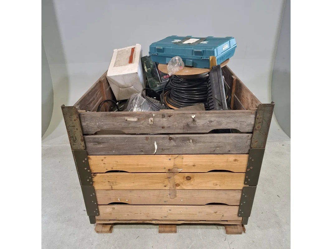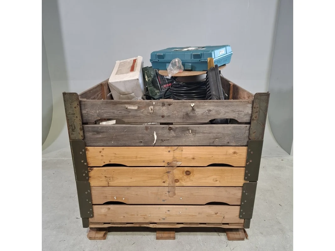 Merk: o.a. Makita/Metabo Product: Elektrisch handgereedschap en werkplaatsinventaris Conditie: gebruikt Specificaties: Bestaande uit o.a.: Makita reciprozaag Metabo decoupeerzaag verdeeldozen krachtstroonkabel etc. Exclusief palletkist.