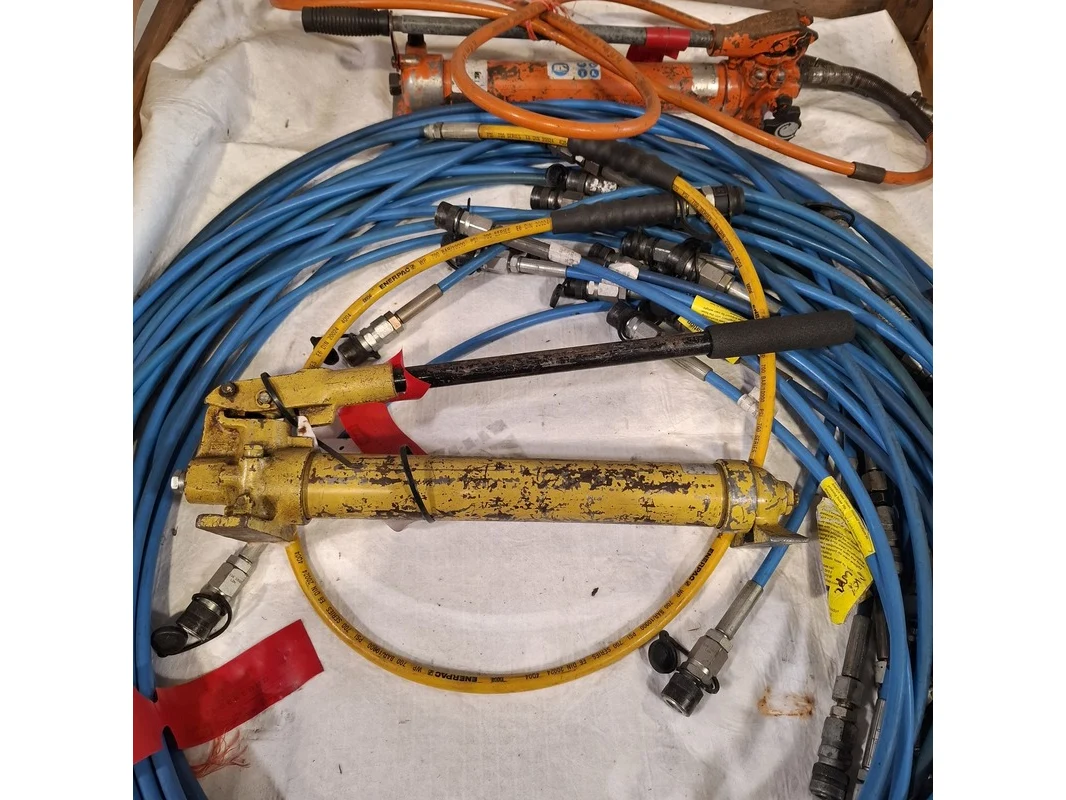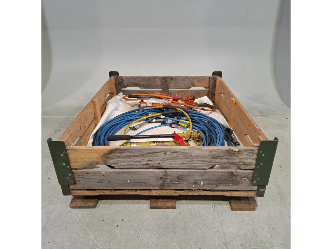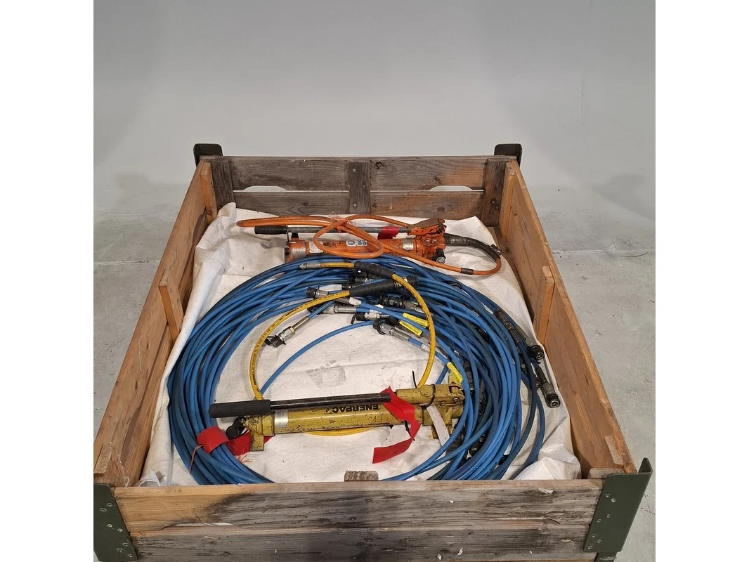 Merk: Cejn Product: hydraulische slangen en 2x handpomp Conditie: gebruikt Specificaties: Bestaande uit: diverse hydraulische slangen 2x hydraulische handpomp exclusief palletkist.