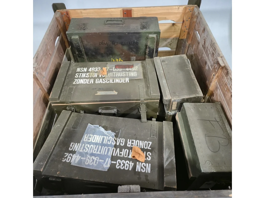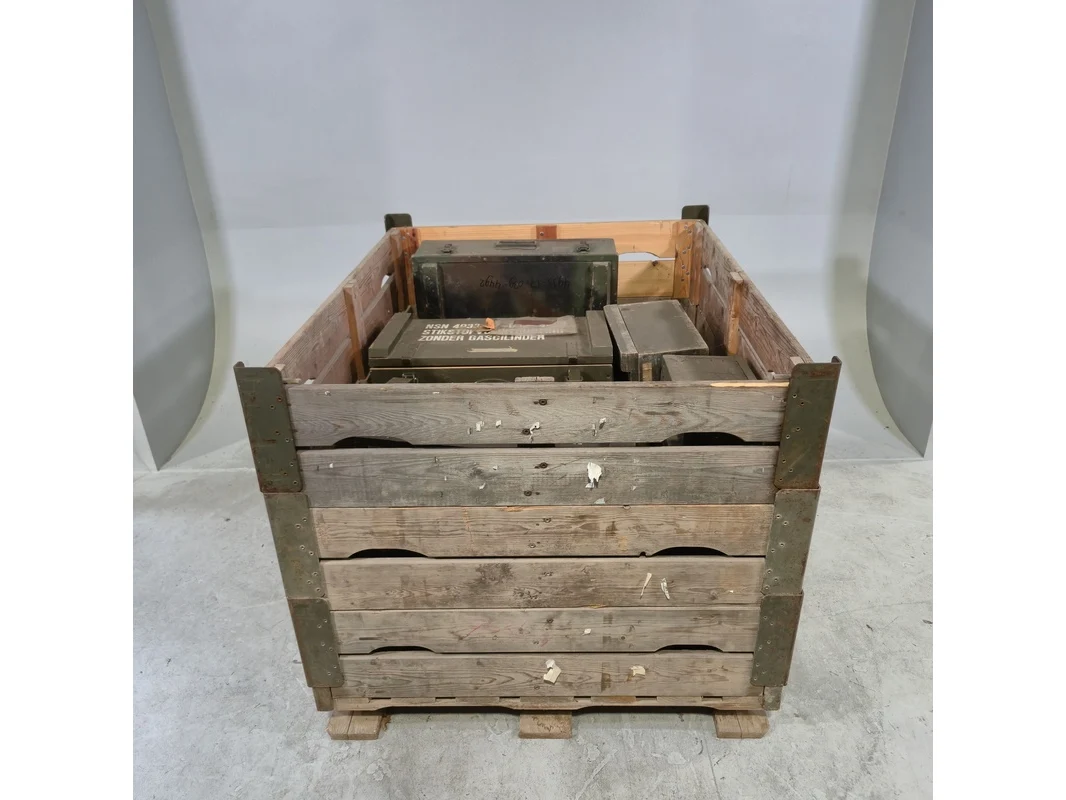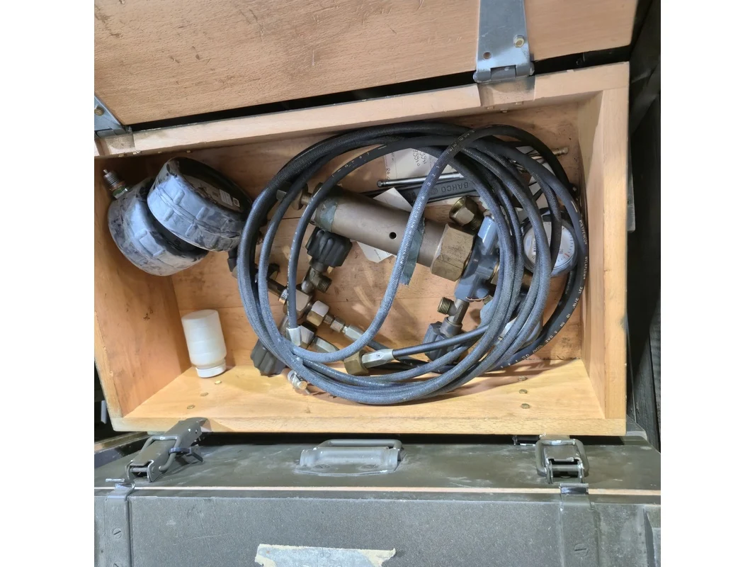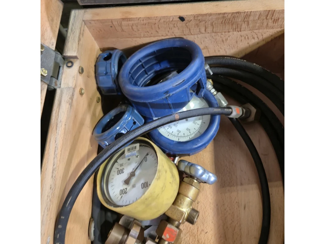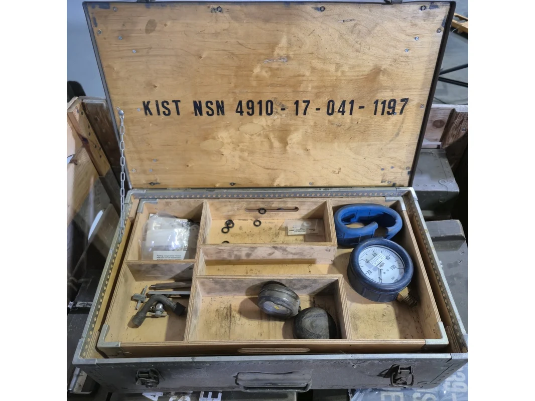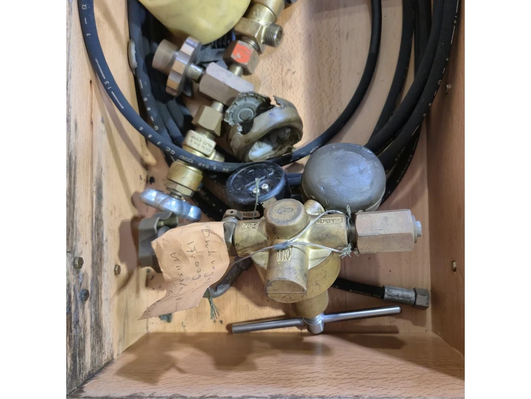 Product: Houten transportkist met inhoud Specificaties: inhoud bestaande uit o.a. : reduceerventielen, drukmeters, etc.