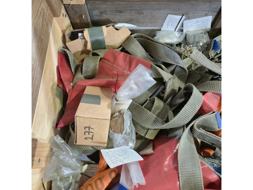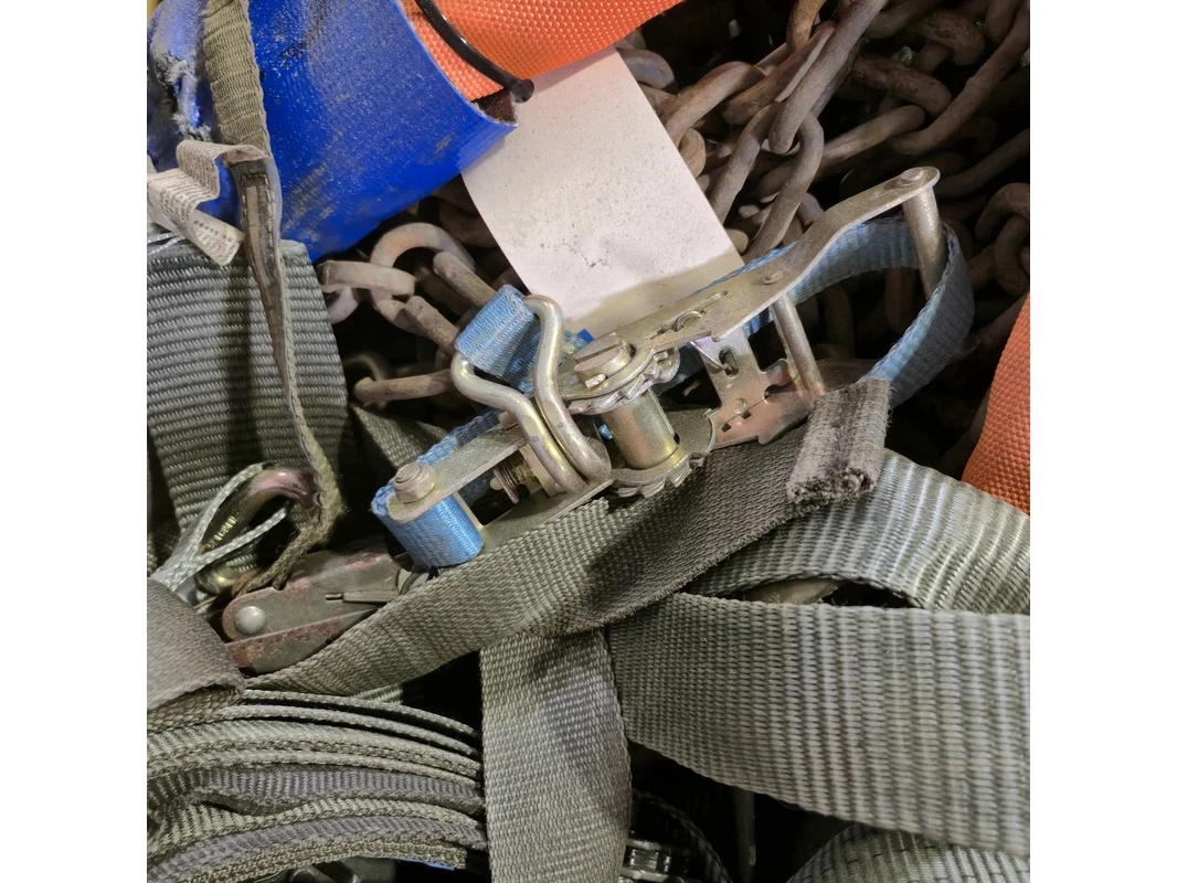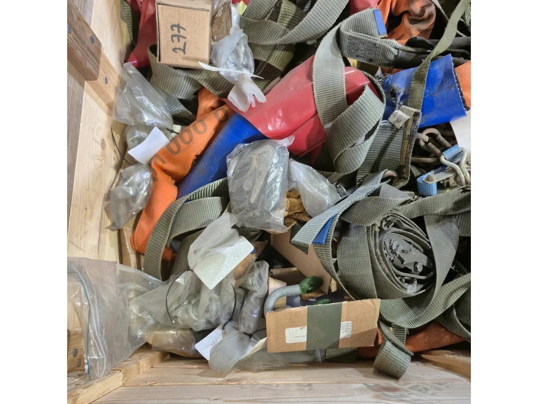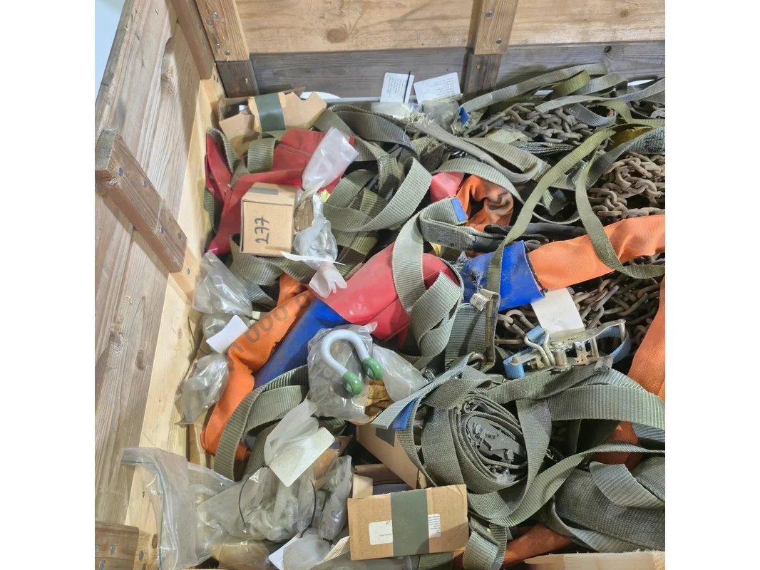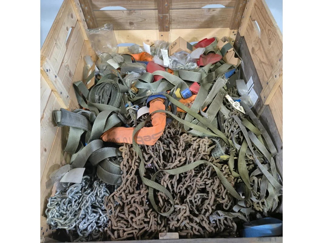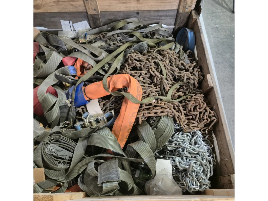 Product: Partij divers hijsmateriaal en sneeuwkettingen Specificaties: o.a. hijsbanden, spanbanden, harpsluitingen etc.