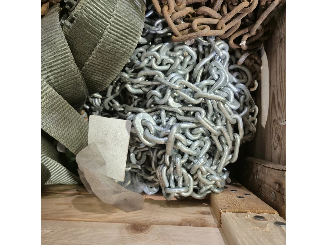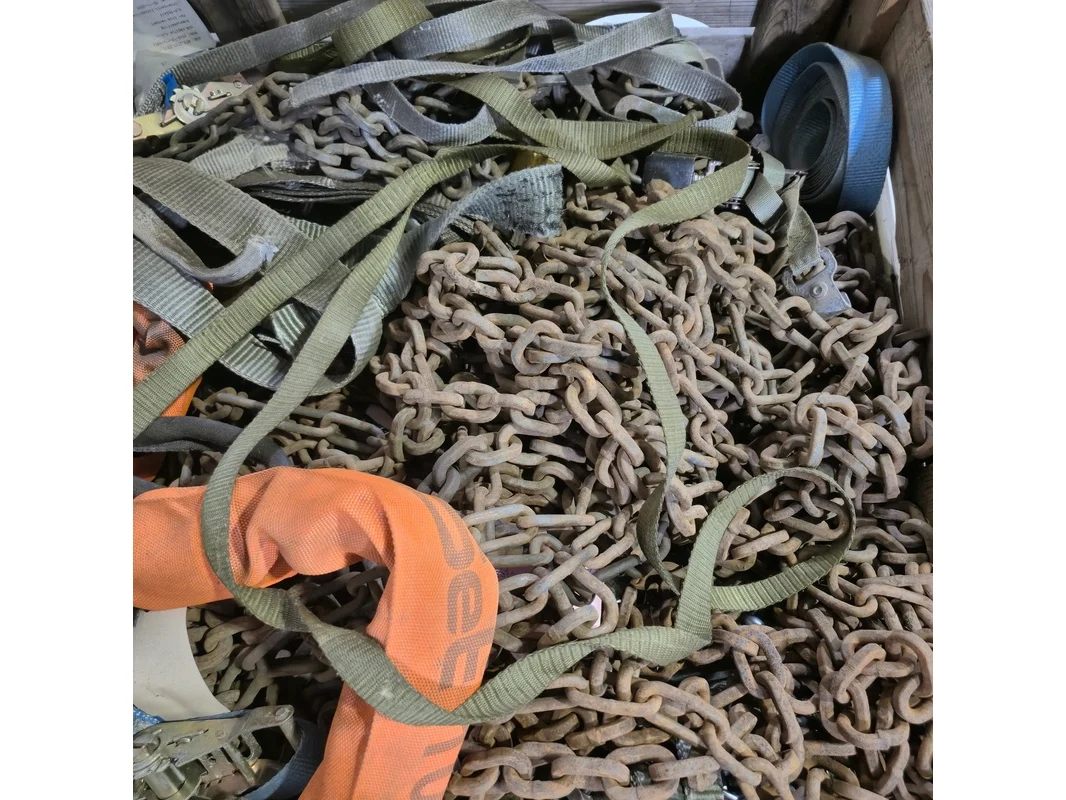 Partij divers hijsmateriaal en sneeuwkettingen