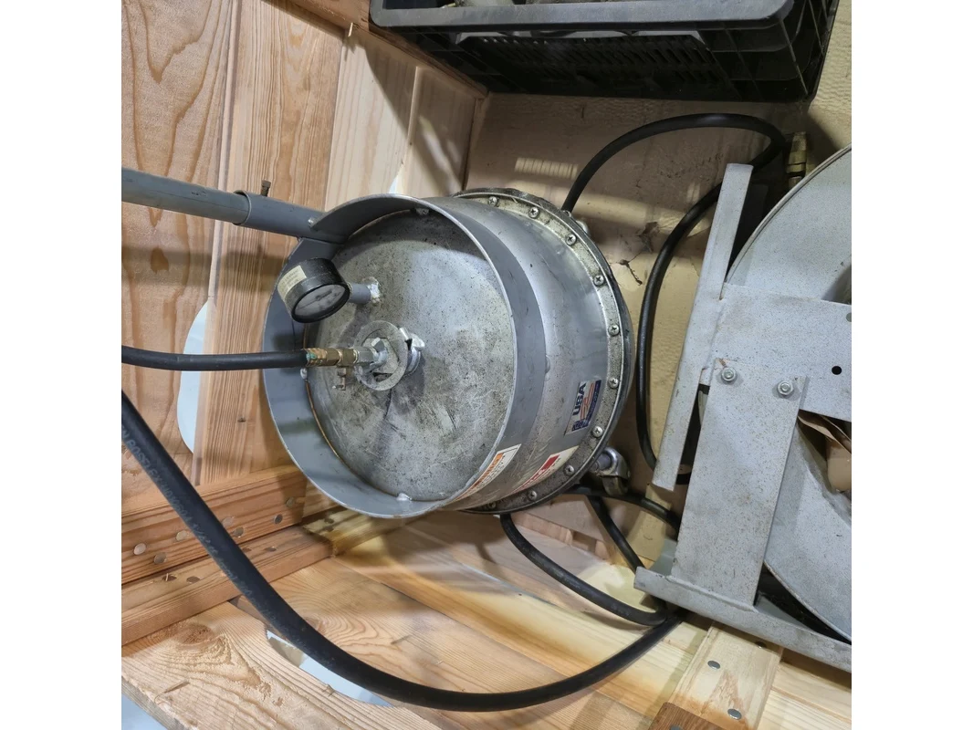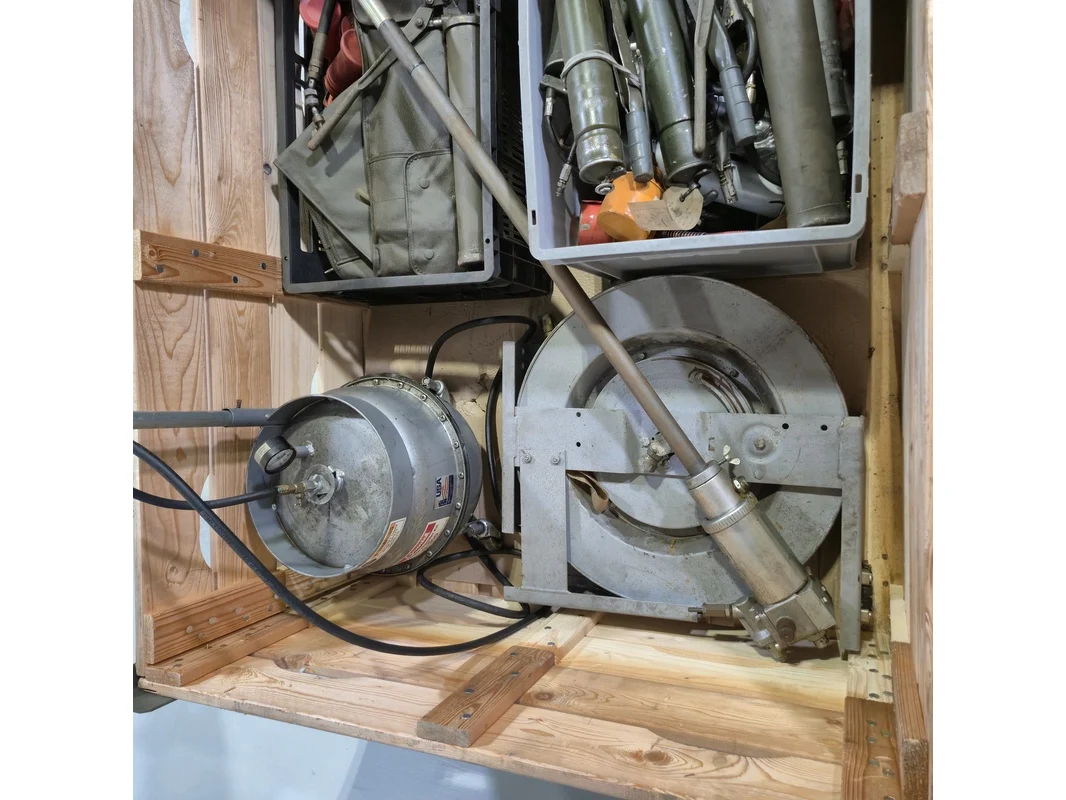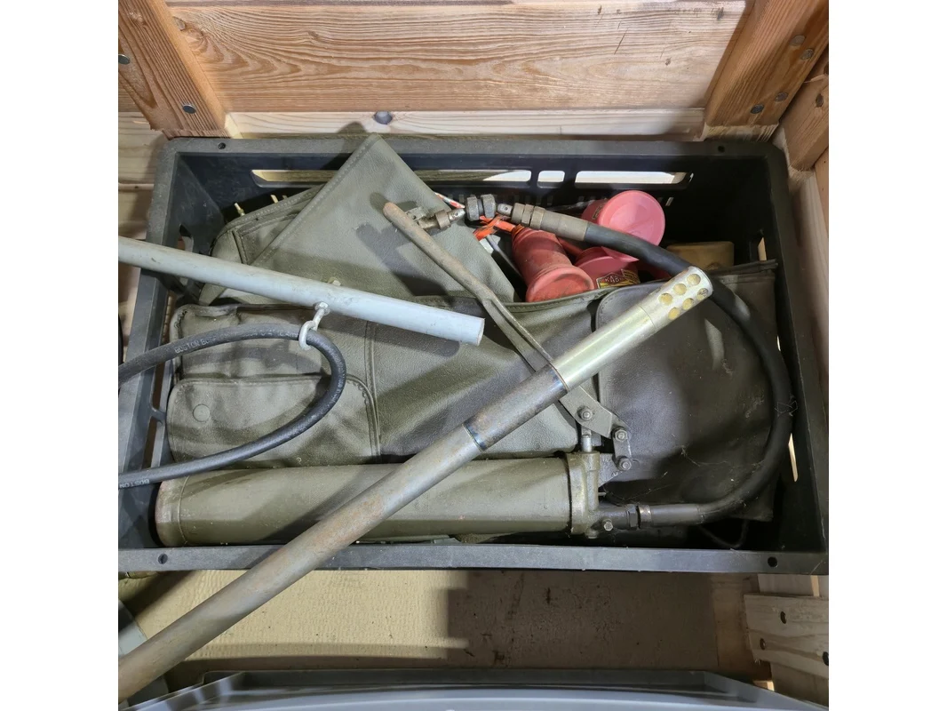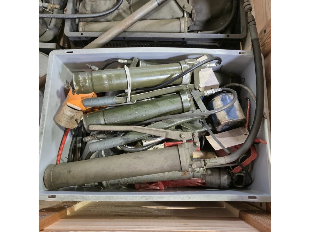Product: Assortiment gereedschap Specificaties: bestaande uit o.a. : diverse vetspuiten, slangenhaspel, drukremontluchter etc.