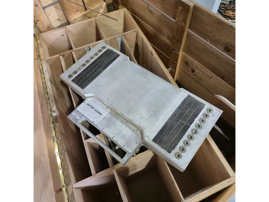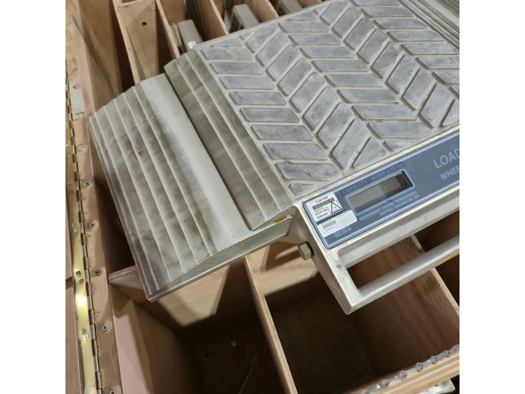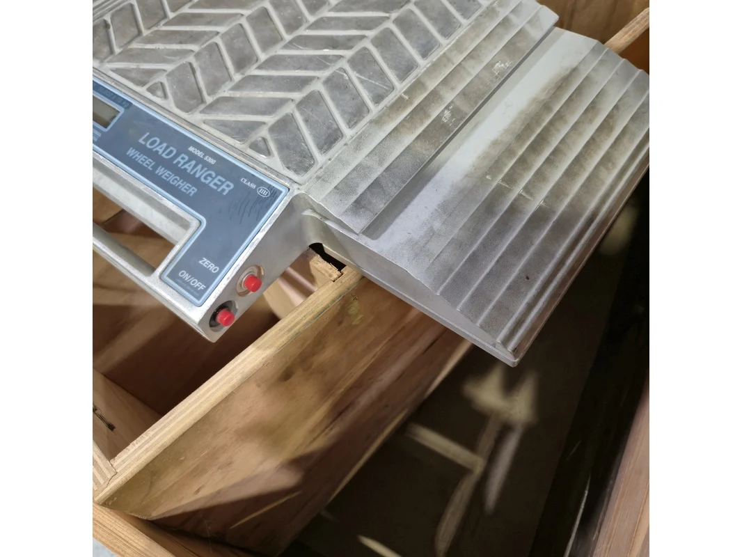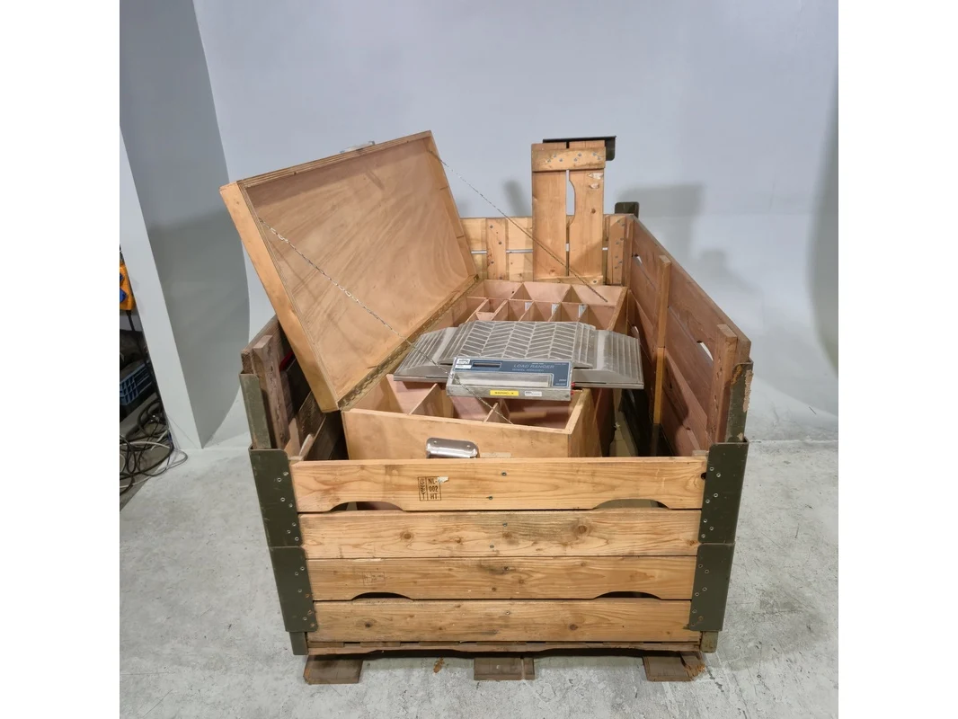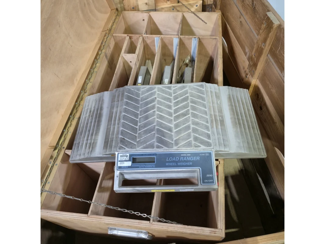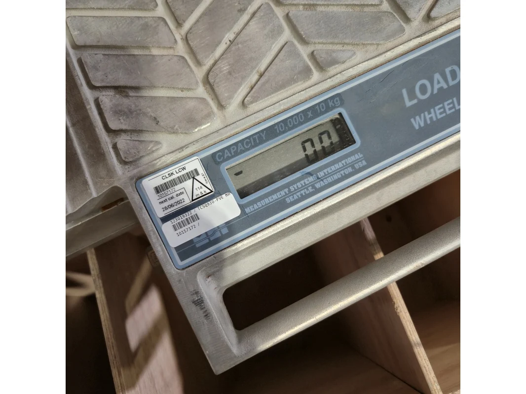 Product: Transportkist met 4x wiellast weegschaal Specificaties: kist hxbxd ca. 59x104x54cm weegschaal max 10000 x 10 kg
