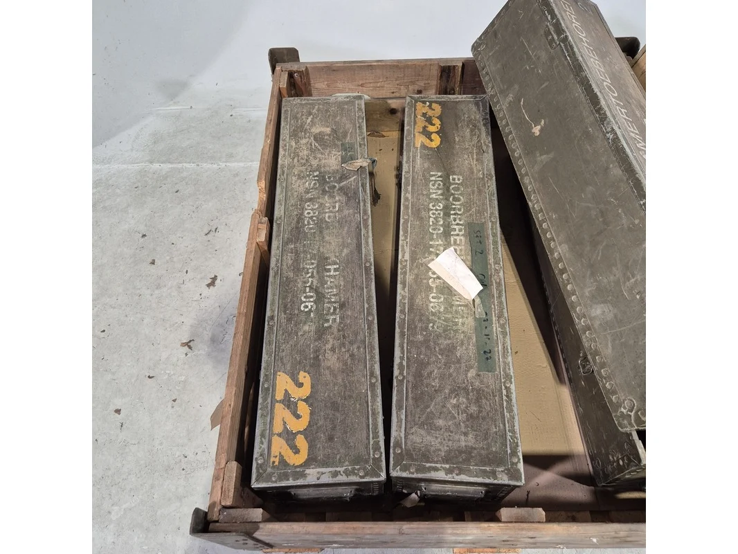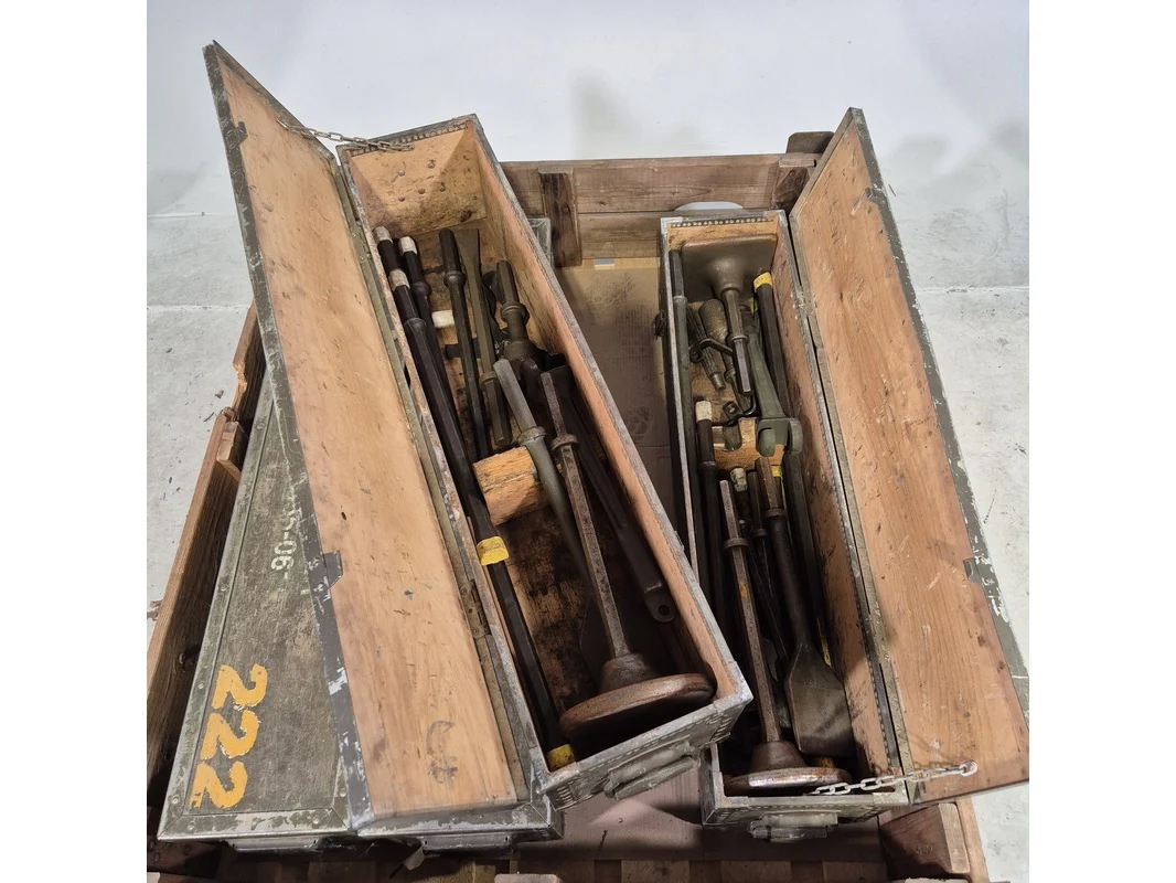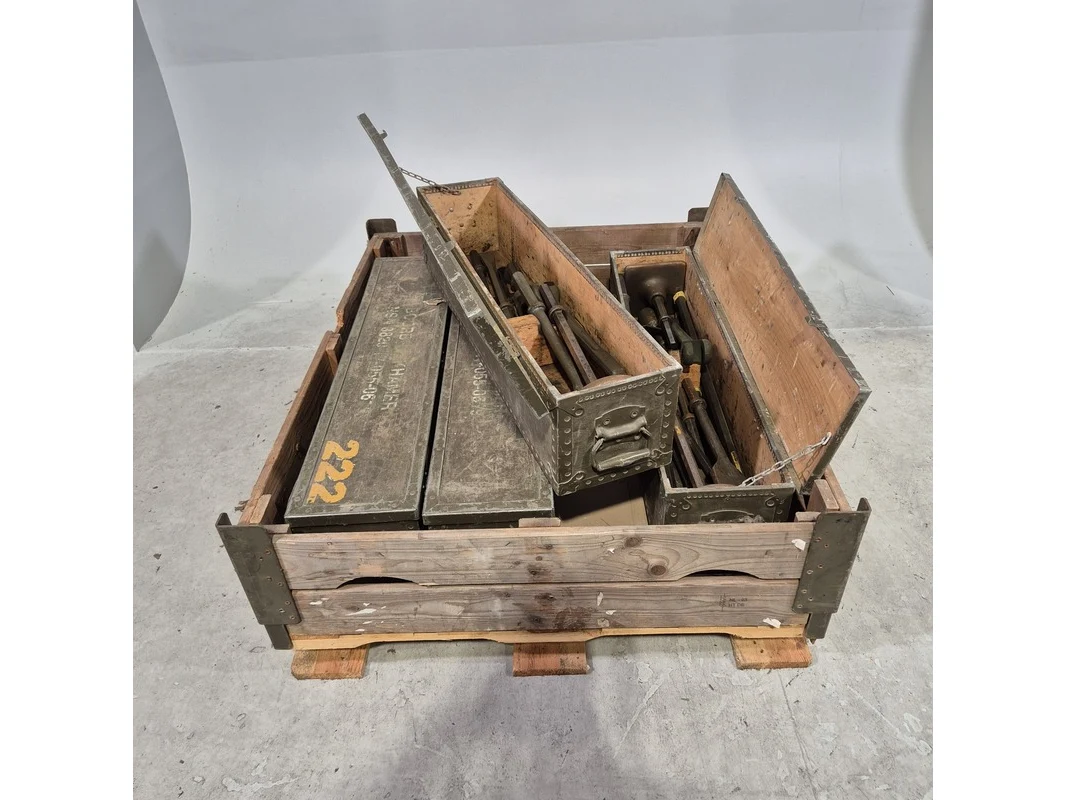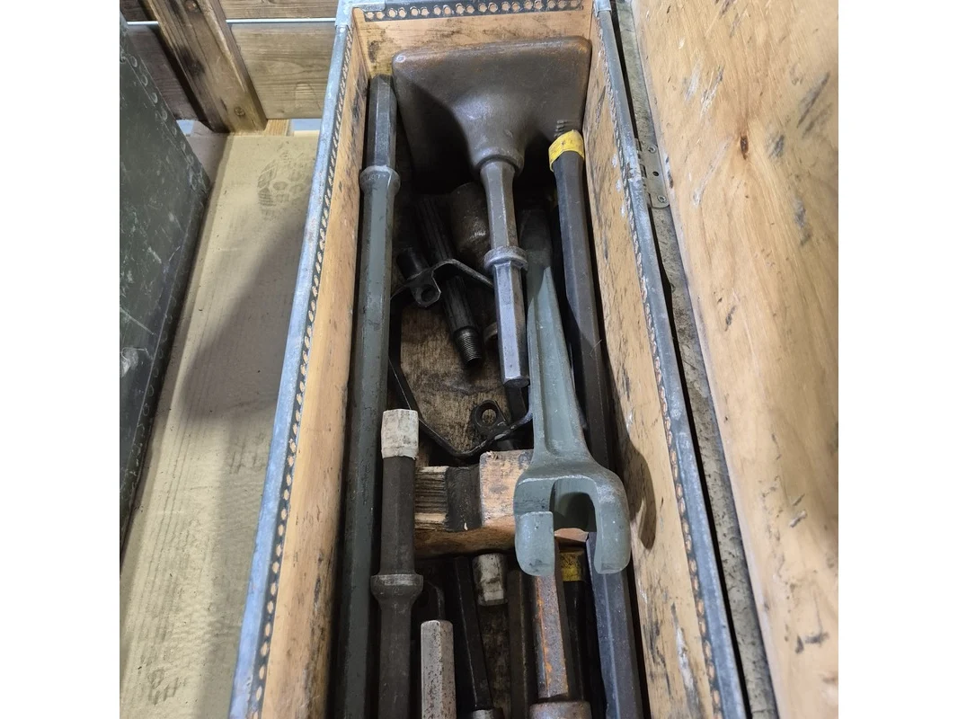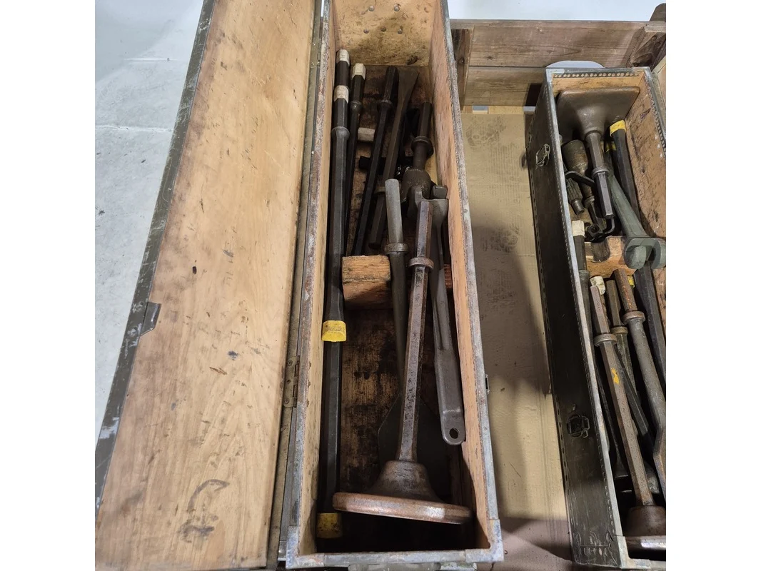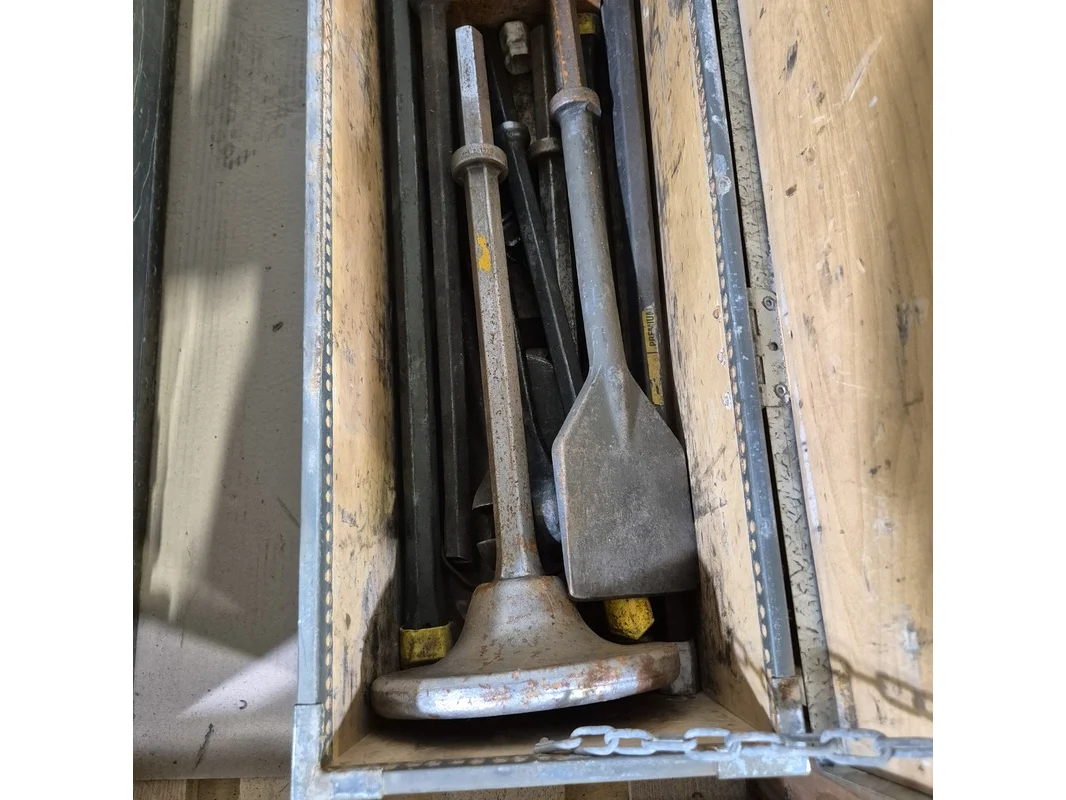 Product: Gereedschapskist met breekhamer toebehoren Afmeting: kist lxbxh ca. 98x23x25 cm Specificaties: Inhoudt bestaande uit diverse bijtels en opzetstukken. In koffer