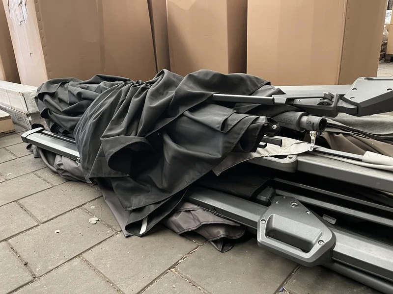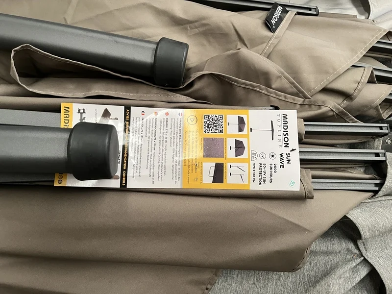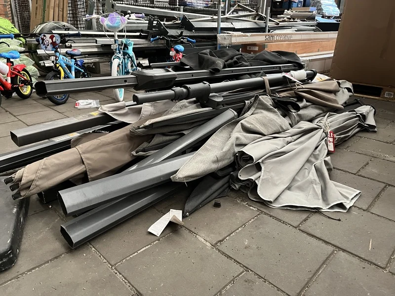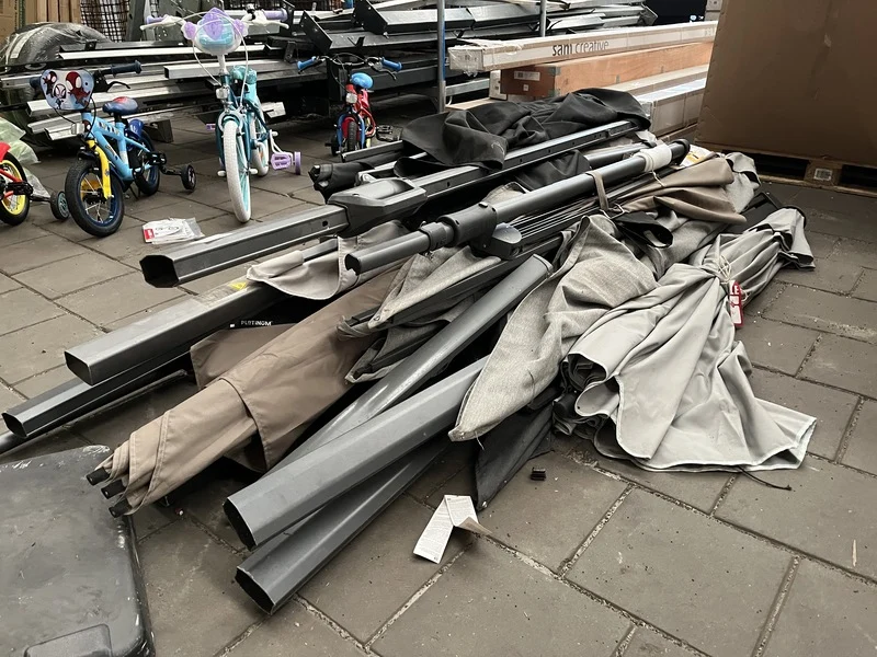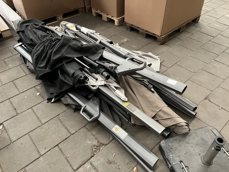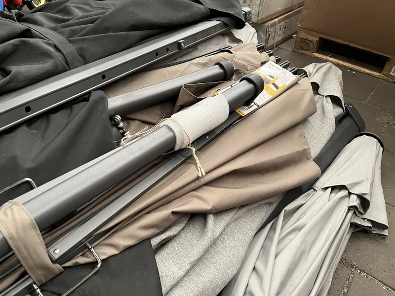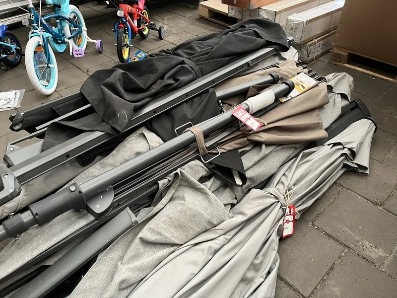 Product: Partij parasols Specificaties: Nieuw, showroom modellen en gebruikt. Niet compleet. Werking onbekend.