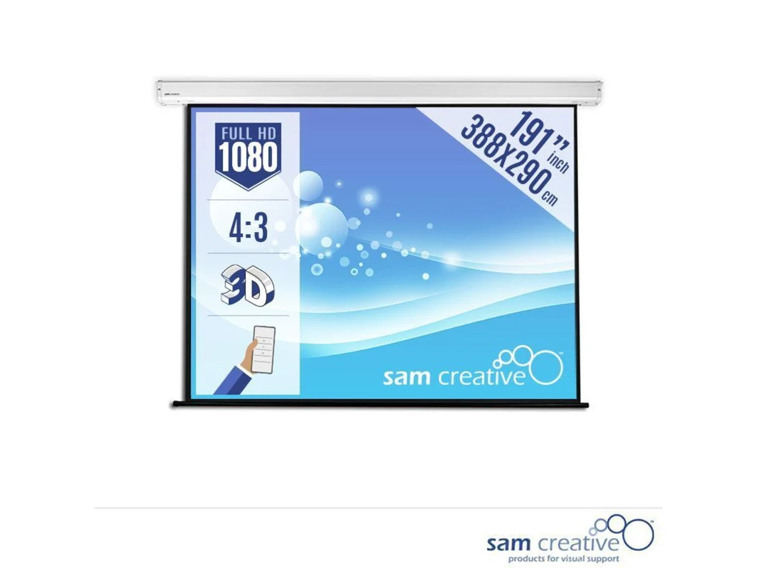 Merk: Sam Creative Product: Projectiescherm HD Elektrisch 388x290 cm 4:3 191" Conditie: nieuw Specificaties: Elektrisch bediend projectiescherm in de maatvoering 388x290 cm (BxH) in 4:3 beeldverhouding. Geschikt voor intensief gebruik thuis, op kantoor of op scholen. Het projectiescherm is voorzien van een stevige wit gelakte metalen behuizing dat zowel aan het plafond als aan de achterwand kan worden gemonteerd. Het projectiescherm kan worden bediend met de meegeleverde afstandsbediening. Het doek van het projectiescherm is gefabriceerd van meerdere gematteerde lagen, zodat het de projectie van uw beamer goed absorbeert. Dit zorgt voor een optimale beeldkwaliteit met hoge contrast vanuit alle kijkhoeken. Rondom het witte projectie-oppervlak heeft het projectiescherm een zwart canvas van circa 25mm. Hiermee kunt u uw projectie gemakkelijk passend in het projectievlak positioneren. Stijlvolle witte afwerking Stevige metalen behuizing Gemakkelijke elektrische bediening Inclusief afstandsbediening Mat wit doek voor extra beeldkwaliteit Zwart canvas rondom projectievlak In formaat 388x290 cm (BxH) in 4:3 beeldverhouding Voor wand- en plafondmontage Inclusief montagemateriaal en handleiding