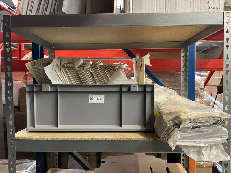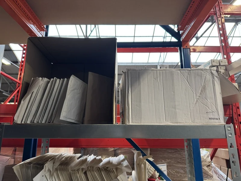 Product: Stelling met verzendmateriaal, enveloppen en dozen Specificaties: Verzendmateriaal nieuw, stelling gebruikt.