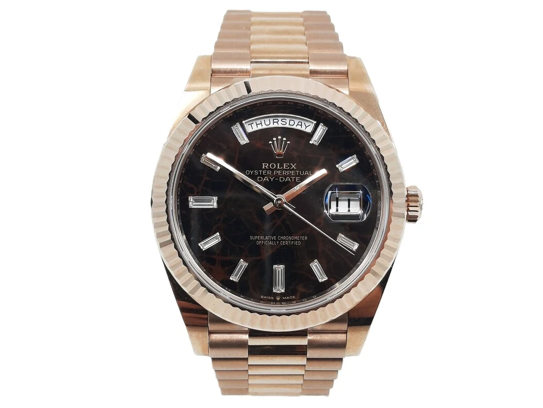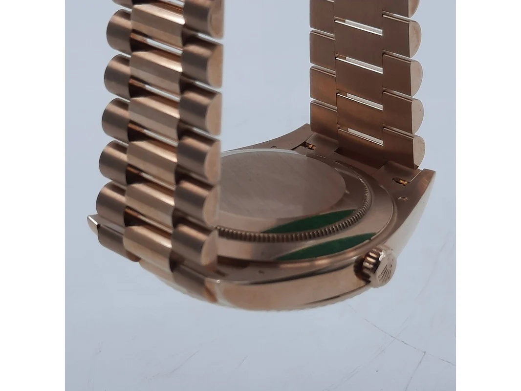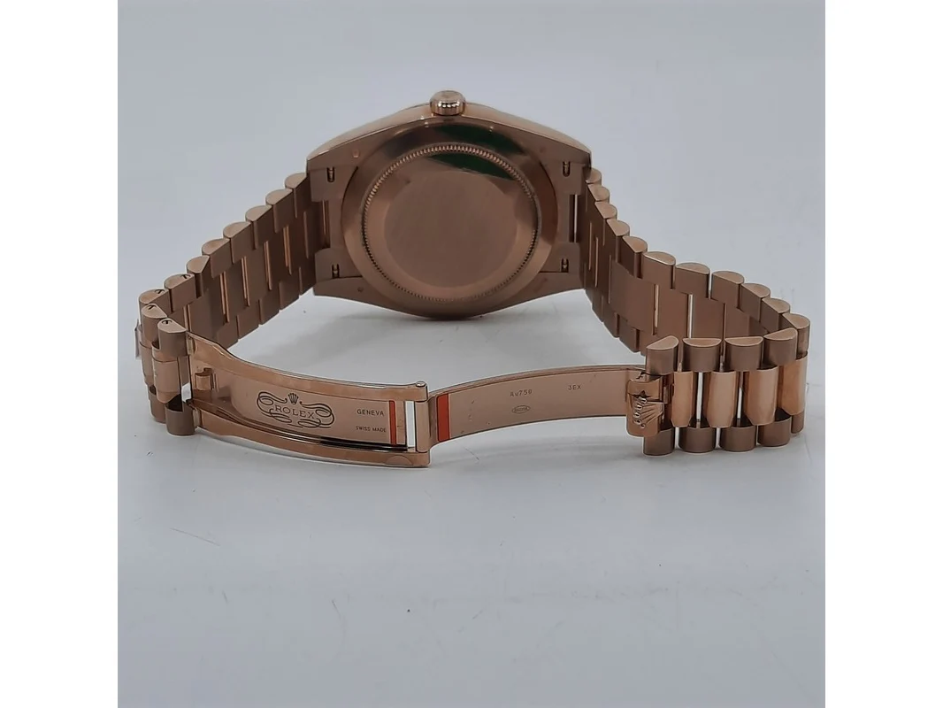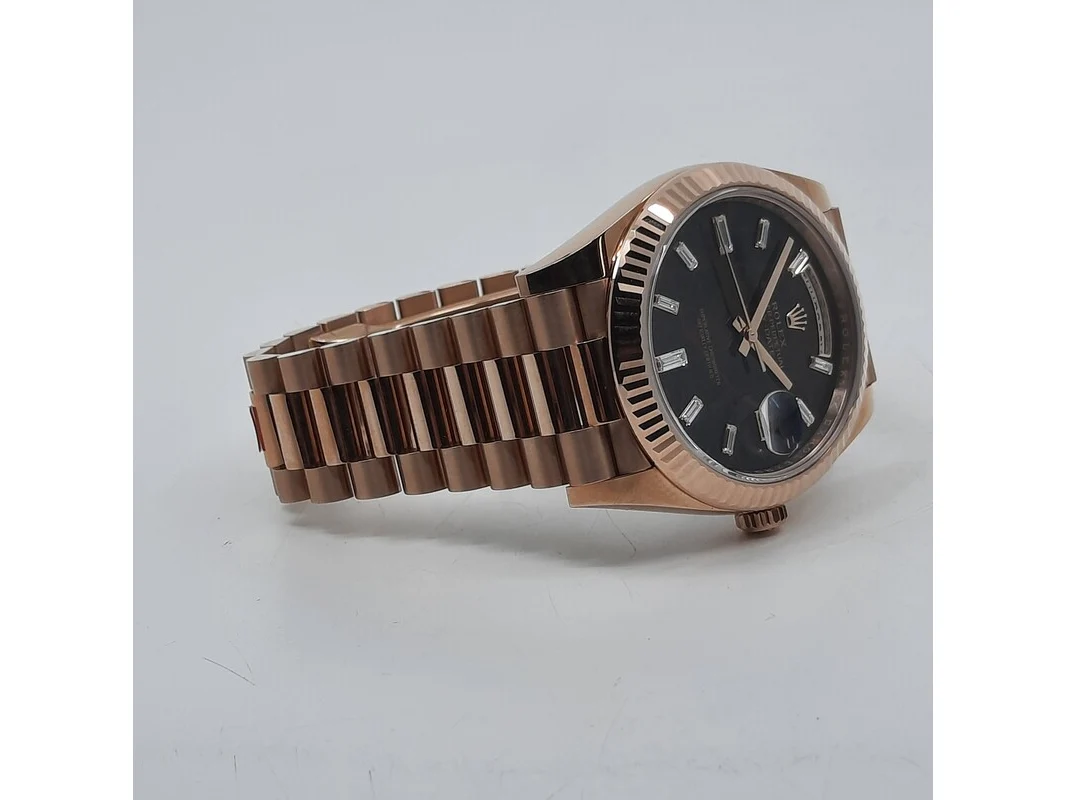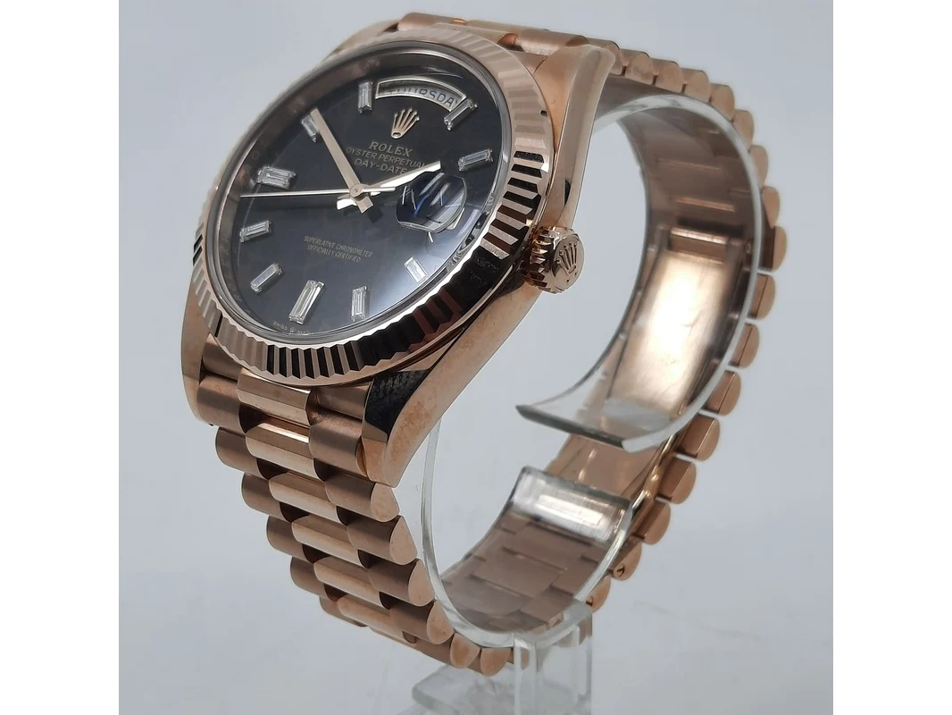 Merk: Rolex Product: Heren polshorloge Conditie: Gebruikt Specificaties: Een roségouden heren polshorloge, Rolex Day-Date (40) 228235. Met Eisenkiesl wijzerplaat, diamant baguette indices en roségouden President model band. Gehalte 'AU750', bruto gewicht ca. 203,6 gram. Inclusief doos en certificaat. Documentatie van 10-01-2022.