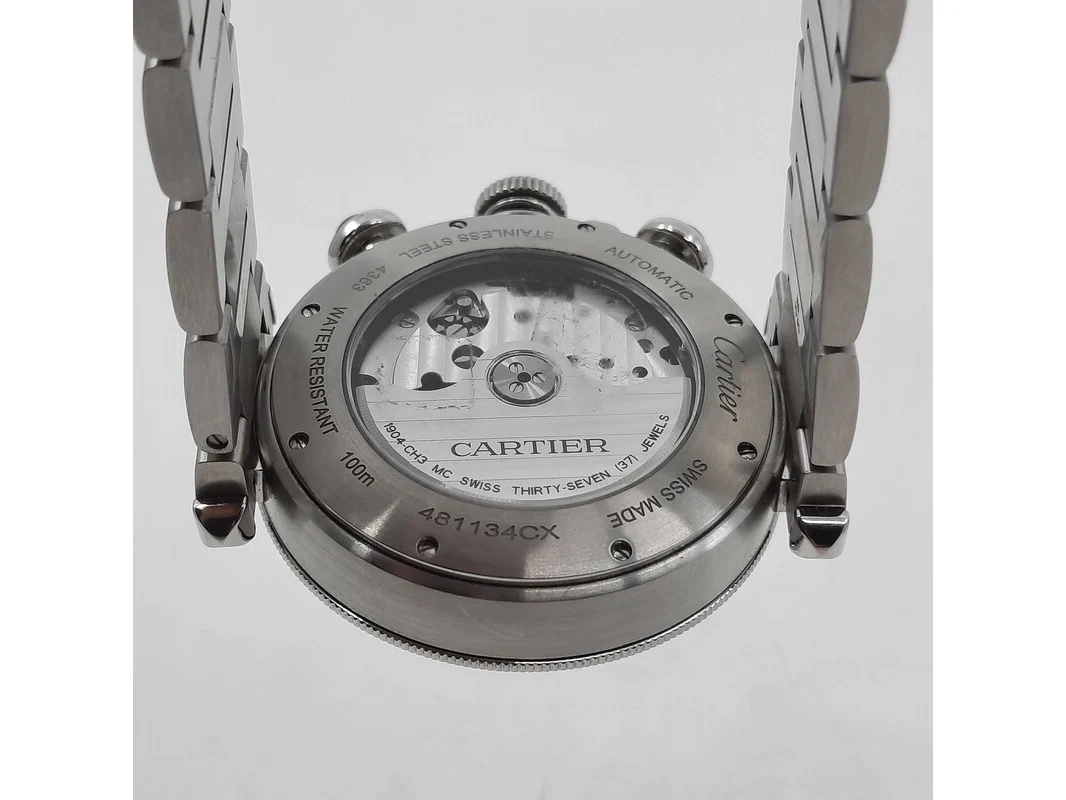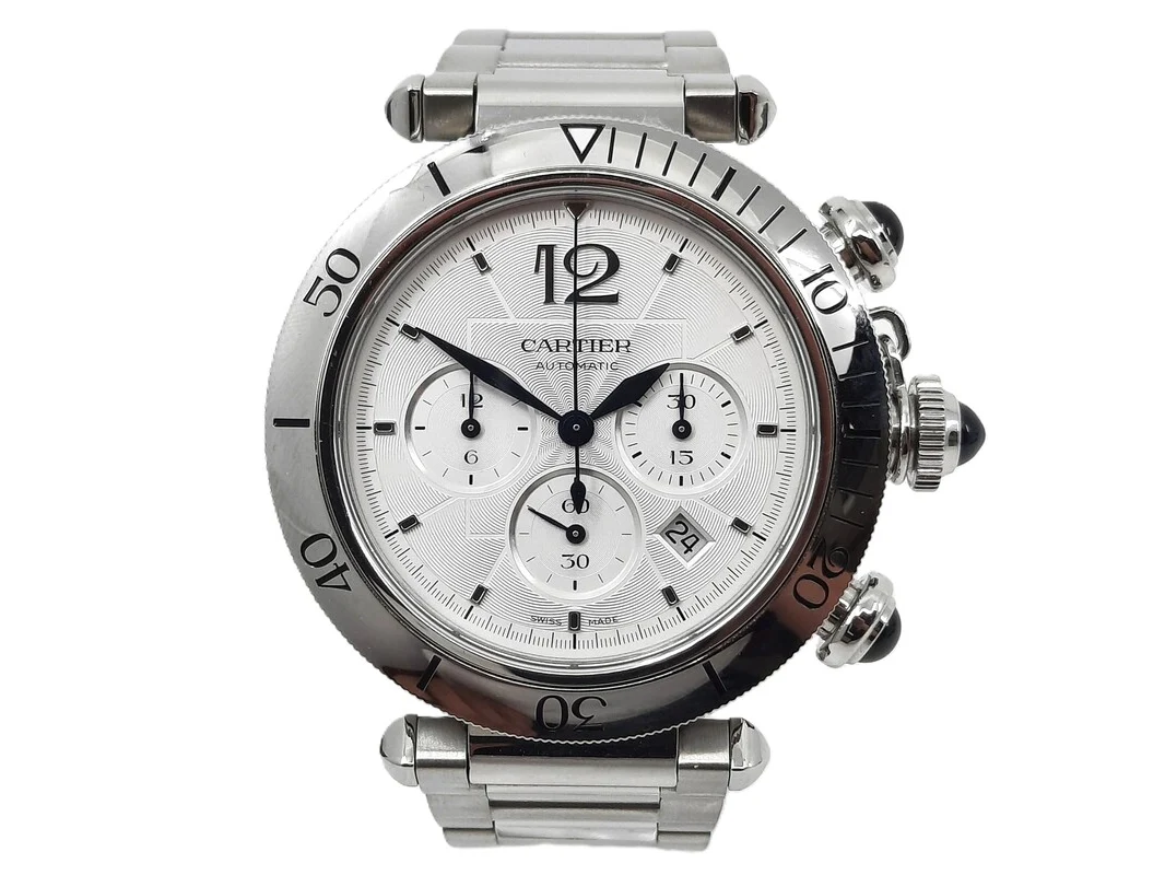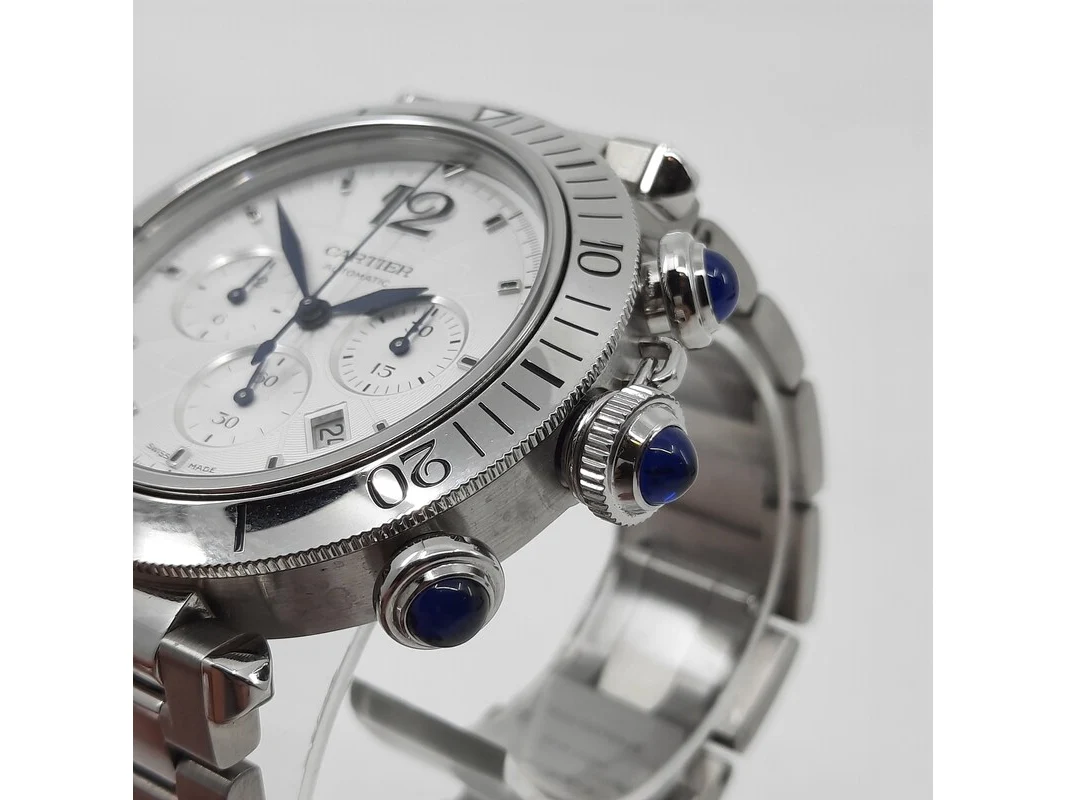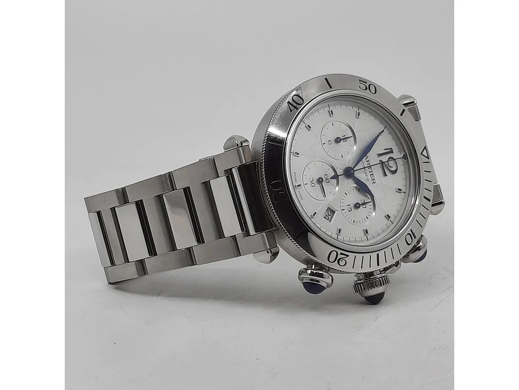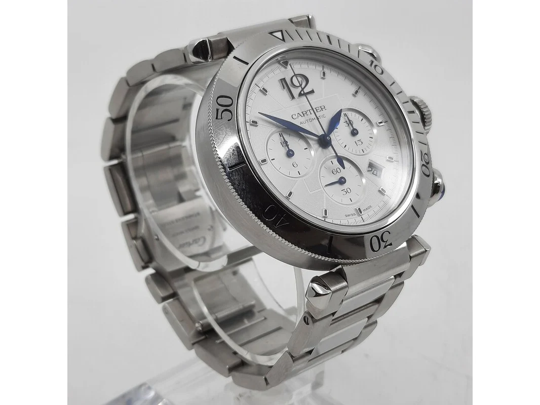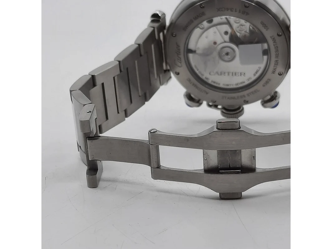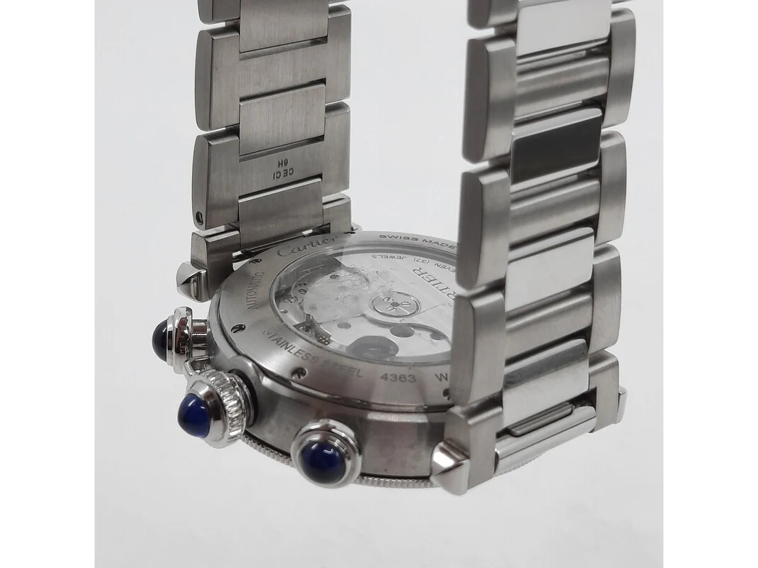 Merk: Cartier Product: Heren polshorloge Conditie: gebruikt Specificaties: Een stalen heren polshorloge, Cartier Pasha Chrono 4363. Aan stalen band. Geen doos en geen certificaat. Inclusief reisetui.