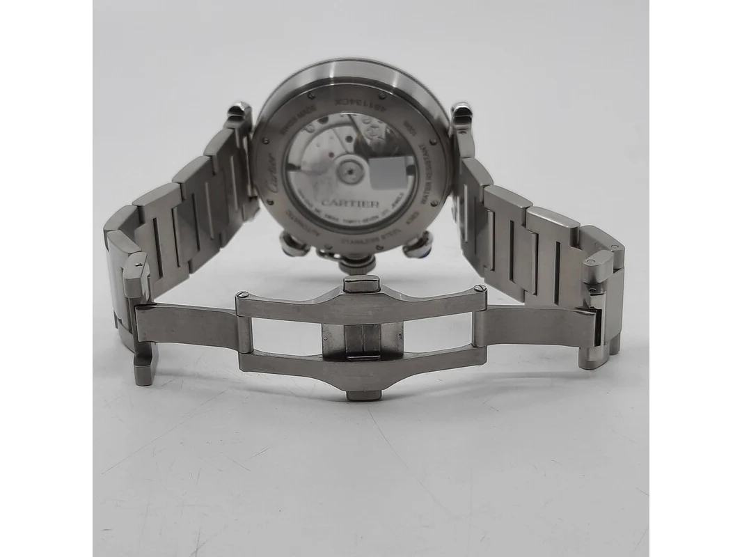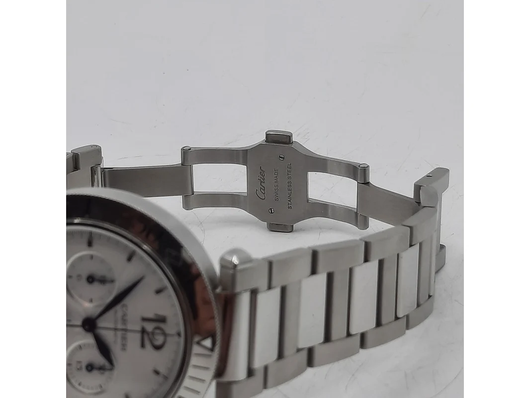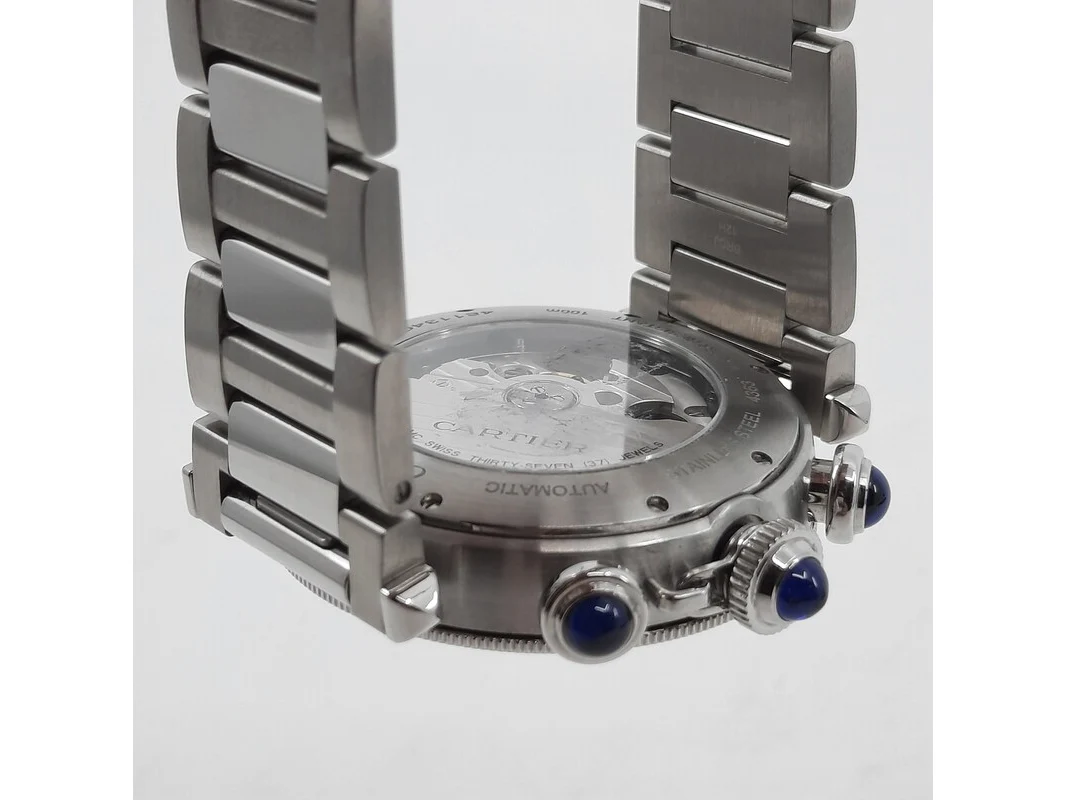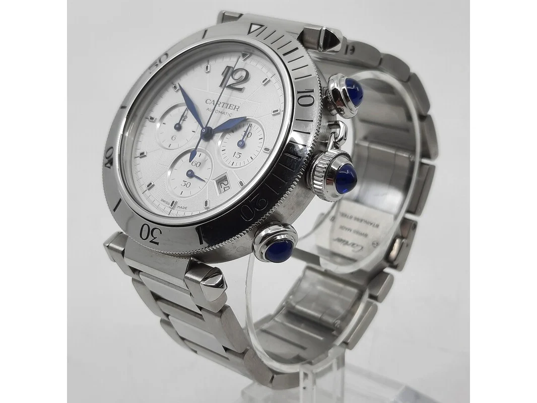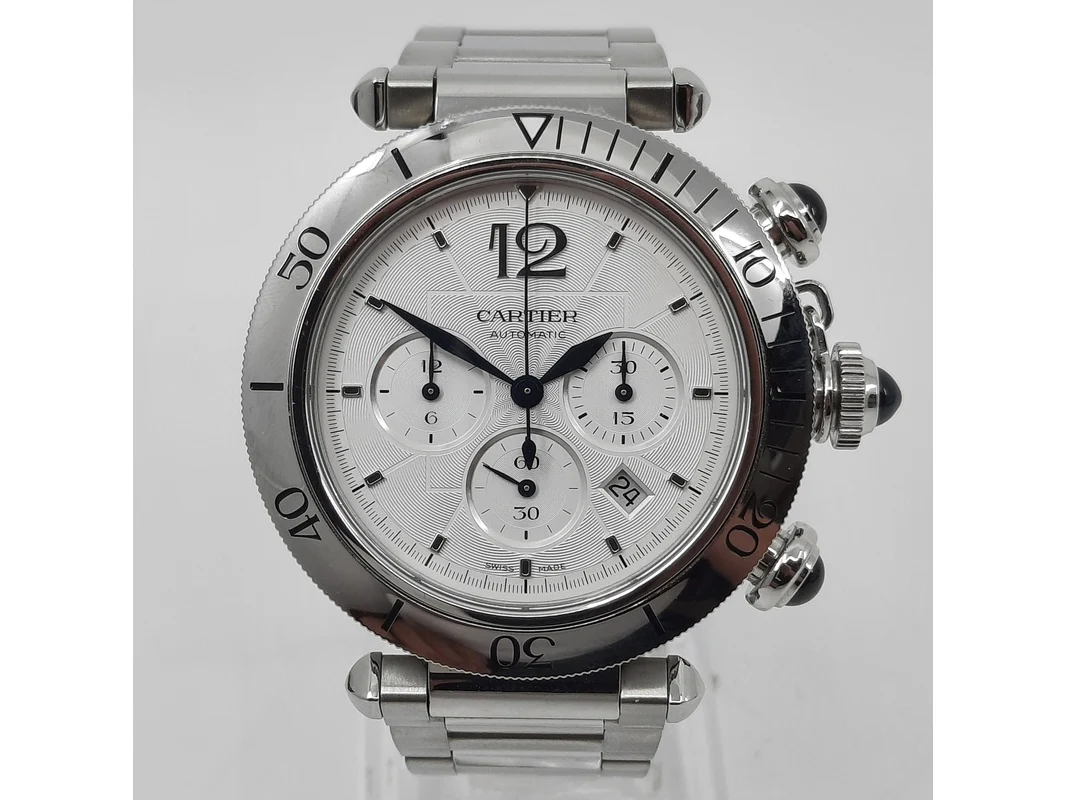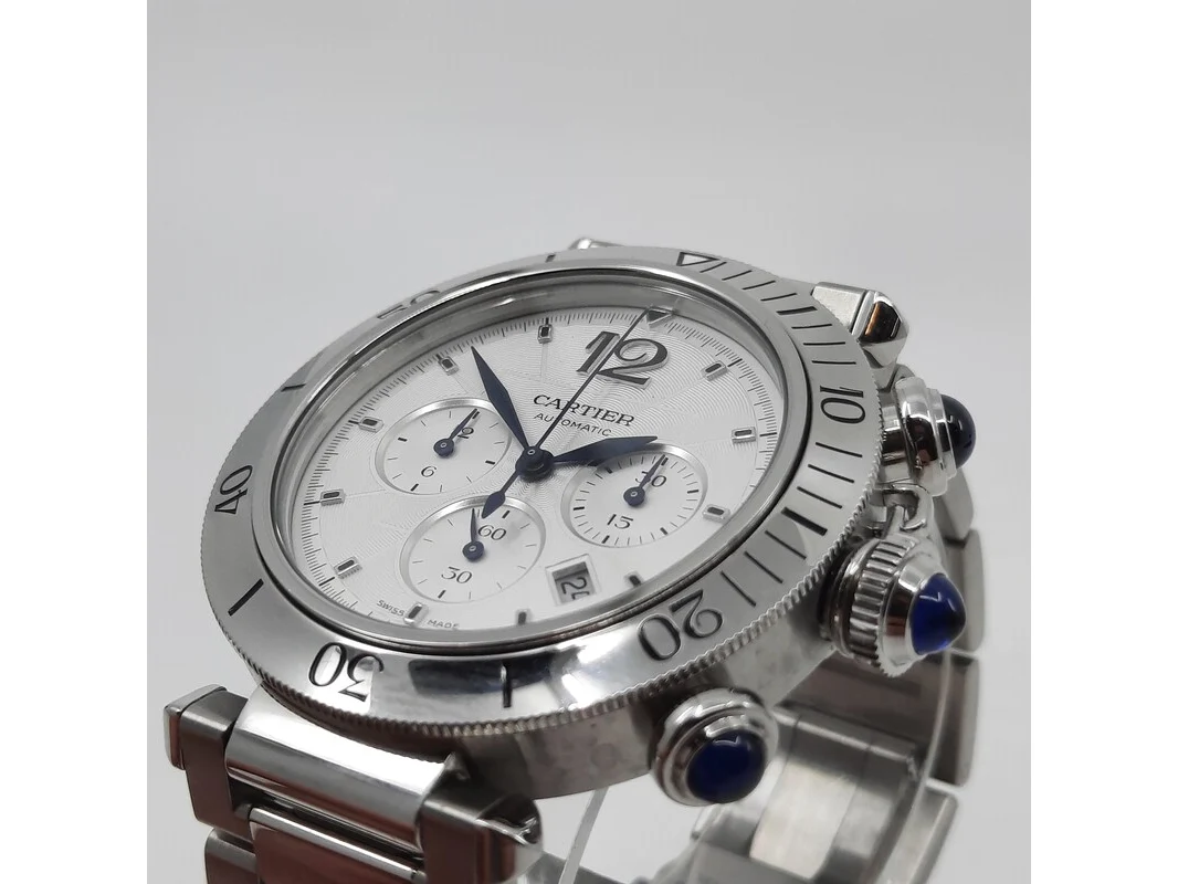 Merk: Cartier Product: Heren polshorloge Conditie: gebruikt Specificaties: Een stalen heren polshorloge, Cartier Pasha Chrono 4363. Aan stalen band. Geen doos en geen certificaat. Inclusief reisetui.