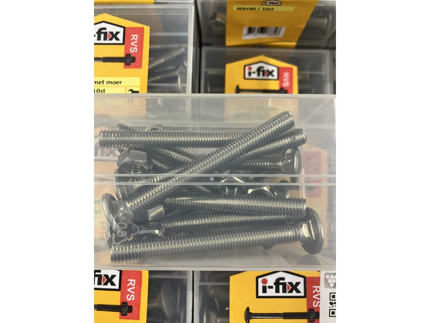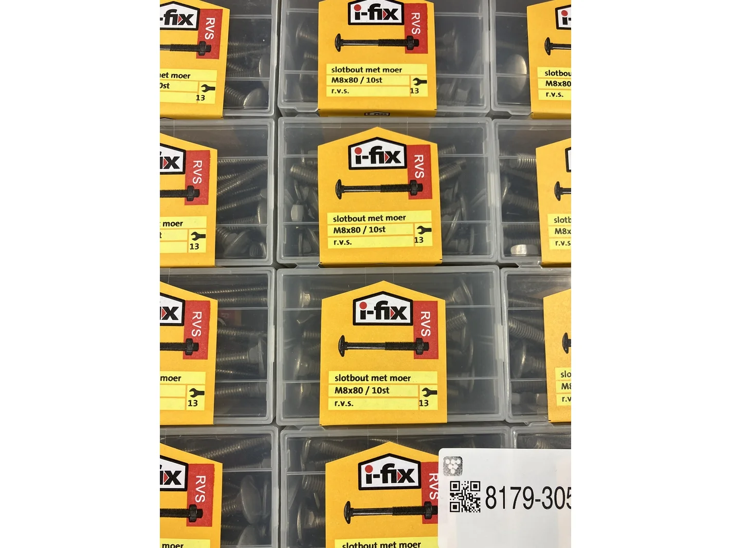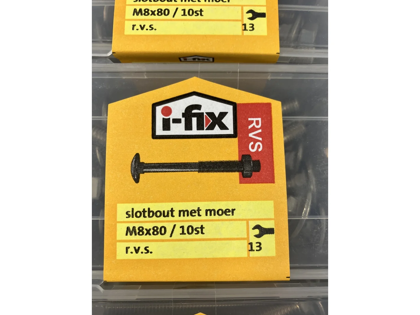 Product: I fix Slotbouten +Moer RVS M8x80 Conditie: nieuw Specificaties: 180 doosjes a 10 st