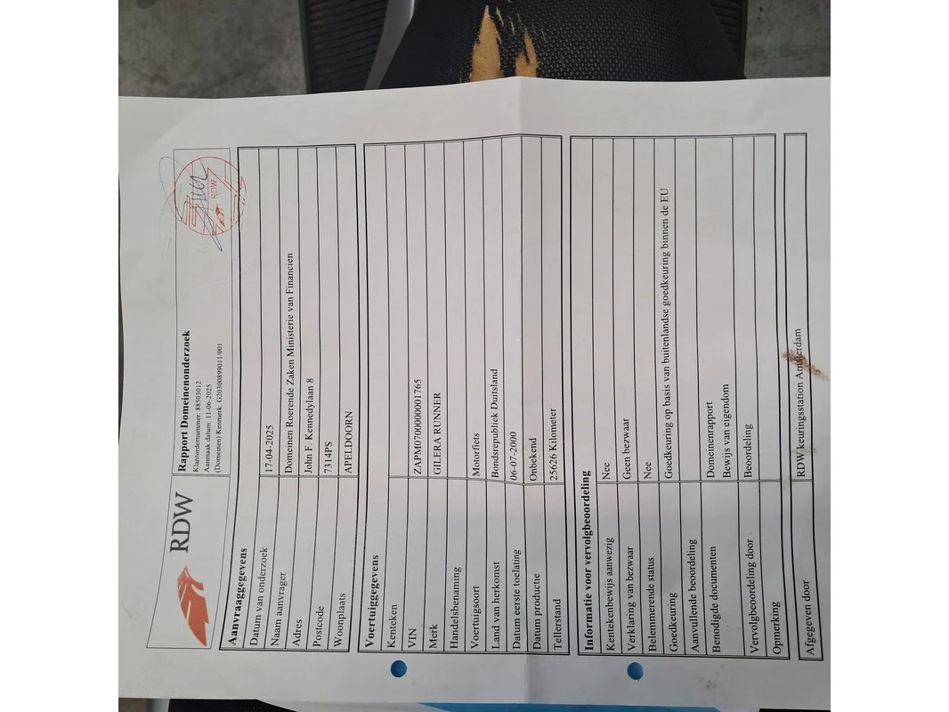 Merk: Gilera Product: Motorscooter Conditie: gebruikt Specificaties: Kenteken: Niet geregistreerd Eerste toelating nationaal: Niet geregistreerd Brandstof: Benzine Afgelezen tellerstand: 25.626 Aantal sleutels: 0 VIN: ZAPM0700000001765 Start: Nee, geen sleutel aanwezig Opties ed Windscherm Bagagerek Waargenomen gebreken Staat op stuurslot Buddyseat kapot Diverse gebruikssporen rondom RDW keuring binnen de EU