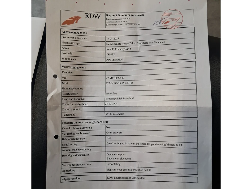Merk: Piaggio Product: Motorscooter Conditie: gebruikt Specificaties: Kenteken: Niet geregistreerd Eerste toelating nationaal: Niet geregistreerd Brandstof: Benzine Afgelezen tellerstand: 14.338 Aantal sleutels: 1 VIN: CSM1T0022542 Start: nee, contactslot stuk Opties ed Bagagerek Waargenomen gebreken Diverse gebruikssporen rondom Kappen rondom zitten los Contactslot stuk Goedkeuring op basis van buitenlandse goedkeuring binnen de EU. Import keuring via rdw.
