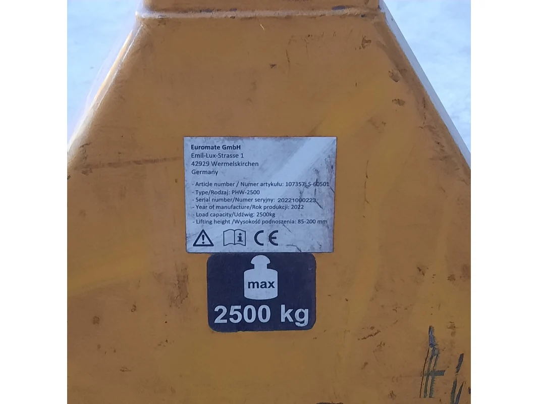 Merk: Euromate Product: Palletwagen Afmeting: Lepellengte ca. 115 cm. BouwJaar: 2022 Conditie: gebruikt Specificaties: Max. 2500 Kg. Bouwjaar: 2022 Heft en zakt