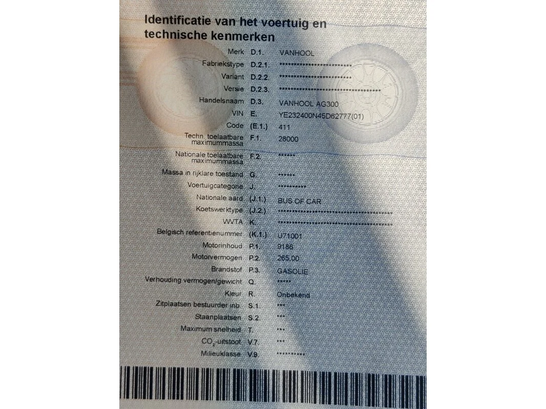 Merk: Van Hool Product: Harmonicabus Afmeting: Lengte ca. 16 meter BouwJaar: 2008 Conditie: gebruikt Specificaties: Kenteken: Niet geregistreerd Merk: Van Hool Productie nummer: 62778 Eerste toelating nationaal: Onbekend Bouwjaar: 2008 APK vervaldatum: Onbekend Brandstof: Gasolie Transmissie: Automaat Afgelezen tellerstand: Onbekend Aantal sleutels: 0 VIN: YE232400N45D62778 Start: Onbekend Massa rijklaar: 17700 kg Opties e.d. Volgens opgave voorzien van motor DAF AG300 Aantal zitplaatsen: 54 +1 Waargenomen gebreken Gebruikerssporen