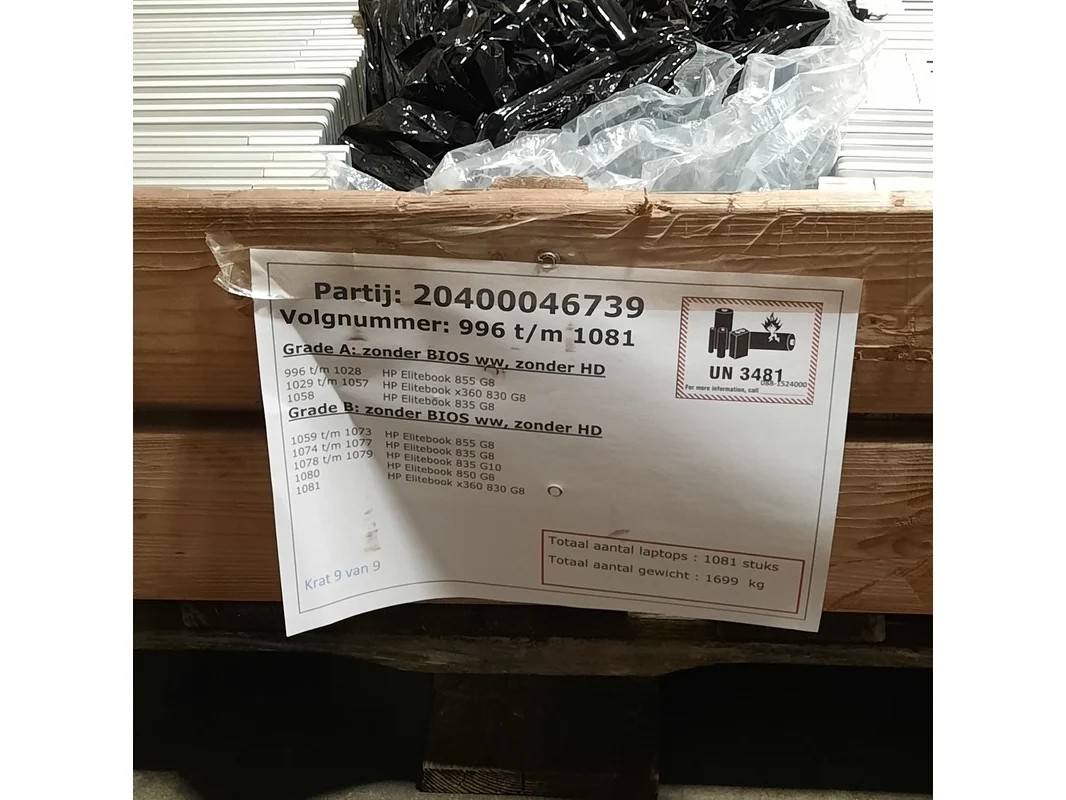 Merk: HP Product: Laptop Conditie: gebruikt Specificaties: Grade A: zonder BIOS ww, zonder HD 996 t/m 1028 HP Elitebook 855 G8 1029 t/m 1057 HP Elitebook x360 830 G8 1058 HP Elitebook 835 G8 Grade B: zonder BIOS ww, zonder HD 1059 t/m 1073 HP Elitebook 855 G8 1074 t/m 1077 HP Elitebook 855 G8 1078 t/m 1079 HP Elitebook 855 G10 1080 HP Elitebook x360 830 G8 1081 HP Elitebook 855 G8