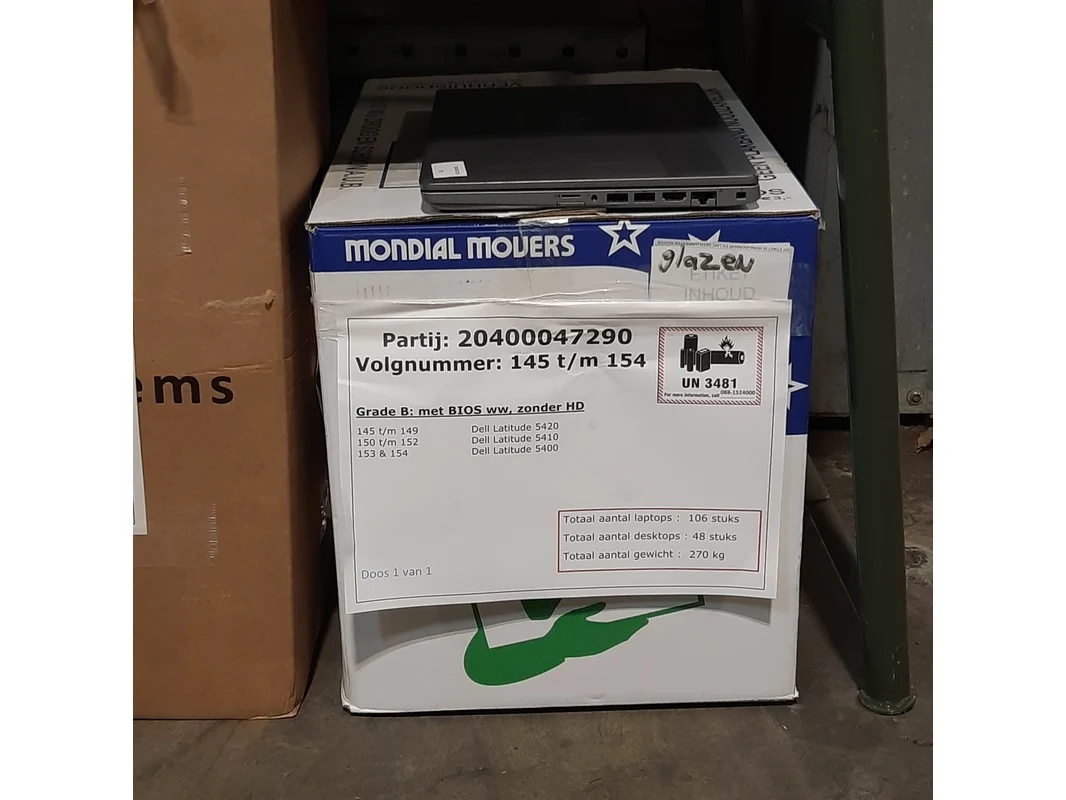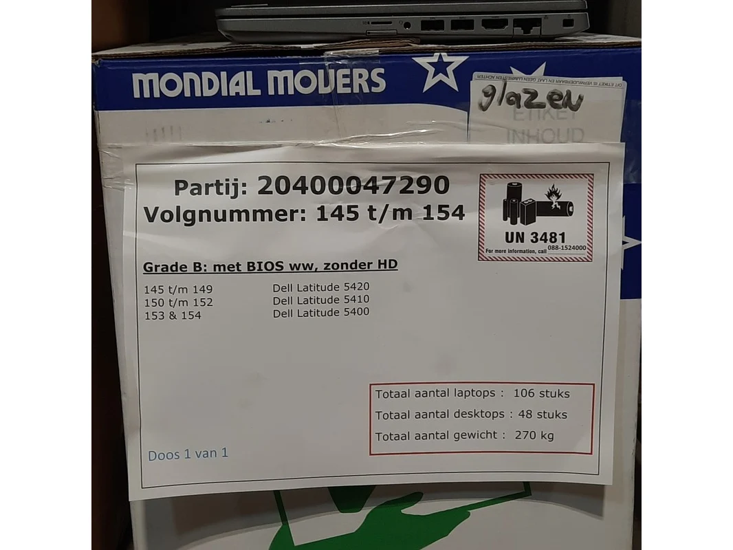 Merk: Dell Product: Laptop Conditie: Gebruikt Specificaties: Grade B: met BIOS ww, zonder HD 145 t/m 149 Dell Latitude 5420 150 t/m 152 Dell Latitude 5410 153 & 154 Dell Latitude 5400