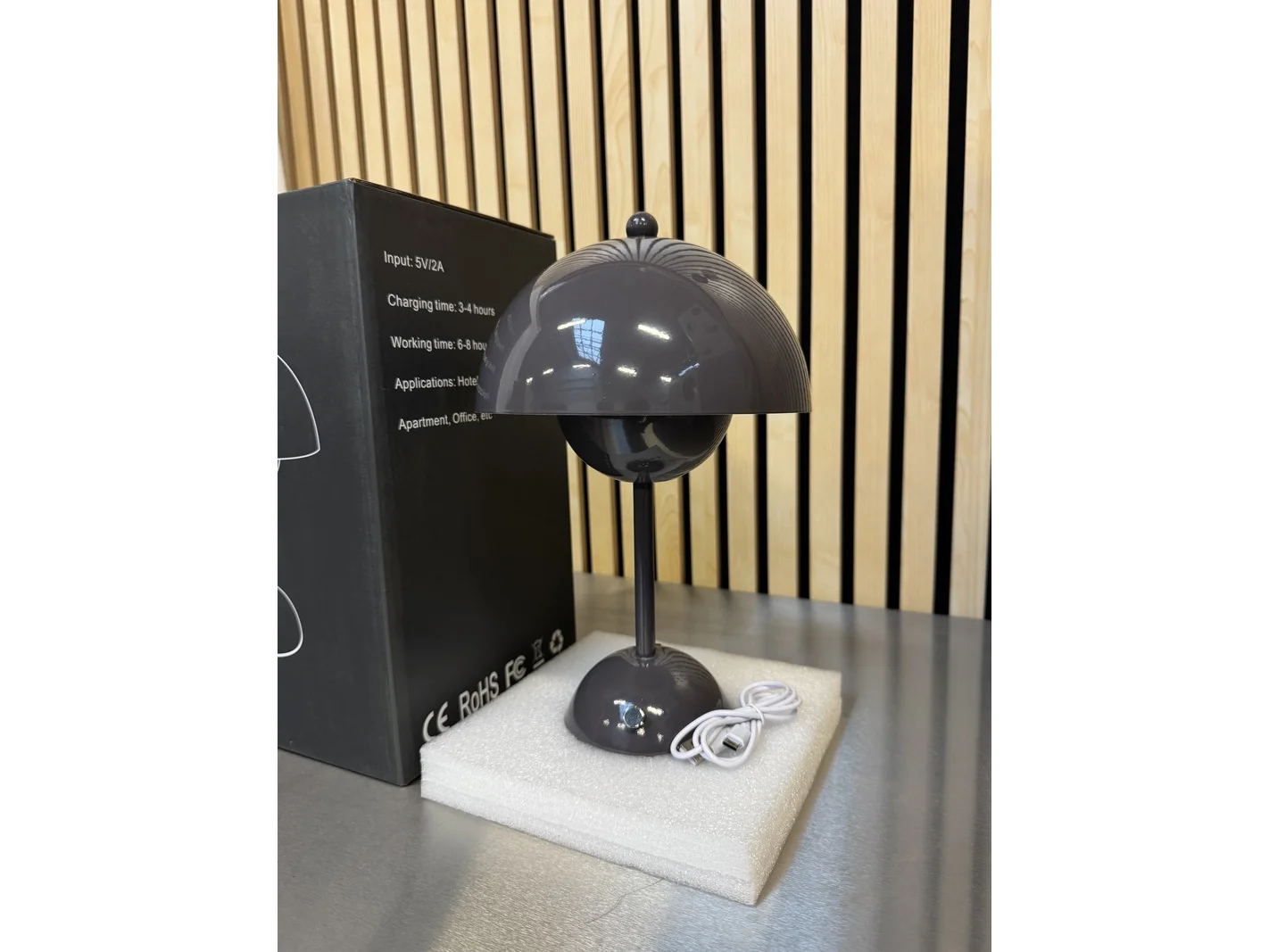Product: Design tafellamp verschillende kleuren wit licht, dimbaar en oplaadbaar usb-c Kleur: dark grey Conditie: nieuw Specificaties: Groot.