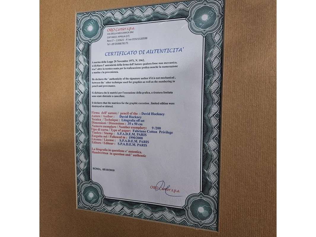 Product: David Hockney lithograaf - ''Rolf Nelson'' - In nieuwe lijst Afmeting: 63cm x 48cm Conditie: Nieuw Specificaties: Limited edition 09/200 Uitgever Oro Cartier, wordt nieuw ingelijst geleverd met een zwart houten frame.
