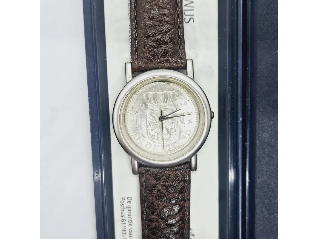 Product: Money Watch - 1 Gulden 1964 Nederland Afmeting: 34mm Conditie: Gebruikt Specificaties: Inclusief doos en garantiebewijs. Kan een nieuwe batterij gebruiken.