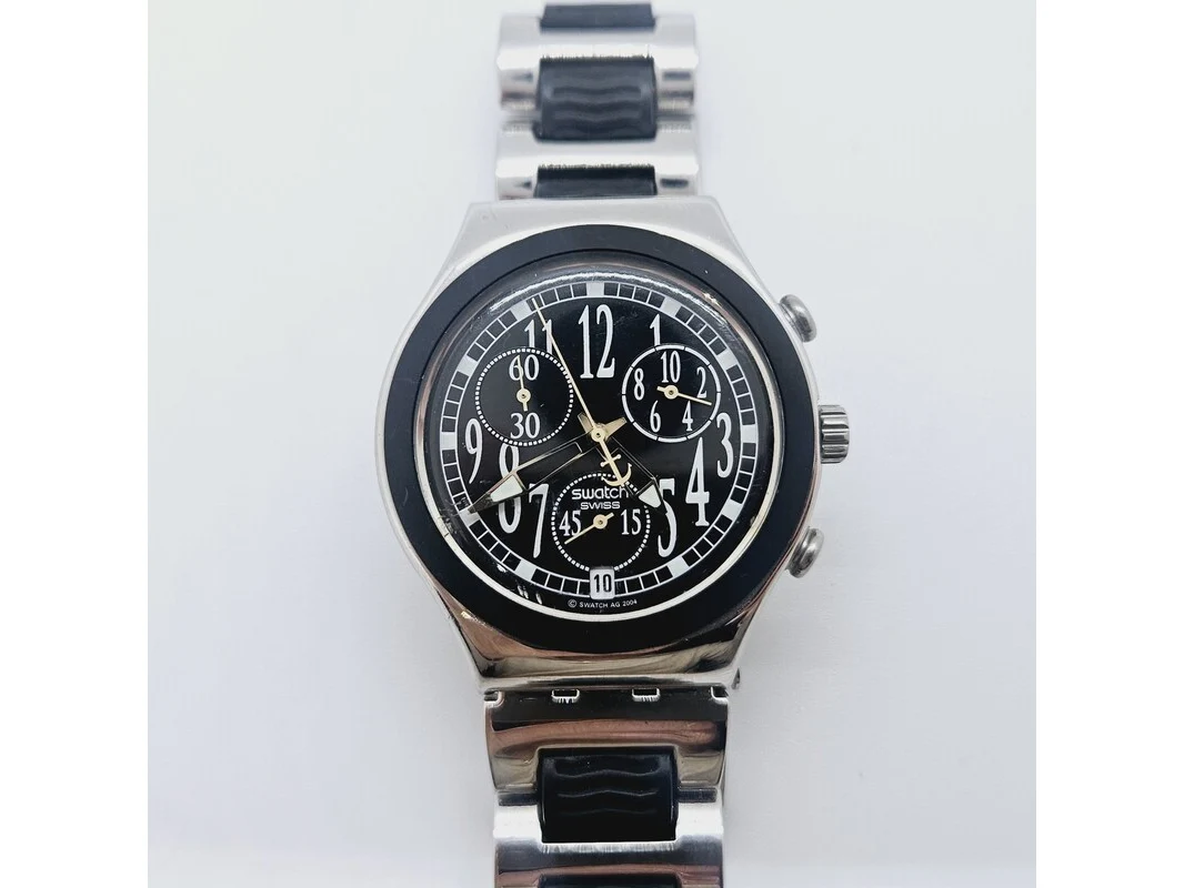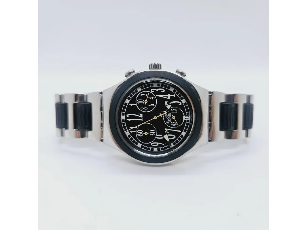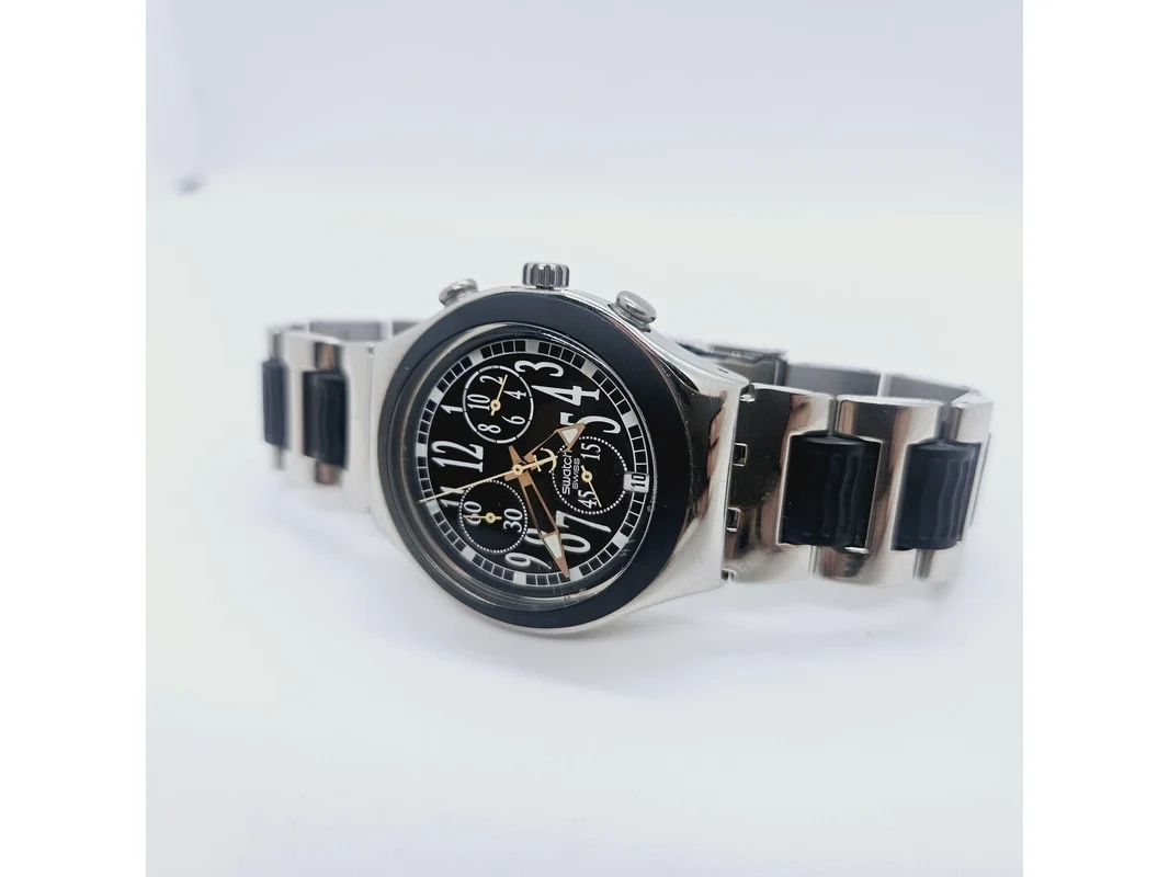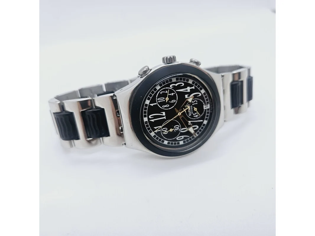 Product: Swatch Irony Army Convoy Black Move herenhorloge Afmeting: 40mm Conditie: Gebruikt Specificaties: Kan een batterijtje gebruiken. Heeft gebruikssporen.