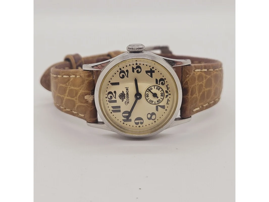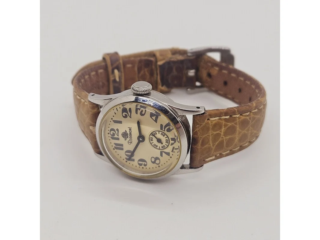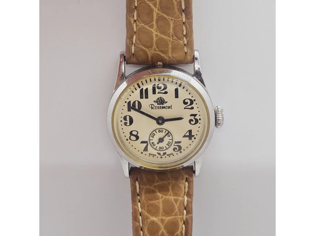 Product: Rosemont Zwitsers horloge met centrale seconde Afmeting: 28mm Conditie: Gebruikt Specificaties: Kan een nieuwe batterij gebruiken. Op een alligator band, heeft gebruikssporen.