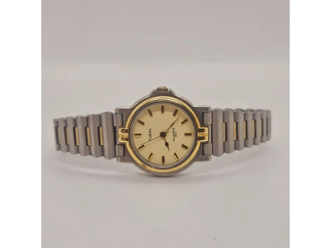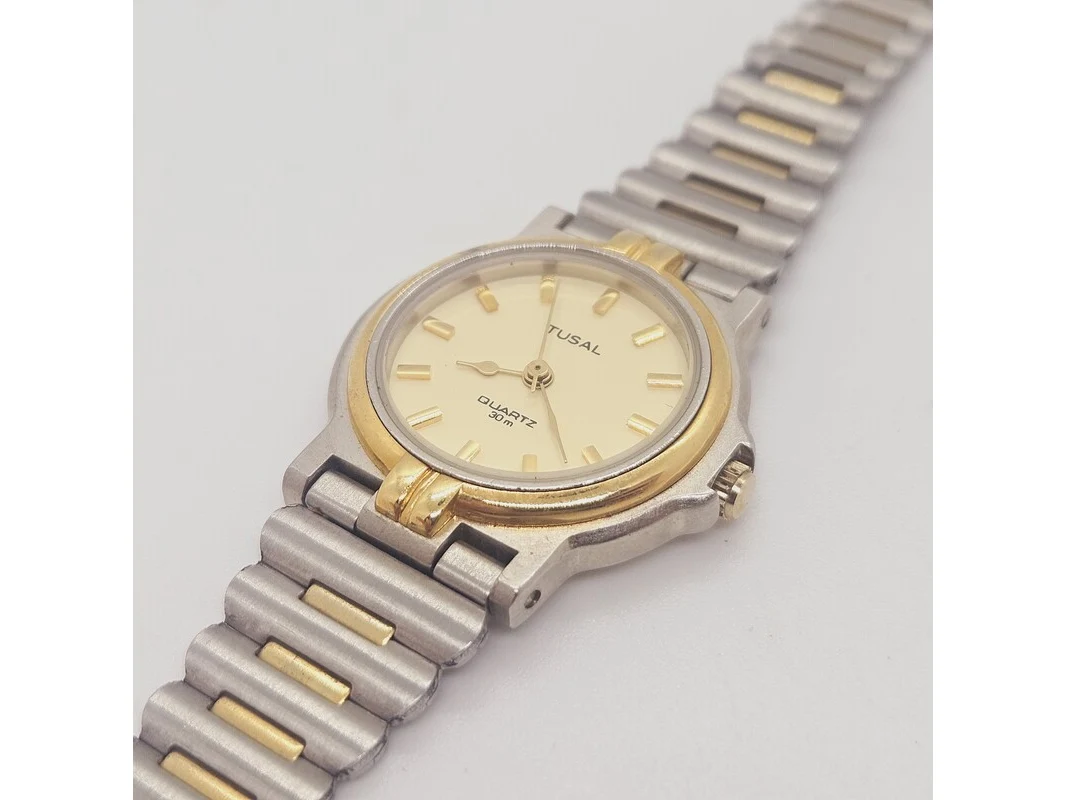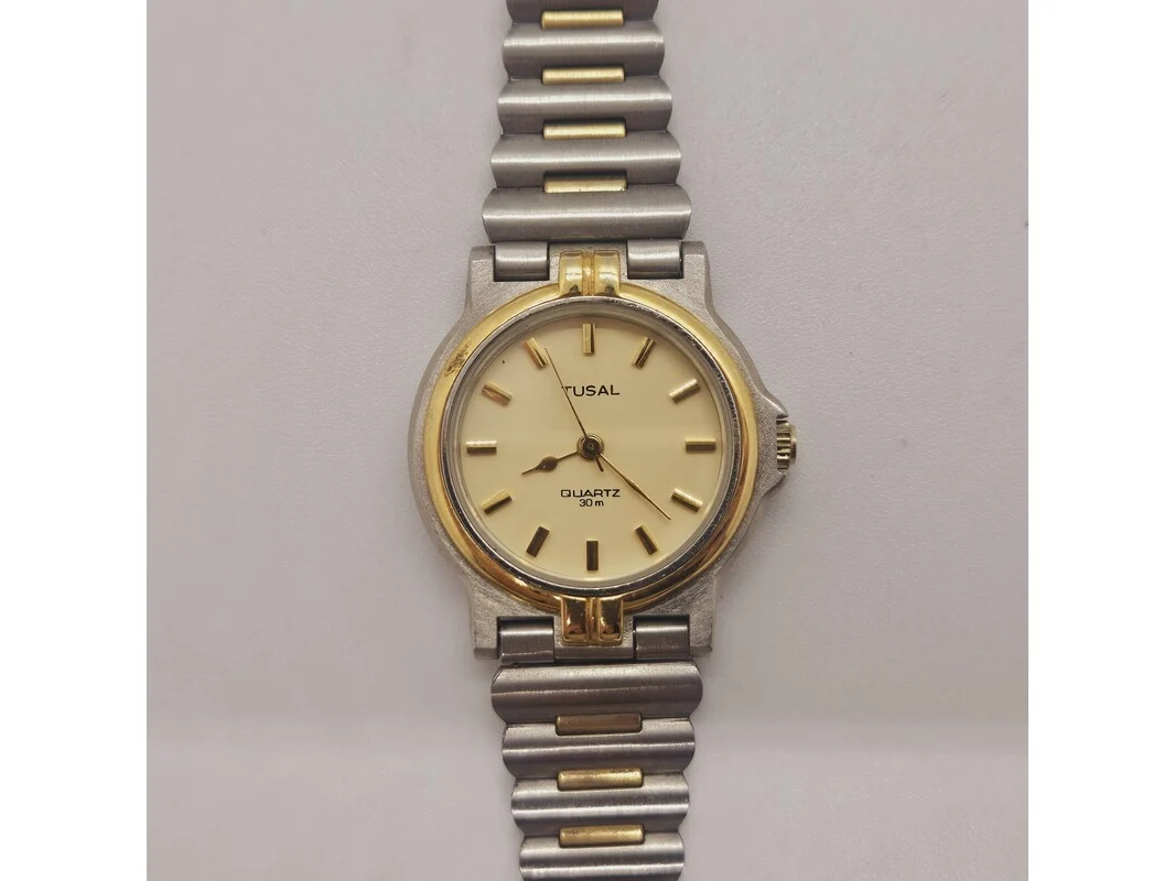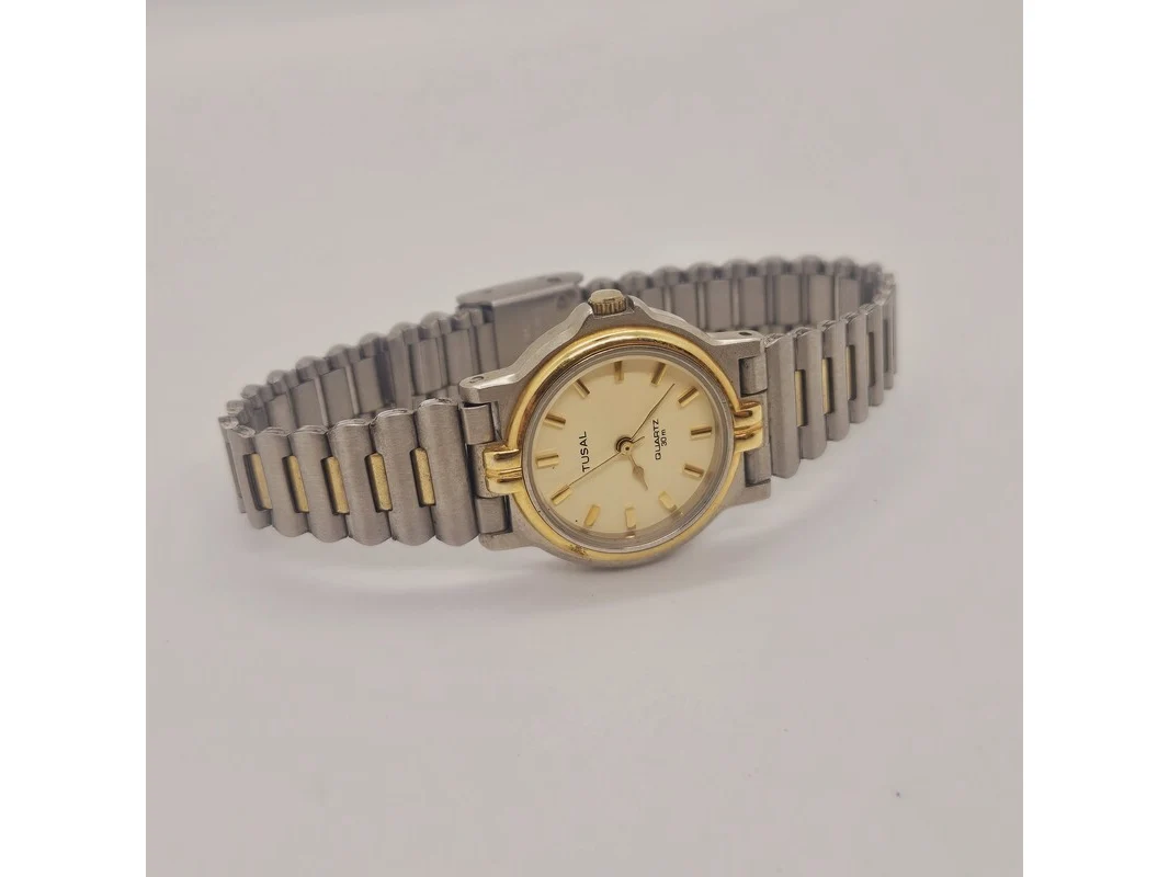 Product: Tusal two tone dameshorloge Afmeting: 27mm Specificaties: Nieuw uit oude voorraad. Kan een nieuwe batterij gebruiken.
