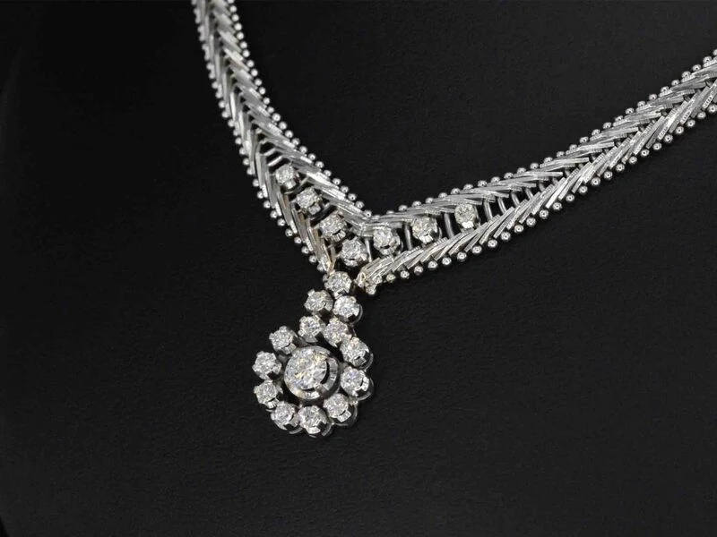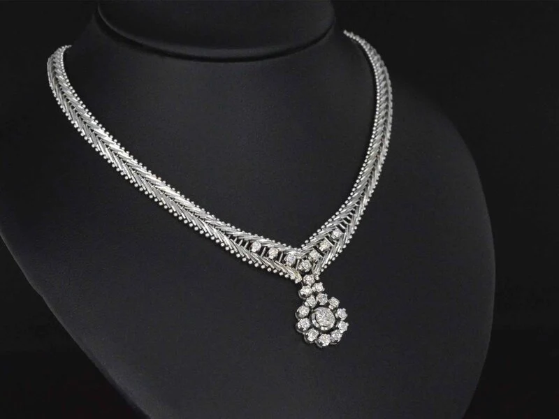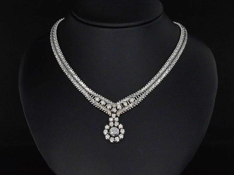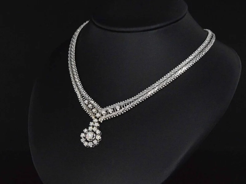 Product: Witgouden collier met diamanten Specificaties: Diamant: Natuurlijk Aantal: 1 stuk Slijpvorm: Briljant geslepen Gewicht (carat): 0.50 carat Kleur: D-E Zuiverheid: VVS Slijpkwaliteit: Zeer mooi Diamant (secundair): Diamanten Aantal diamanten: 20 stuks Slijpvorm: Briljant geslepen Gewicht (carat): 1.00 carat Kleur: D-E Zuiverheid: VVS Slijpkwaliteit: Very good Juweel: Collier Gewicht: 43.8 gram Afmetingen/lengte: 44 cm Materiaal: 14k goud (585) Conditie: Zo goed als nieuw Verpakking: Luxe sieradendoos Toelichting: De kwaliteit is overgenomen van het rapport behorend bij item. De waardebepaling is een beoordeling van een gecertificeerde diamantair, gebaseerd op consumentenprijzen. Consumentenprijs: € 23.888,-