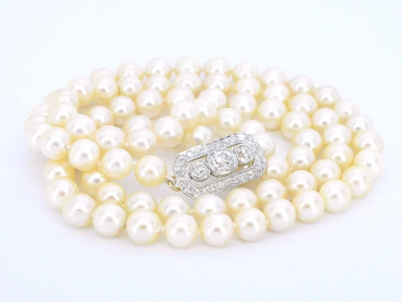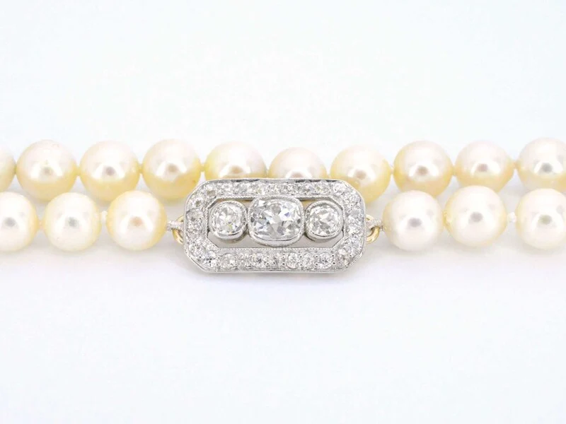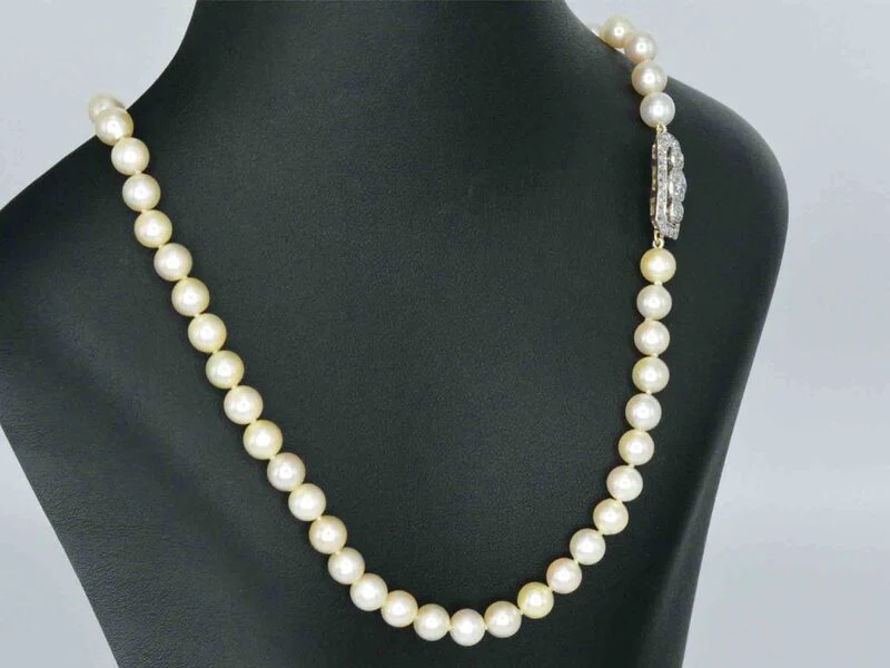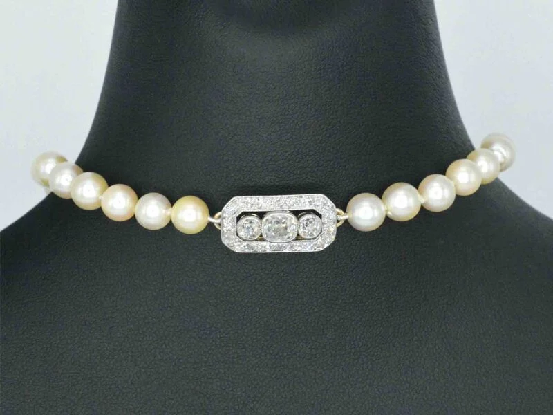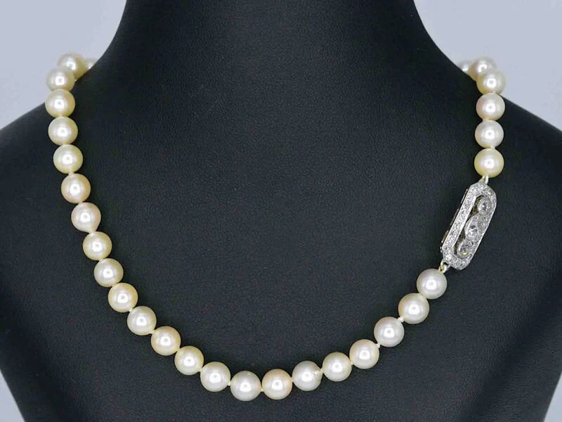 Product: Parelsnoer met diamanten art deco sluiting Specificaties: Diamant: Natuurlijk Slijpvorm: Briljant geslepen Gewicht (carat): 2.00 carat Kleur: F-G Zuiverheid: VS-SI+ Slijpkwaliteit: Slijpkwalitiet: Zeer mooi Parel: Echte parels Afmeting: 6.5 - 7 mm Juweel: Collier Gewicht: 40.4 gram Afmetingen/lengte: 60 cm Materiaal: Goud Conditie: Vintage Verpakking: Luxe sieradendoos Toelichting: De kwaliteit is overgenomen van het rapport behorend bij item. De waardebepaling is een beoordeling van een gecertificeerde diamantair, gebaseerd op consumentenprijzen. Consumentenprijs: € 20.000,-