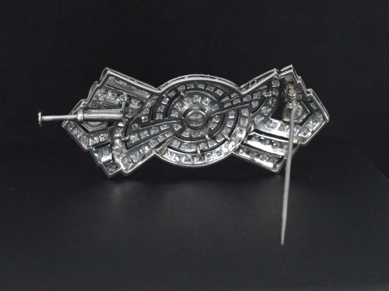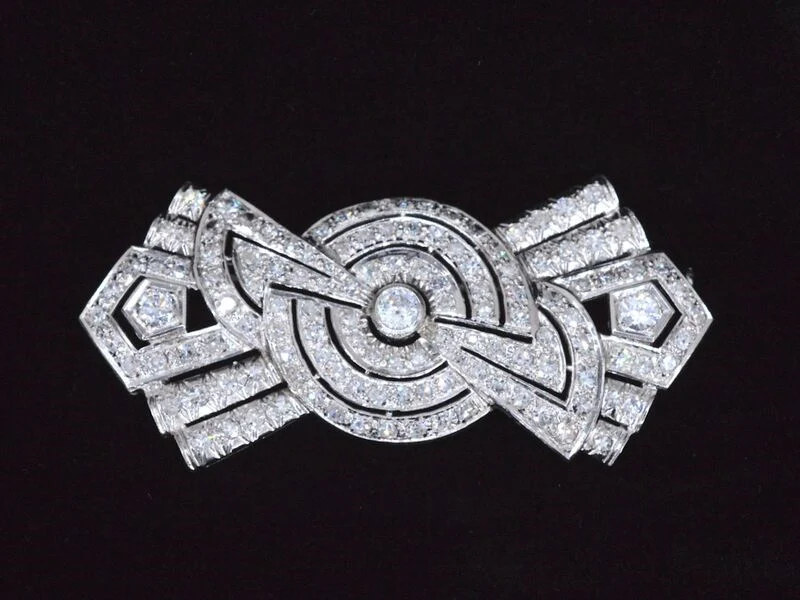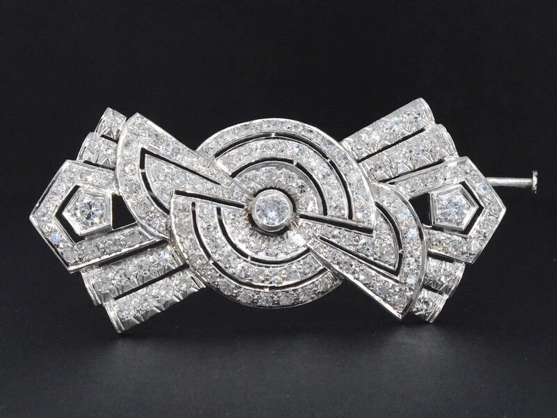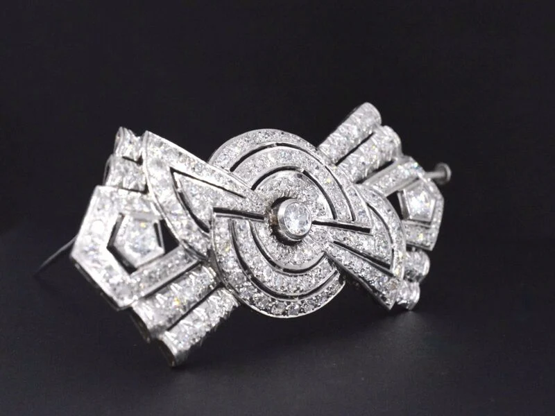 Product: Platina broche met diamanten Specificaties: Diamant: Natuurlijk Slijpvorm: Swiss geslepen Gewicht (carat): 5.00 carat Kleur: F Zuiverheid: VS-SI Juweel: Broche Gewicht: 13 gram Afmetingen/lengte: 60x28 mm Materiaal: Platina Conditie: Vintage Verpakking: Luxe sieradendoos Toelichting: De kwaliteit is overgenomen van het rapport behorend bij item. De waardebepaling is een beoordeling van een gecertificeerde diamantair, gebaseerd op consumentenprijzen. Consumentenprijs: € 21.000,-
