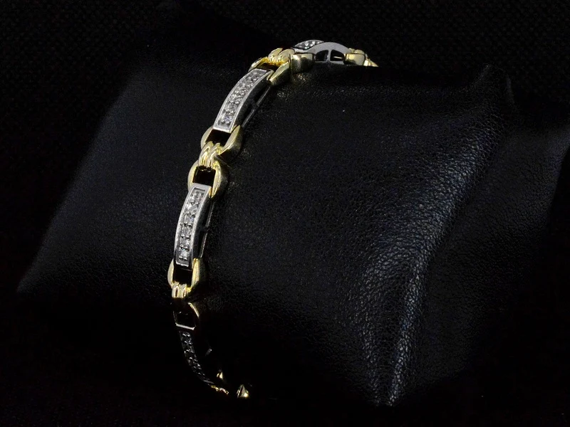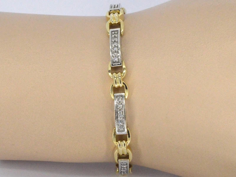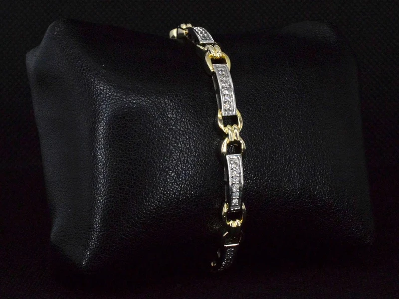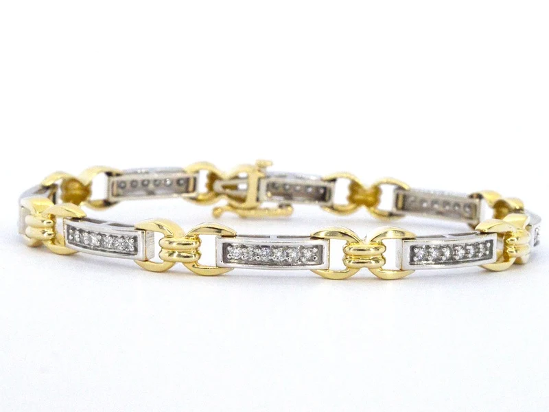 Product: Bi-colour gouden schakelarmband met natuurlijke diamanten Specificaties: Diamant: Natuurlijk Aantal: 48 stuks Slijpvorm: Briljant geslepen Gewicht (carat): 1.00 carat Kleur: F-G Zuiverheid: VS-SI Slijpkwaliteit: Zeer mooi Juweel: Armband Gewicht: 15.7 gram Afmetingen/lengte: 18 cm Materiaal: 14k goud (585) Conditie: Zo goed als nieuw Verpakking: Luxe sieradendoos Toelichting: De kwaliteit is overgenomen van het rapport behorend bij item. De waardebepaling is een beoordeling van een gecertificeerde diamantair, gebaseerd op consumentenprijzen. Consumentenprijs: € 10.500,-