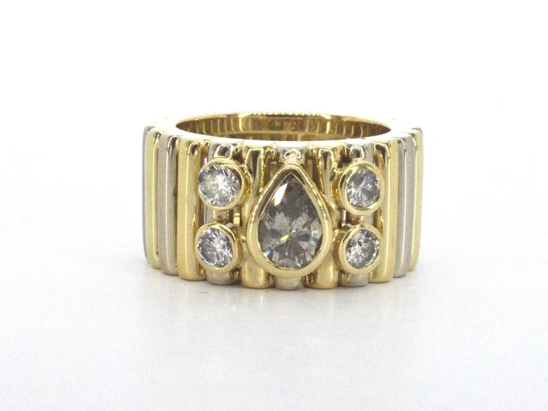 Product: Brede gouden ring met een natuurlijke cognac gekleurde druppel vorm diamant en briljant geslepen diamanten Specificaties: Diamant: Natuurlijk Aantal: 1 stuk Slijpvorm: Peer geslepen Gewicht (carat): 0.60 carat Kleur: Fancy cognac Zuiverheid: VS Diamant (secundair): Natuurlijk Aantal diamanten: 4 stuks Slijpvorm: Briljant geslepen Gewicht (carat): 0.50 carat Kleur: F-G Zuiverheid: SI-P Juweel: Ring Gewicht: 10.8 gram Ringmaat (op maat gemaakt*): 49.5 (5.75 mm) Materiaal: 14K goud (585) Conditie: Zo goed als nieuw Verpakking: Luxe sieradendoos Toelichting: De kwaliteit is overgenomen van het rapport behorend bij item. De waardebepaling is een beoordeling van een gecertificeerde diamantair, gebaseerd op consumentenprijzen. Consumentenprijs: € 9.100,-