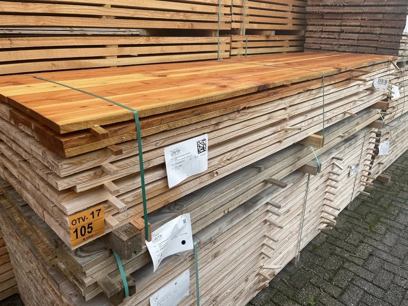 Product: Douglas planken fijnbezaagd Materiaal: Douglas Afmeting: 22x200mm, lengte 300cm Conditie: nieuw