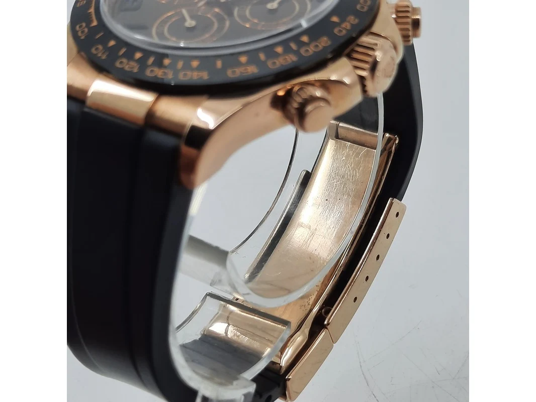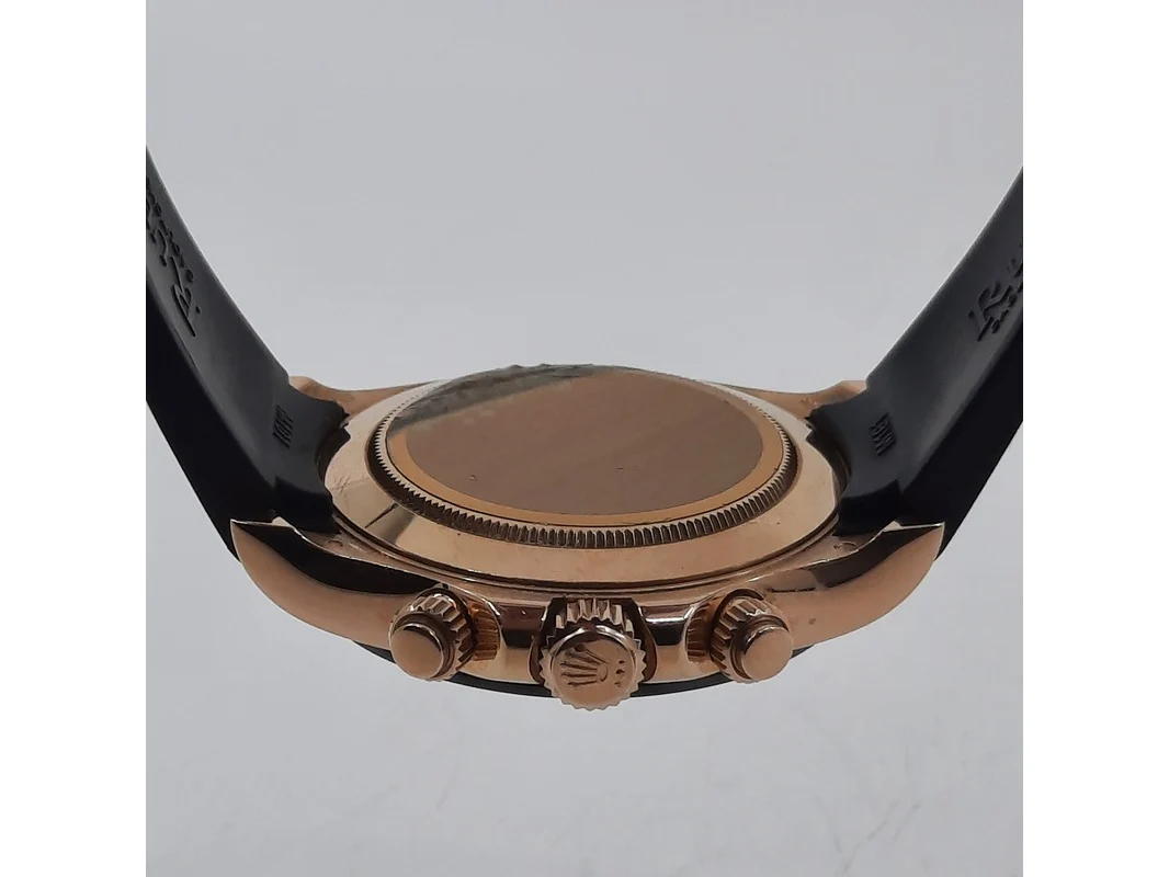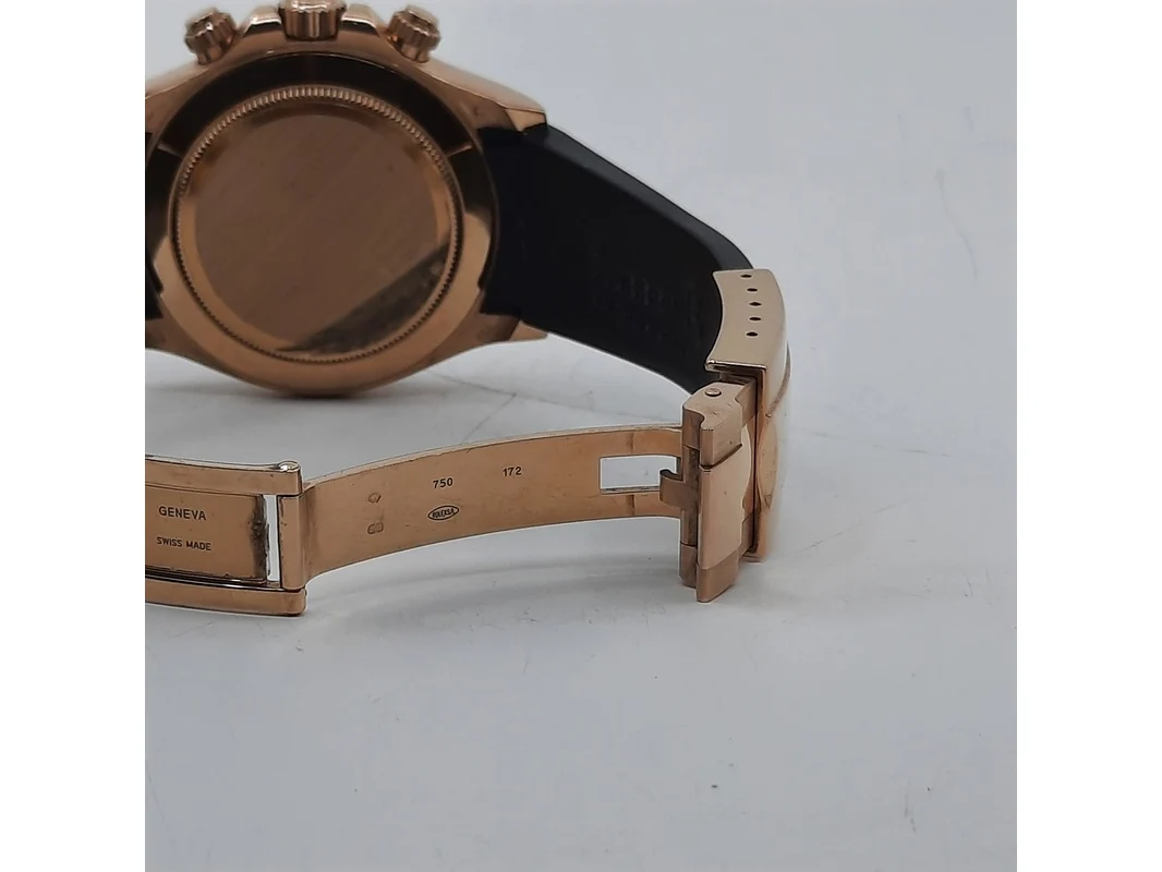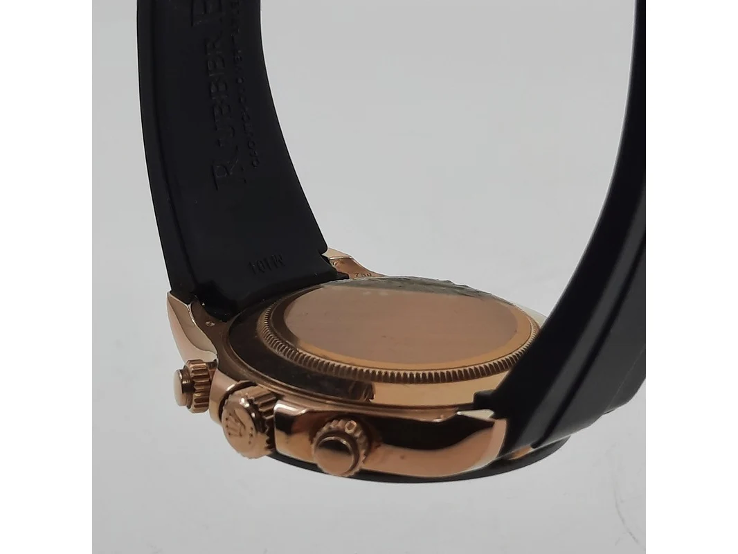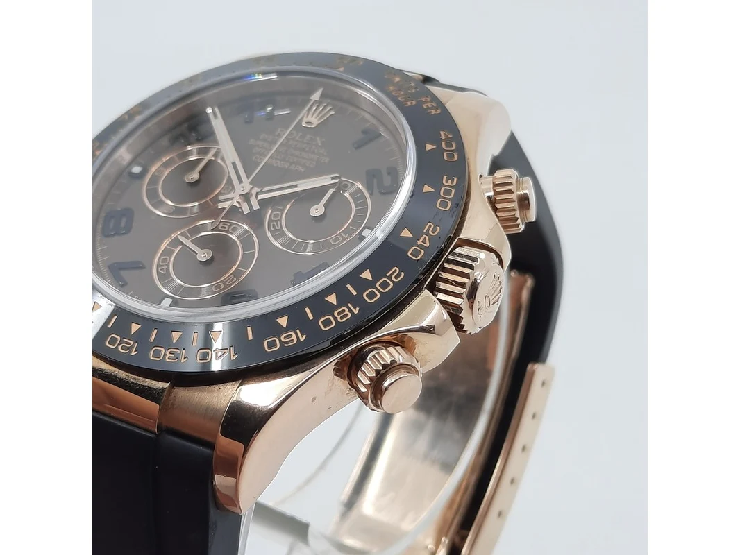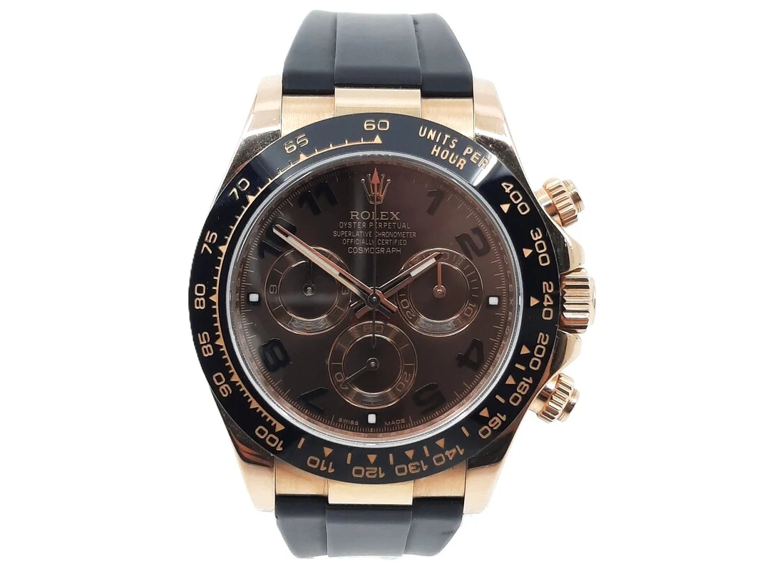 Merk: Rolex Product: Heren polshorloge Conditie: Gebruikt Specificaties: Een 18 karaats rosegouden heren polshorloge, Rolex Daytona 116515LN. Met zwarte keramische lunet met tachymeterindex, bruine wijzerplaat, drie registers, Arabische index, automatisch uurwerk, kaliber 4130 en rubberen band met rosegouden vouwsluiting. Genummerd 172. Geen doos, inclusief certificaat.
