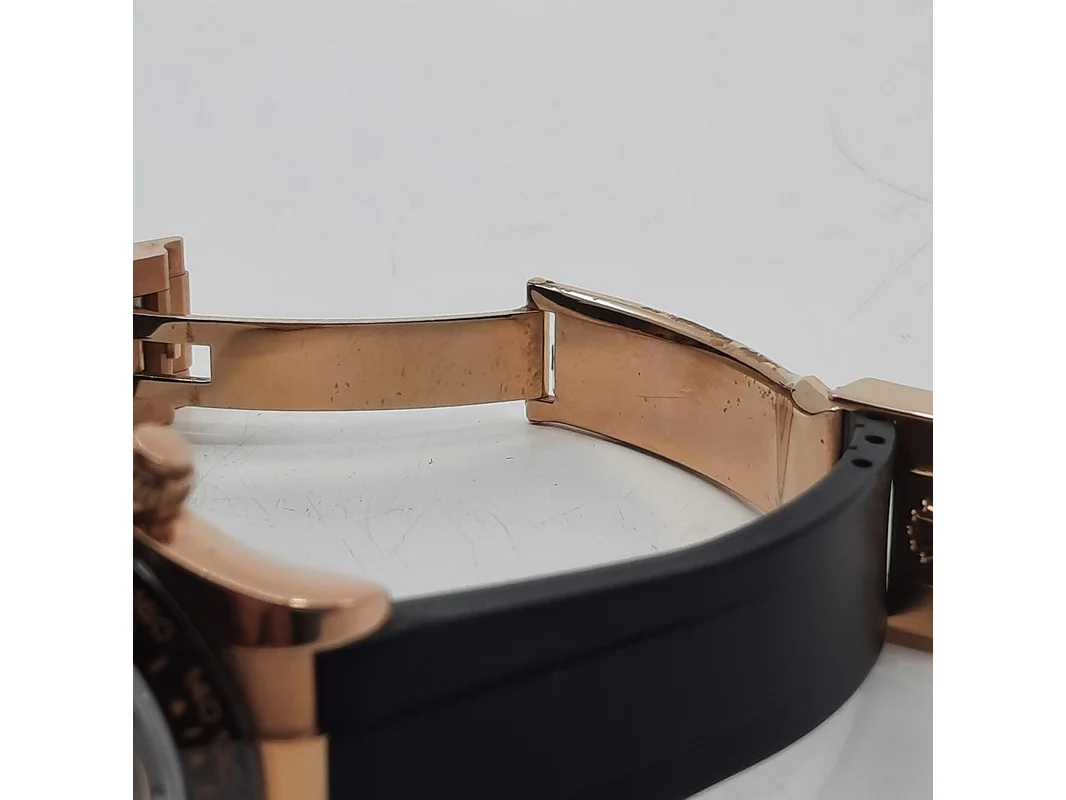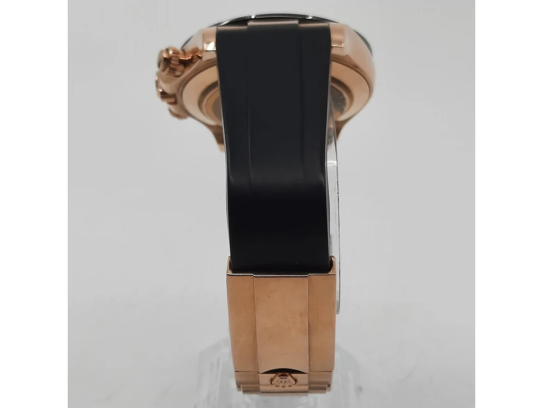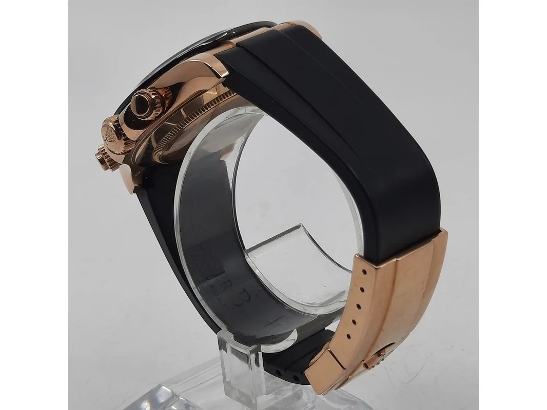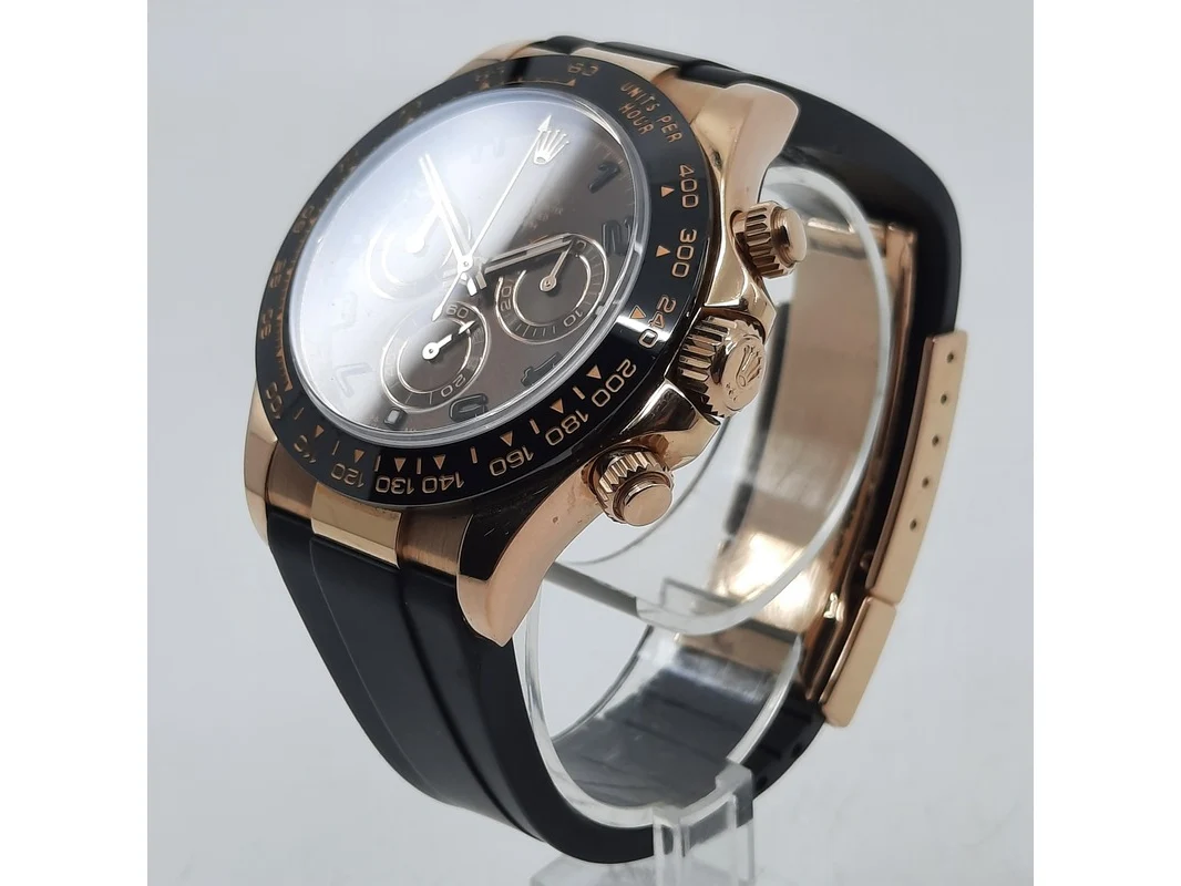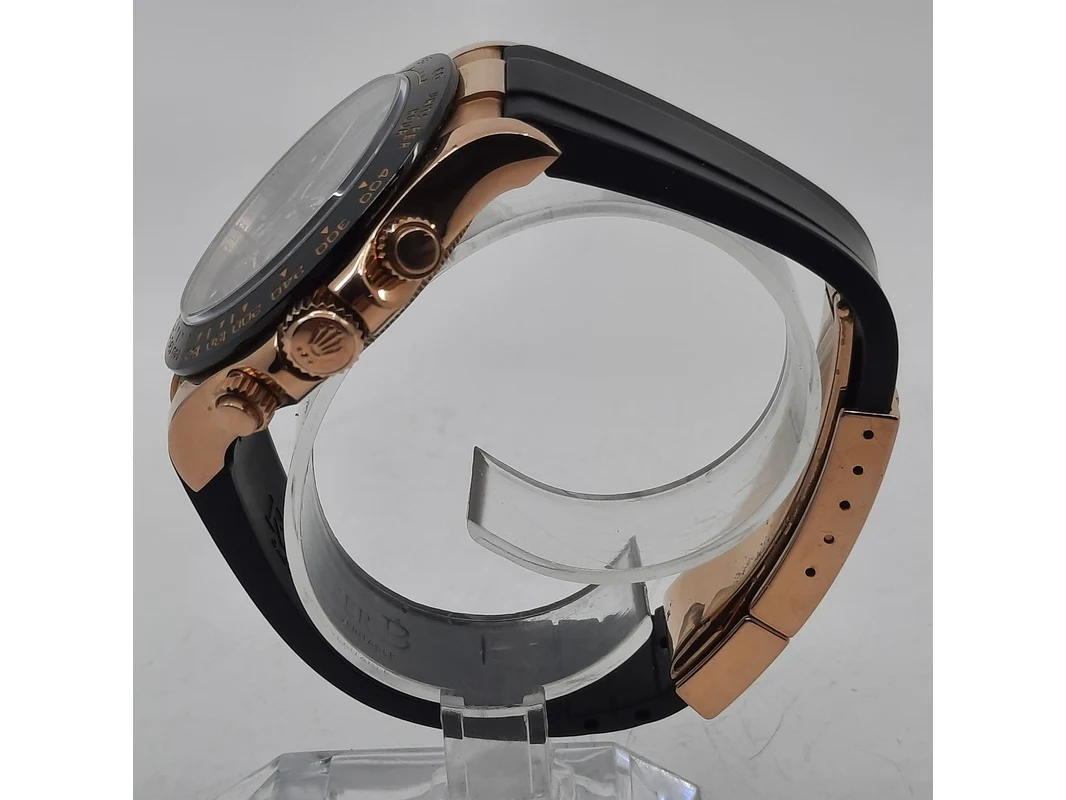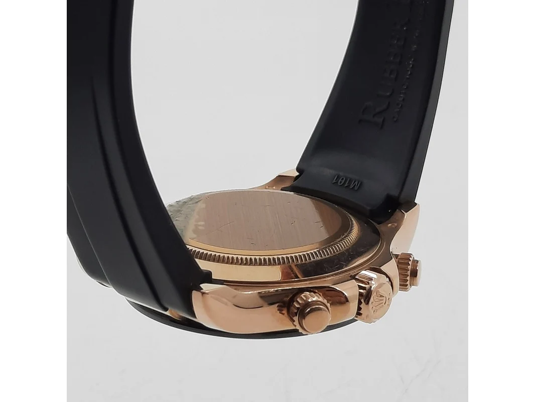 Merk: Rolex Product: Heren polshorloge Conditie: Gebruikt Specificaties: Een 18 karaats rosegouden heren polshorloge, Rolex Daytona 116515LN. Met zwarte keramische lunet met tachymeterindex, bruine wijzerplaat, drie registers, Arabische index, automatisch uurwerk, kaliber 4130 en rubberen band met rosegouden vouwsluiting. Genummerd 172. Geen doos, inclusief certificaat.