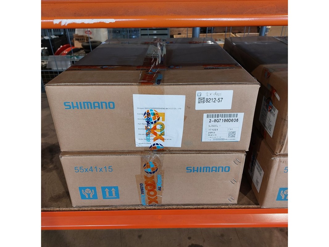 Merk: Shimano Product: Gripshifter Kleur: Zwart Materiaal: Kunststof Afmeting: Gewicht / stuk: 175 g Conditie: Nieuw Specificaties: 2 dozen @ ca. 25 stuks Shimano Nexus 3 gripshifter 3 versnellingen incl kabel. Afmetingen per doos: 550 x 410 x 150 mm.