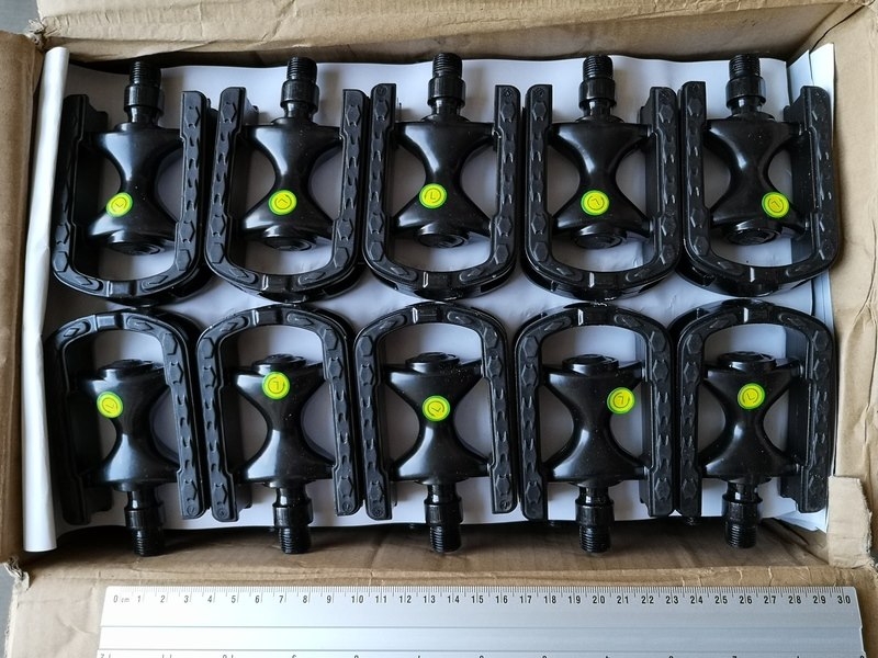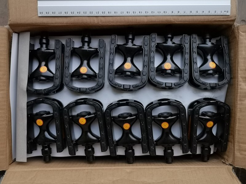 Product: Fietstrappers Afmeting: 232 Gram Conditie: Nieuw Specificaties: Gewicht / stuk : 232 g (464 g / paar) 1 doos @ 100 stuks linkse pedaal + 1 doos @ 100 stuks rechtse pedaal Afmetingen doos: 380 x 290 x 250mm.