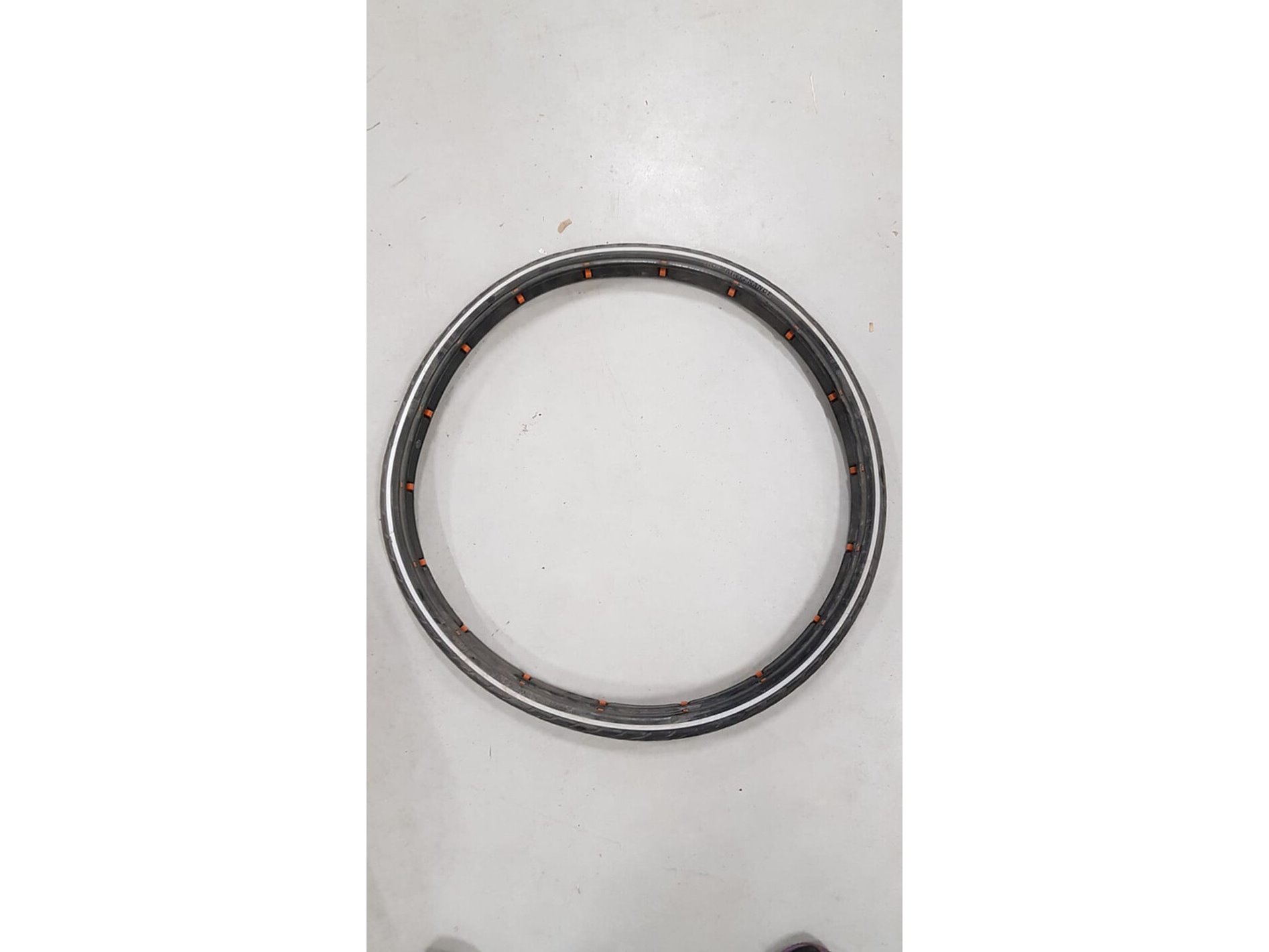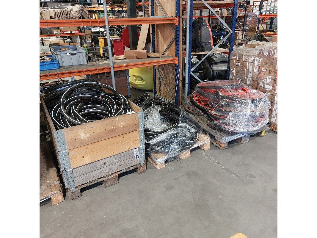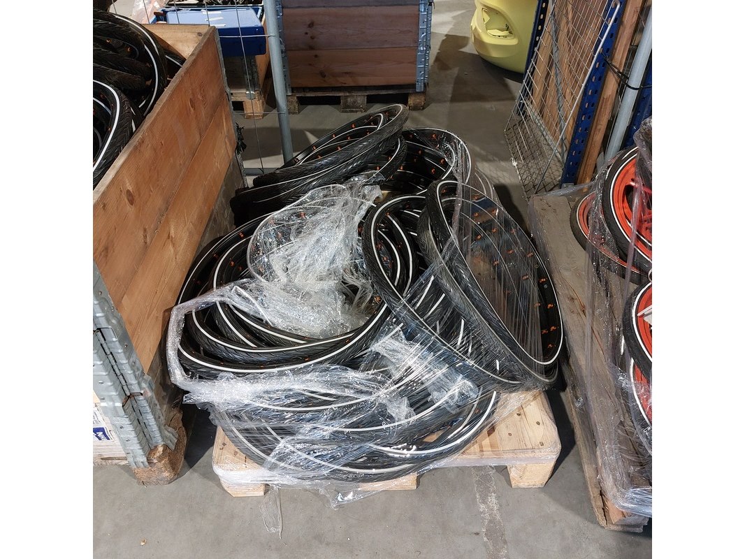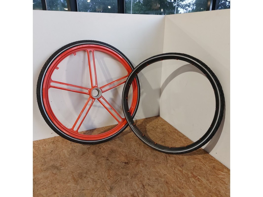 Product: Combinatie alu fietswielen + lekvrije banden 22" Kleur: Oranje + zwart Materiaal: Massief aluminium + rubber-kunststof legering Afmeting: Gewicht / stuk : 3100 g Conditie: Nieuw Specificaties: 2 pallets lekvrije banden 22 inch x 102 stuks + 1 pallet massief aluminium wielen met lekvrije band 22 inch x 20 stuks. Gewicht massief aluminium fietswiel 3,1 kg per stuk incl band 22 inch.
