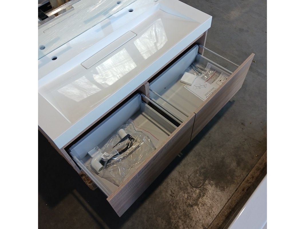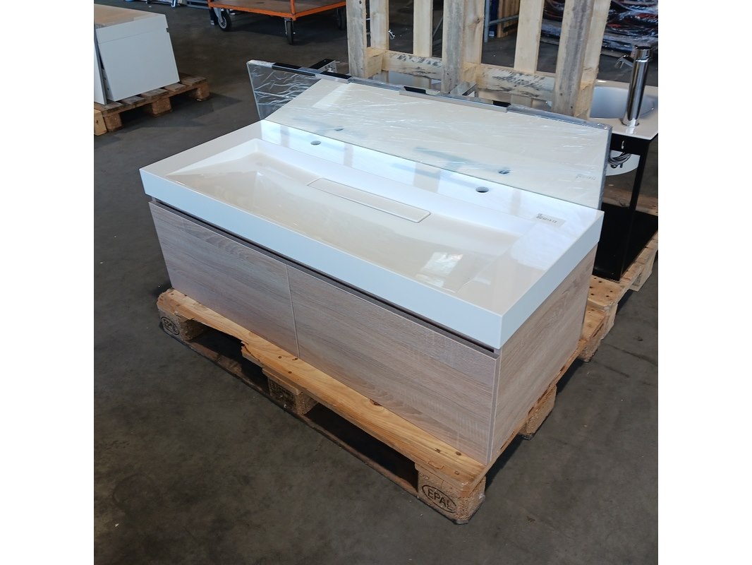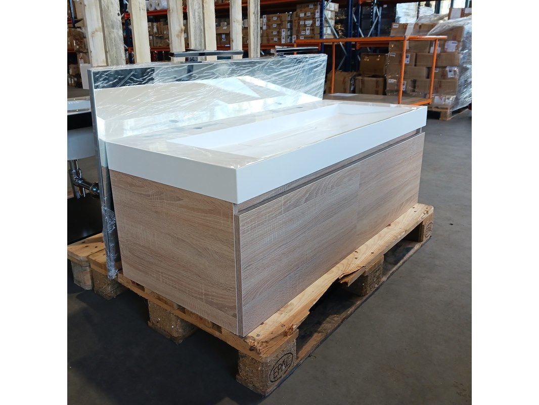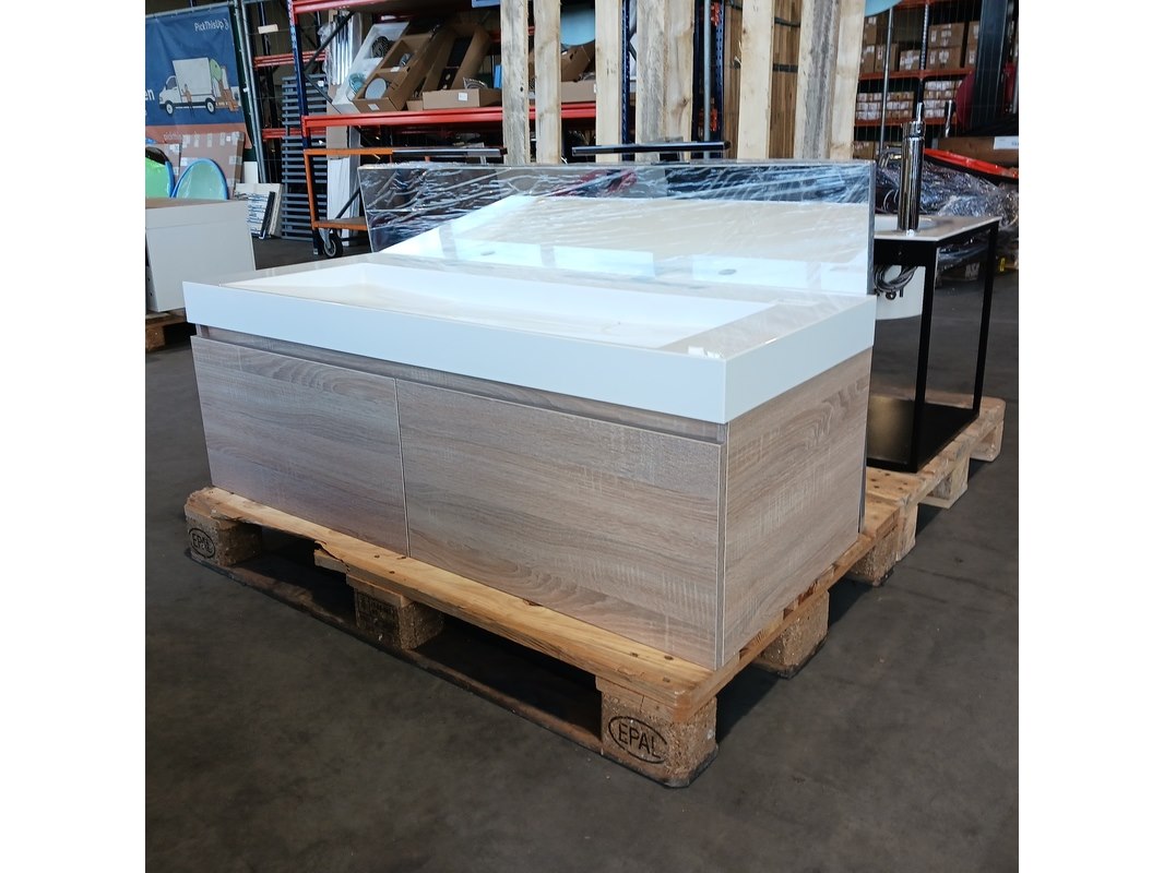 Merk: Blum Product: Badmeubel Kleur: Natuur eiken Afmeting: 120x50cm Specificaties: Lades met softclose, Blum lade geleiders, polybeton wastafel, verdekte afvoer, 2 kraangaten, spiegel, 120x65cm, met 2x verlichting