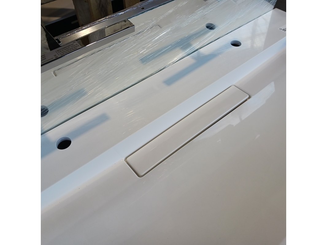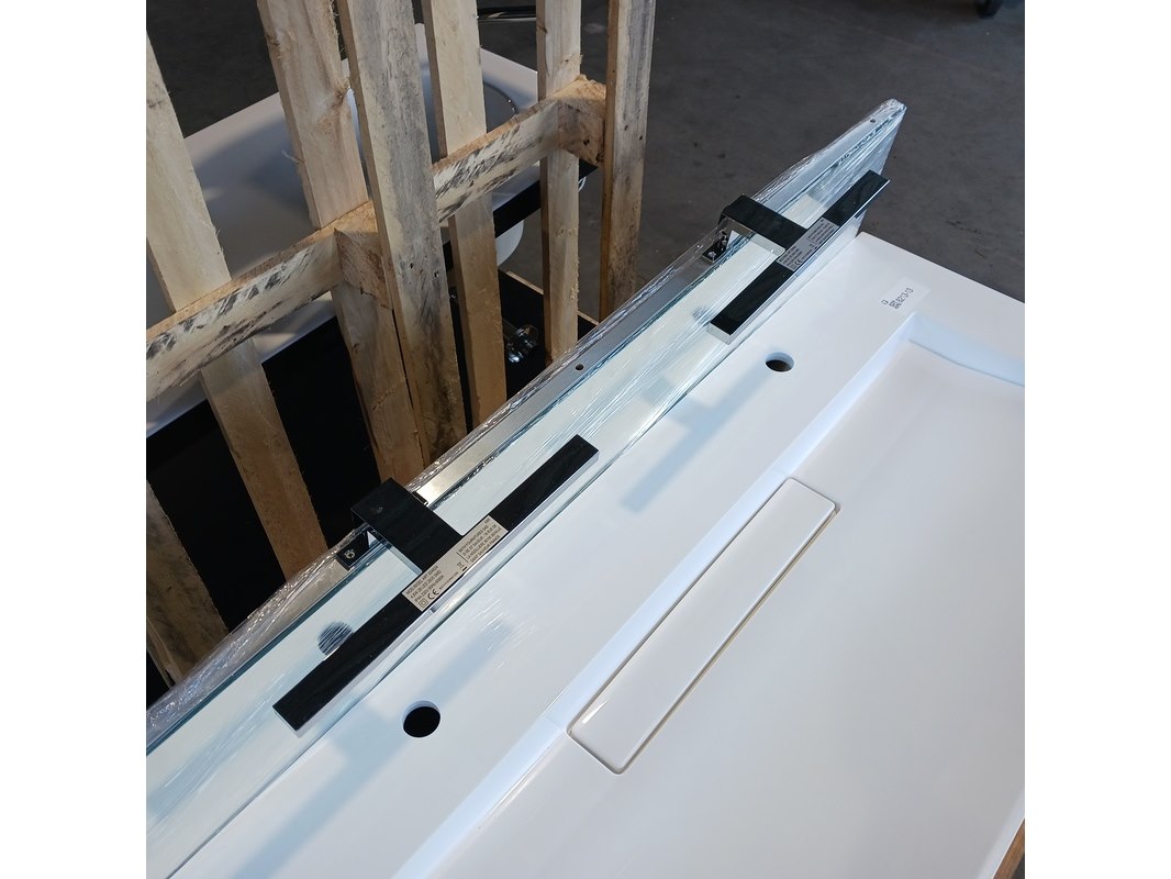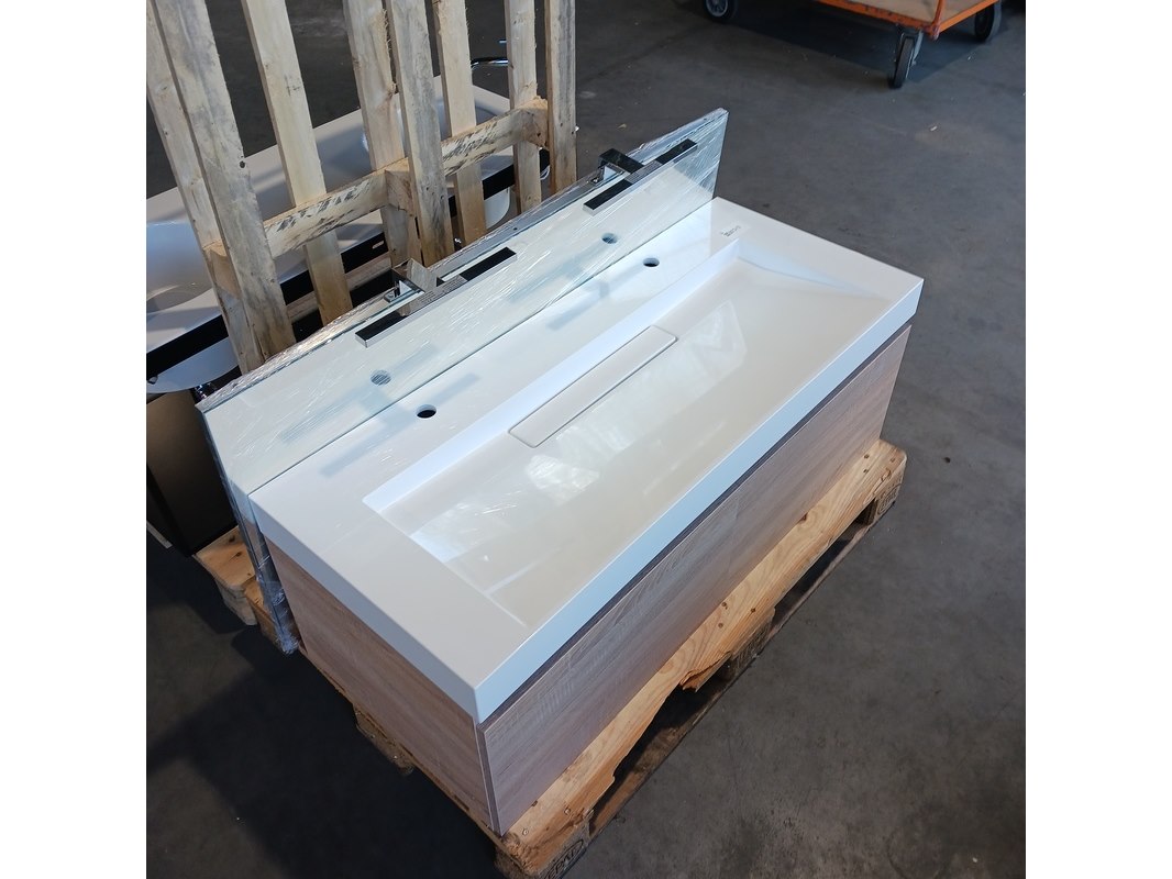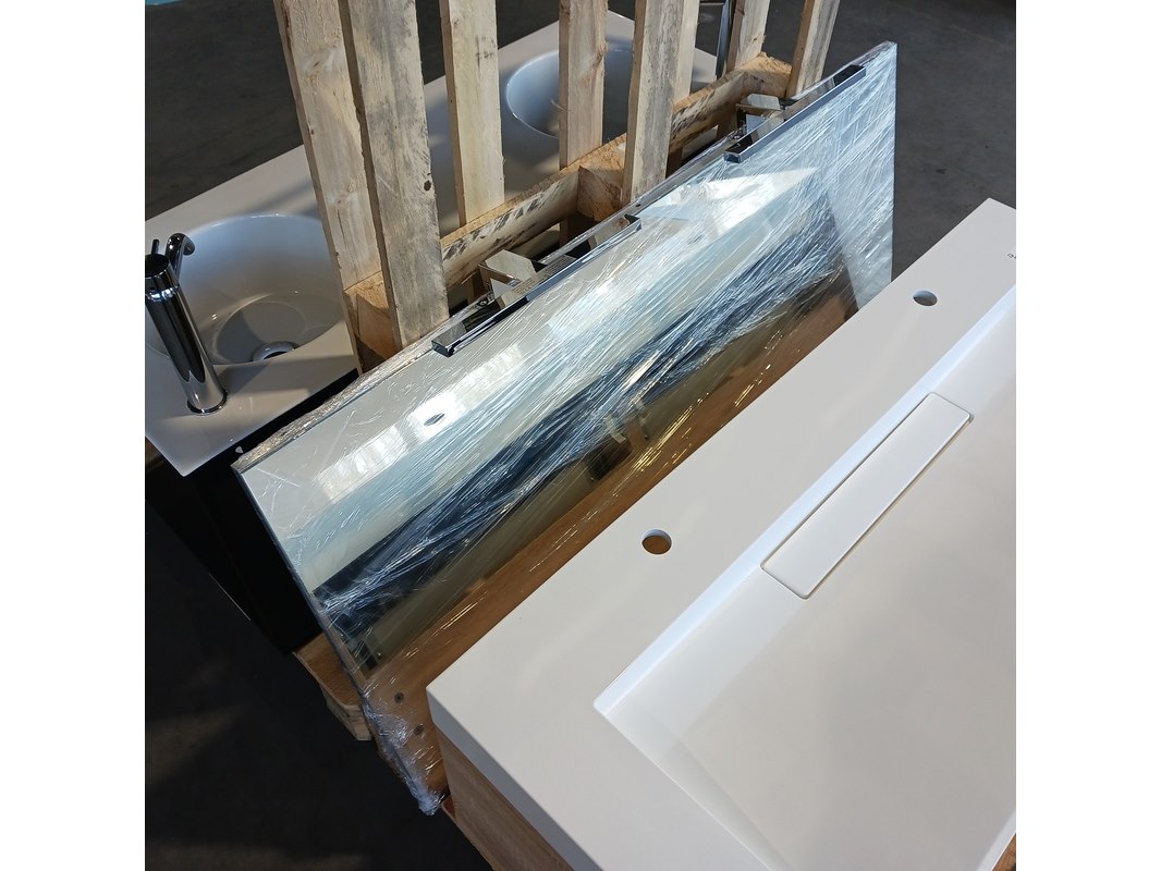 Merk: Blum Product: Badmeubel Kleur: Natuur eiken Afmeting: 120x50cm Specificaties: Lades met softclose, Blum lade geleiders, polybeton wastafel, verdekte afvoer, 2 kraangaten, spiegel, 120x65cm, met 2x verlichting