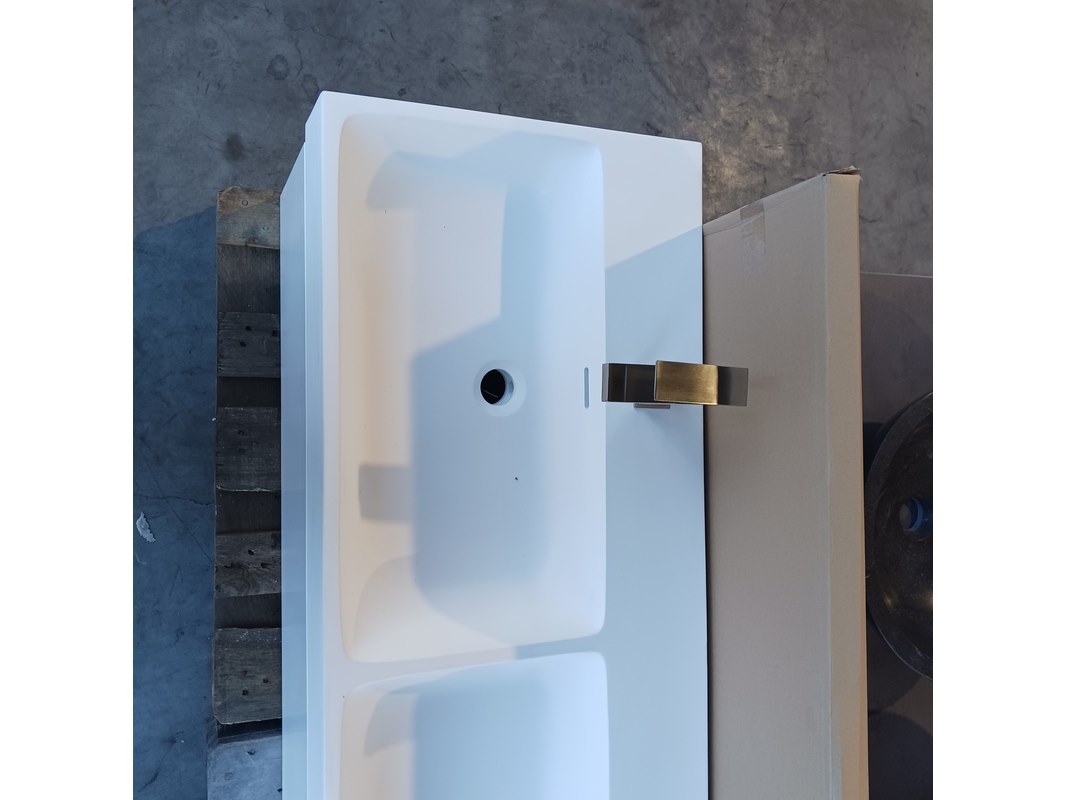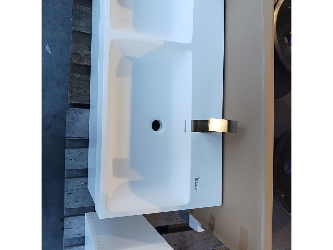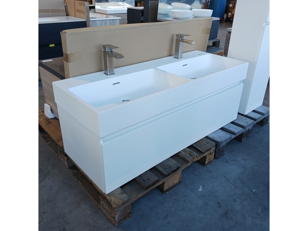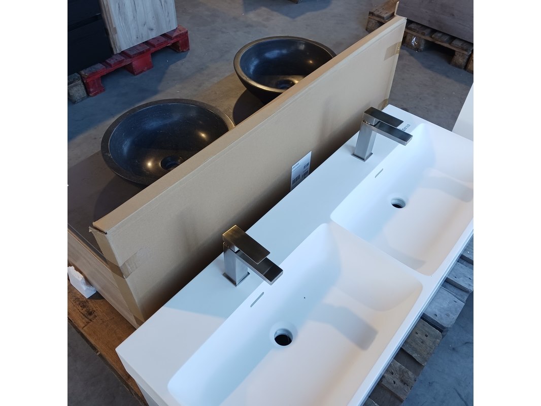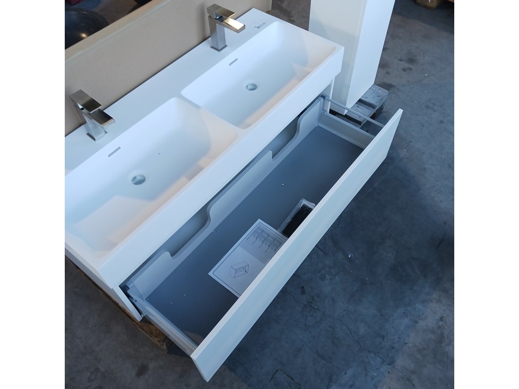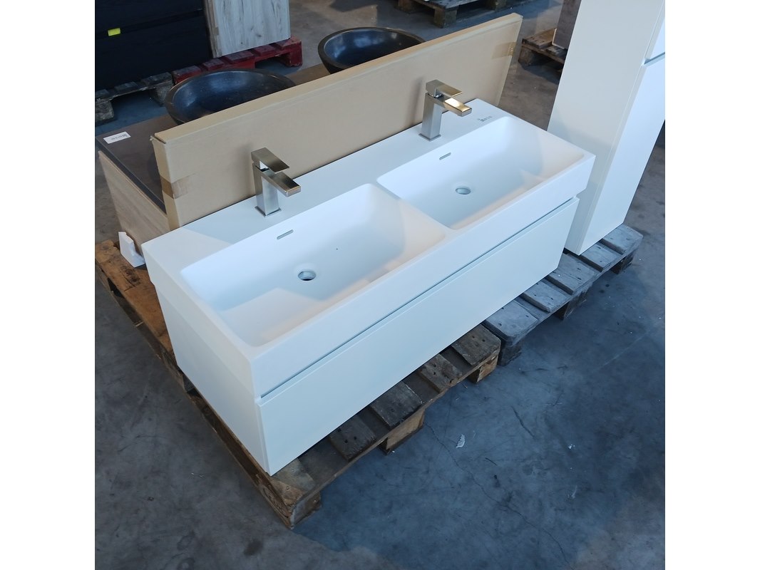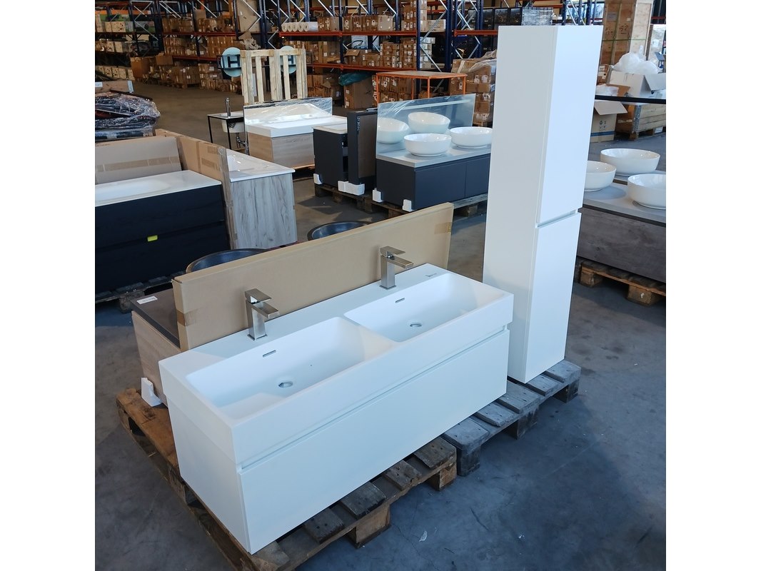 Merk: Blum Product: Badmeubel Kleur: Mat wit Afmeting: 120x46cm Specificaties: 1 lade met softclose en Blum geleide systeem, wastafel, solid, mat wit, 2x wastafelkraan, rvs-geborsteld, spiegel, 120x65cm, met 2x verlichting, hoge kast, 140x30x25cm, 2 deurtjes met softclose