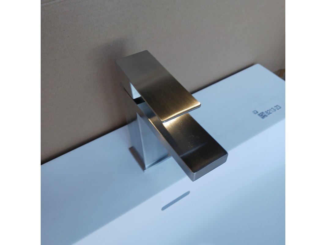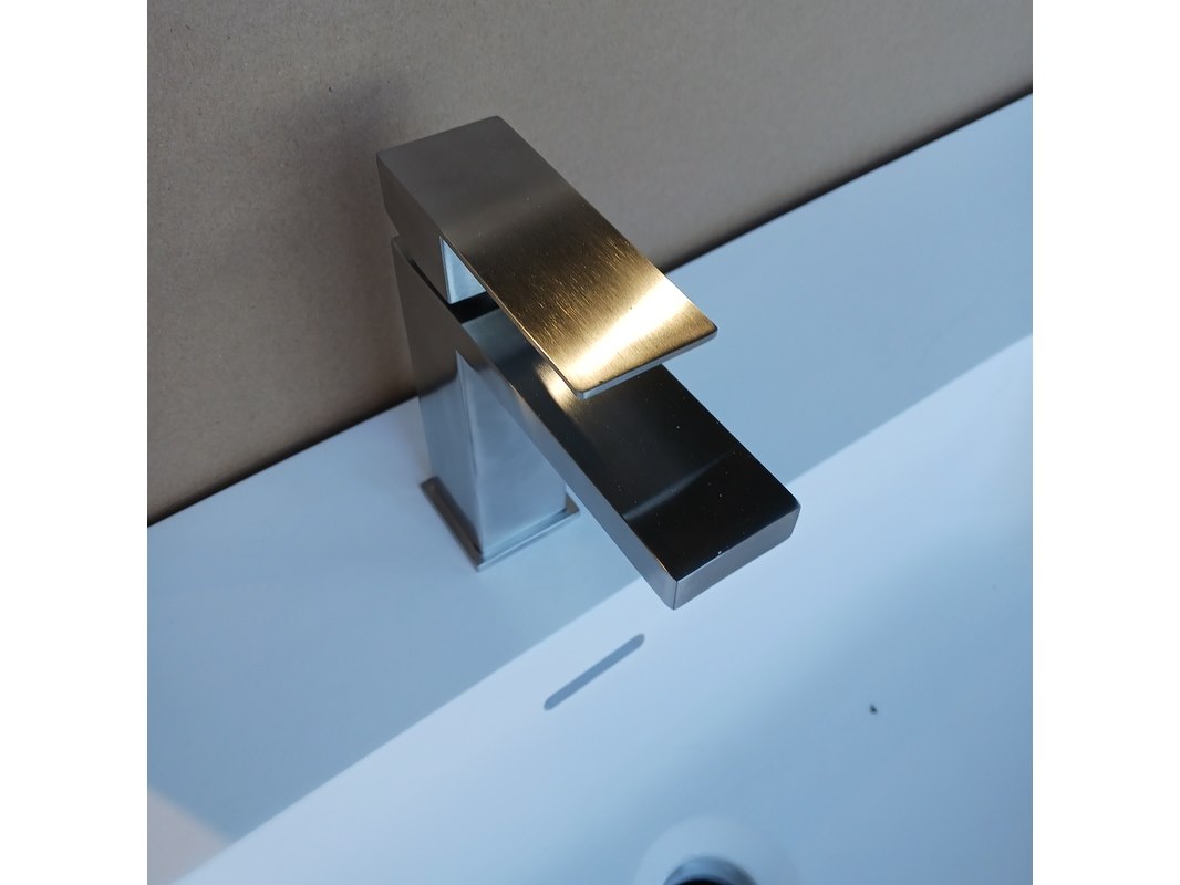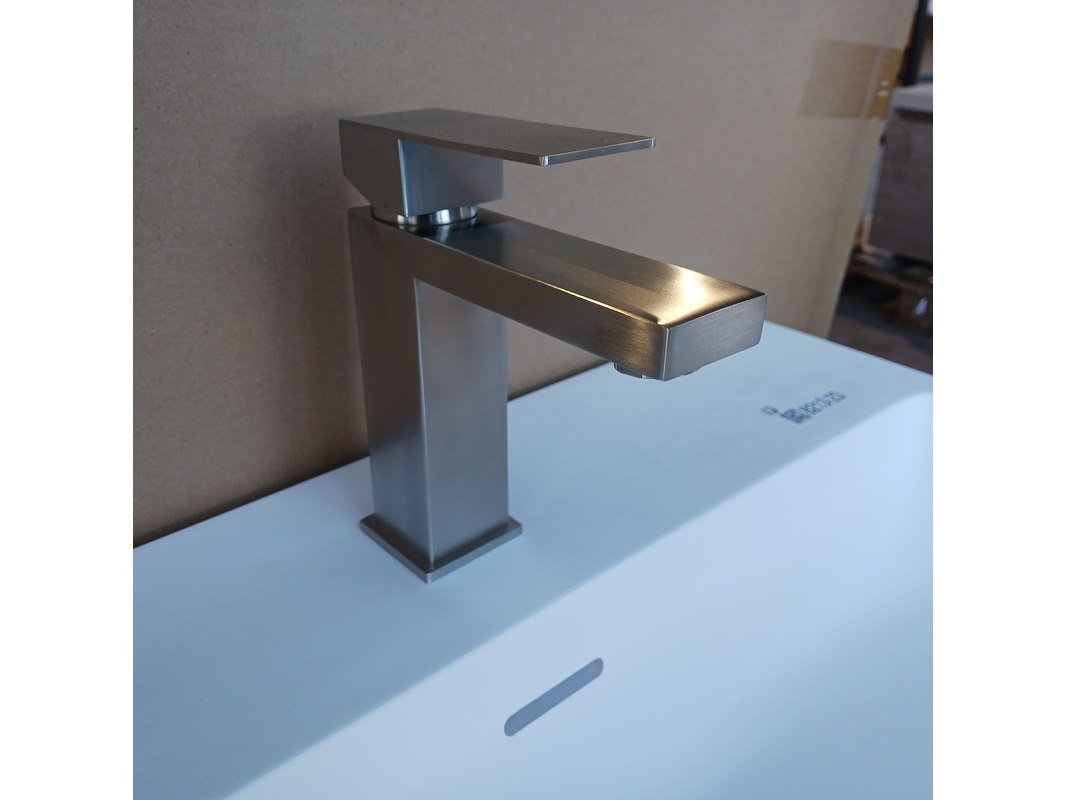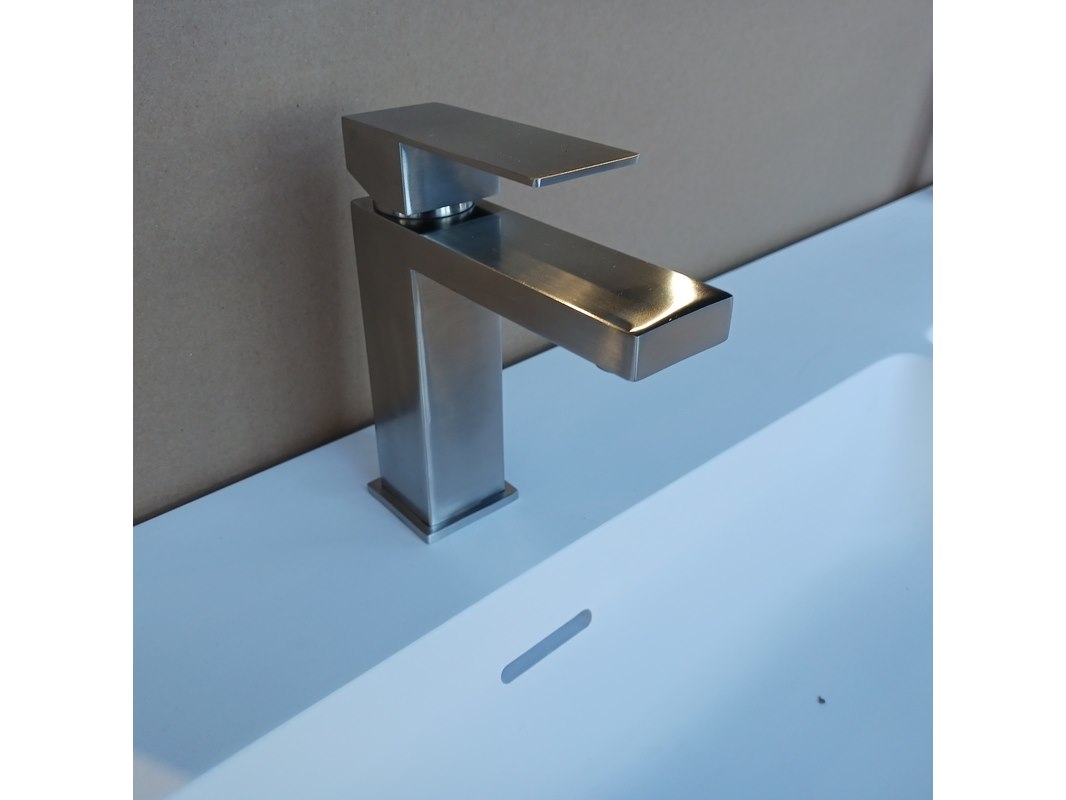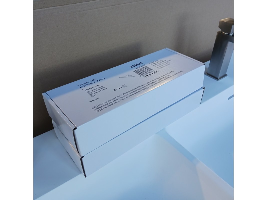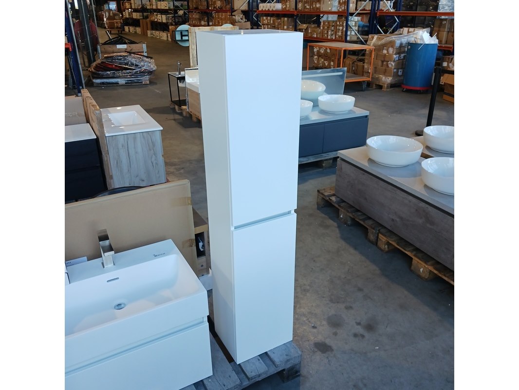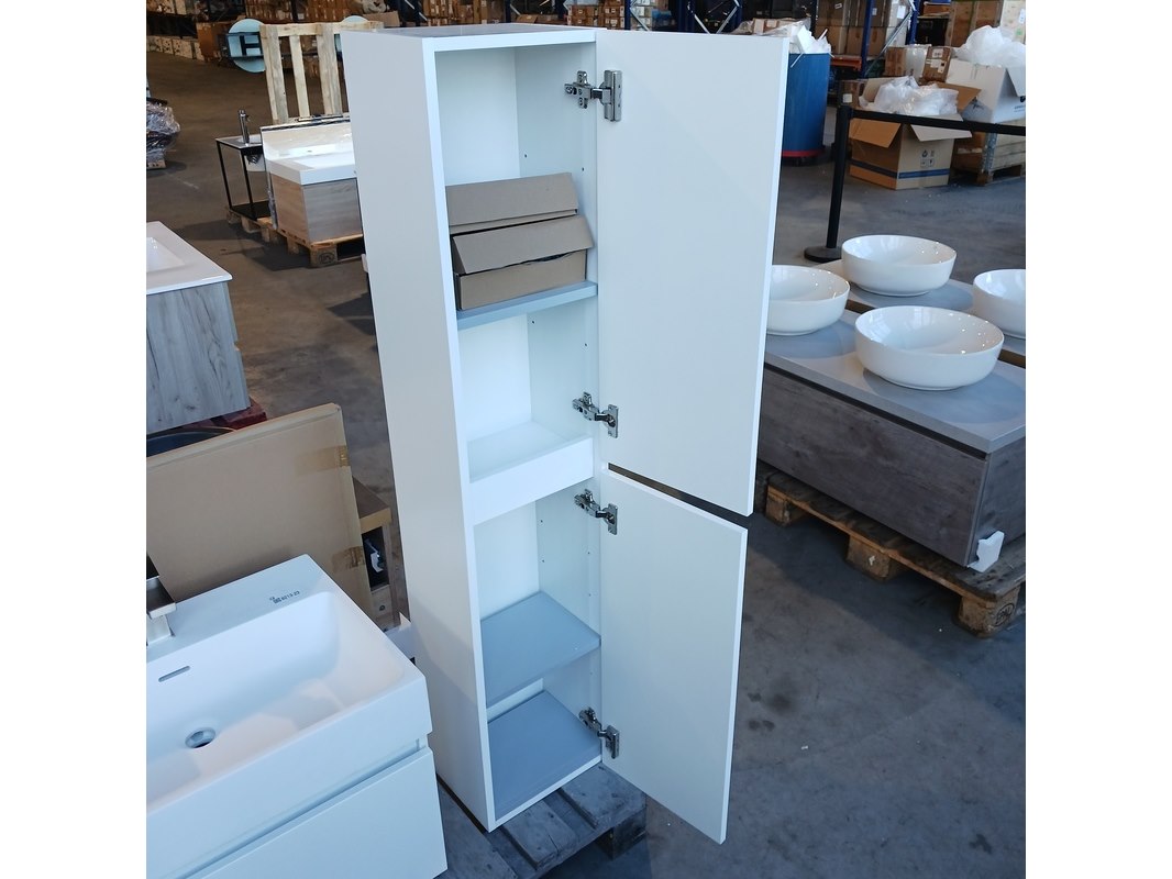 Merk: Blum Product: Badmeubel Kleur: Mat wit Afmeting: 120x46cm Specificaties: 1 lade met softclose en Blum geleide systeem, wastafel, solid, mat wit, 2x wastafelkraan, rvs-geborsteld, spiegel, 120x65cm, met 2x verlichting, hoge kast, 140x30x25cm, 2 deurtjes met softclose