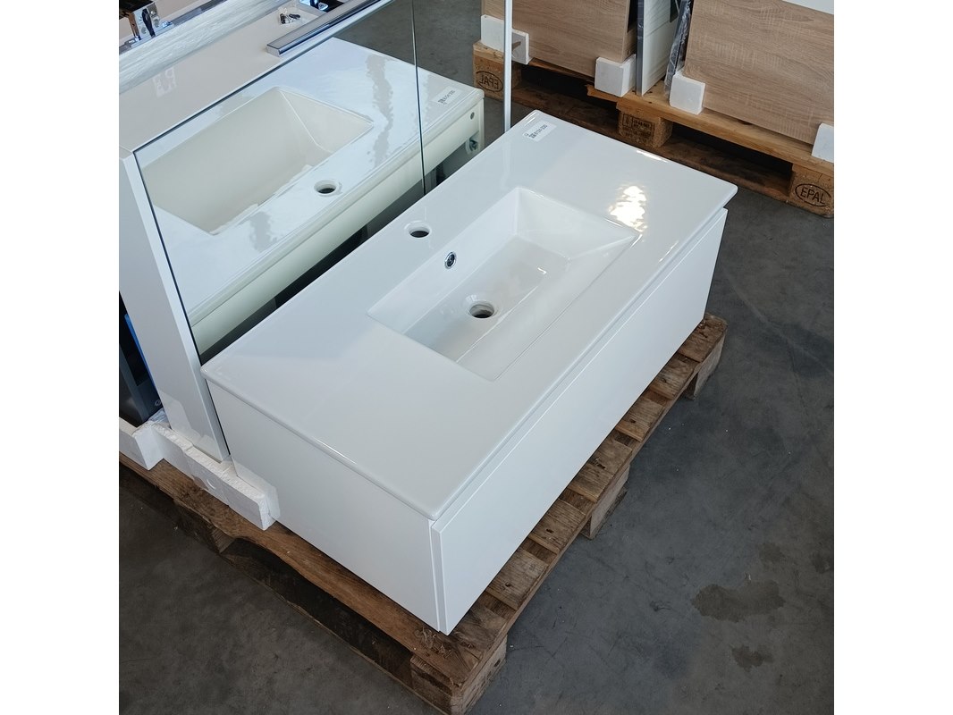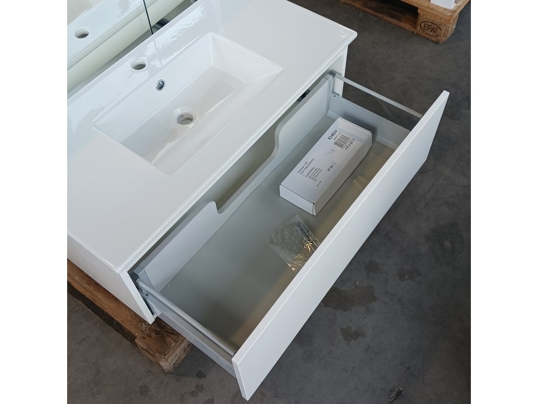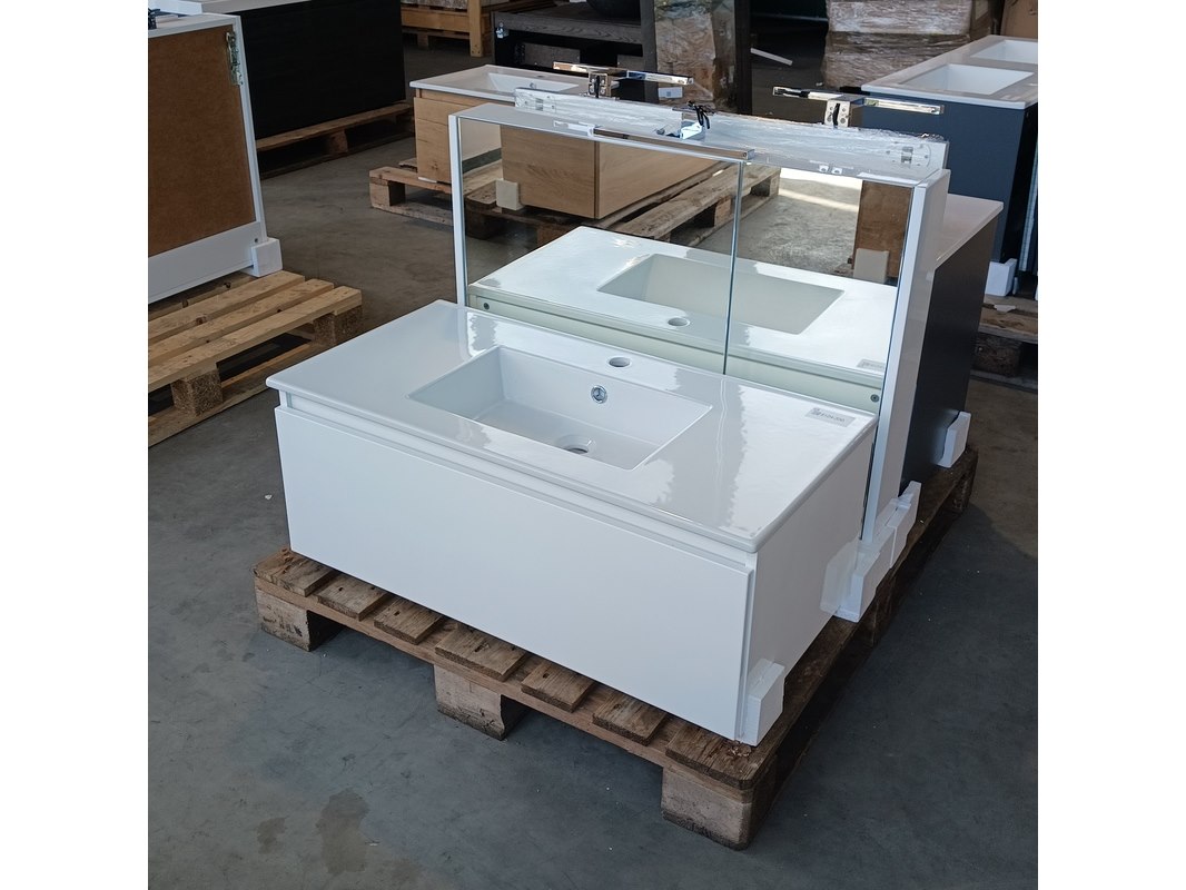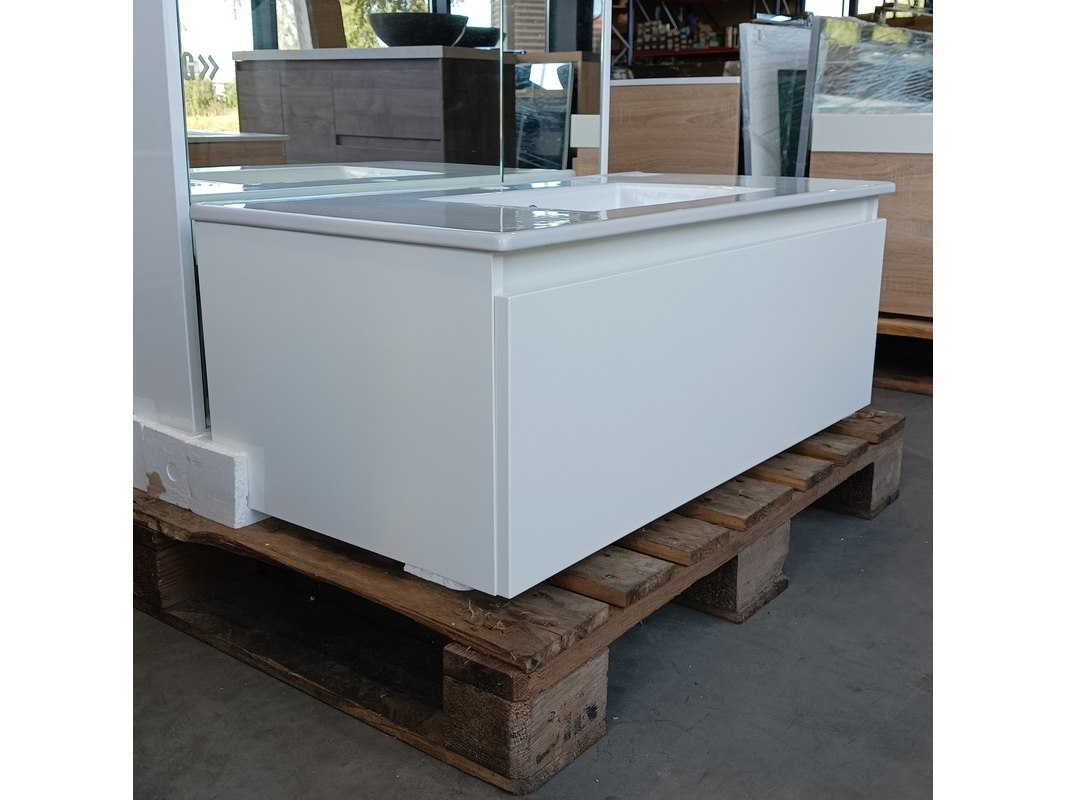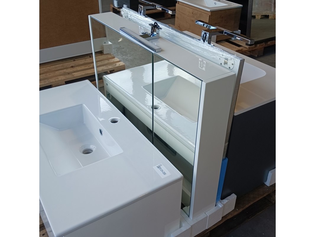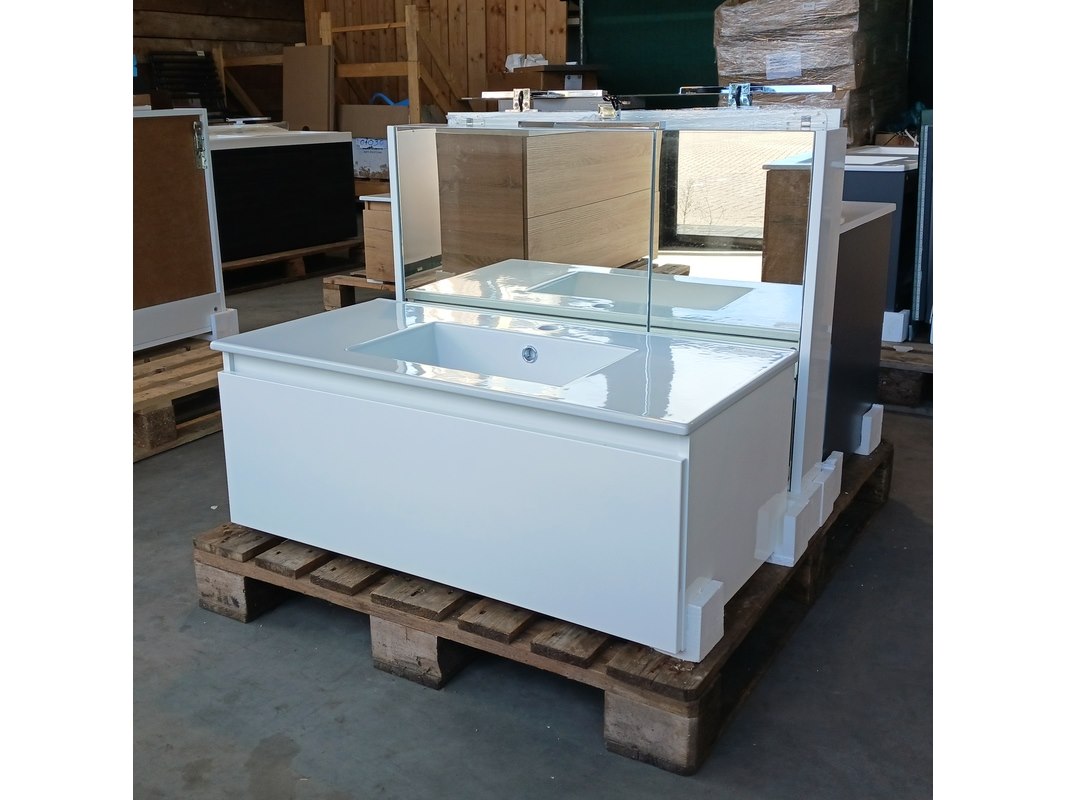 Merk: Dekker -Zevenhuizen Product: Badmeubel Kleur: Hoogglans wit Afmeting: 90x46cm Conditie: Nieuw Specificaties: 1 lade met softclose, met Blum lade-geleiders, keramische wastafel, spiegelkast, 2 deurtjes met softclose, dubbel spiegelend, met velichting