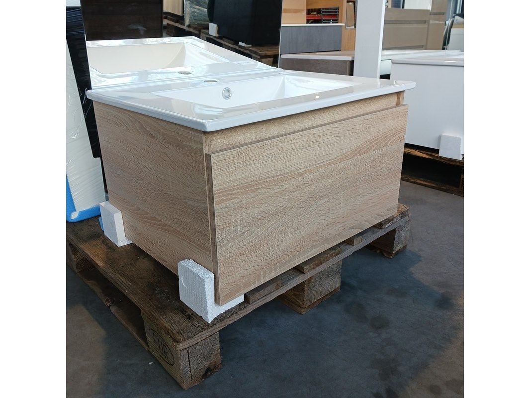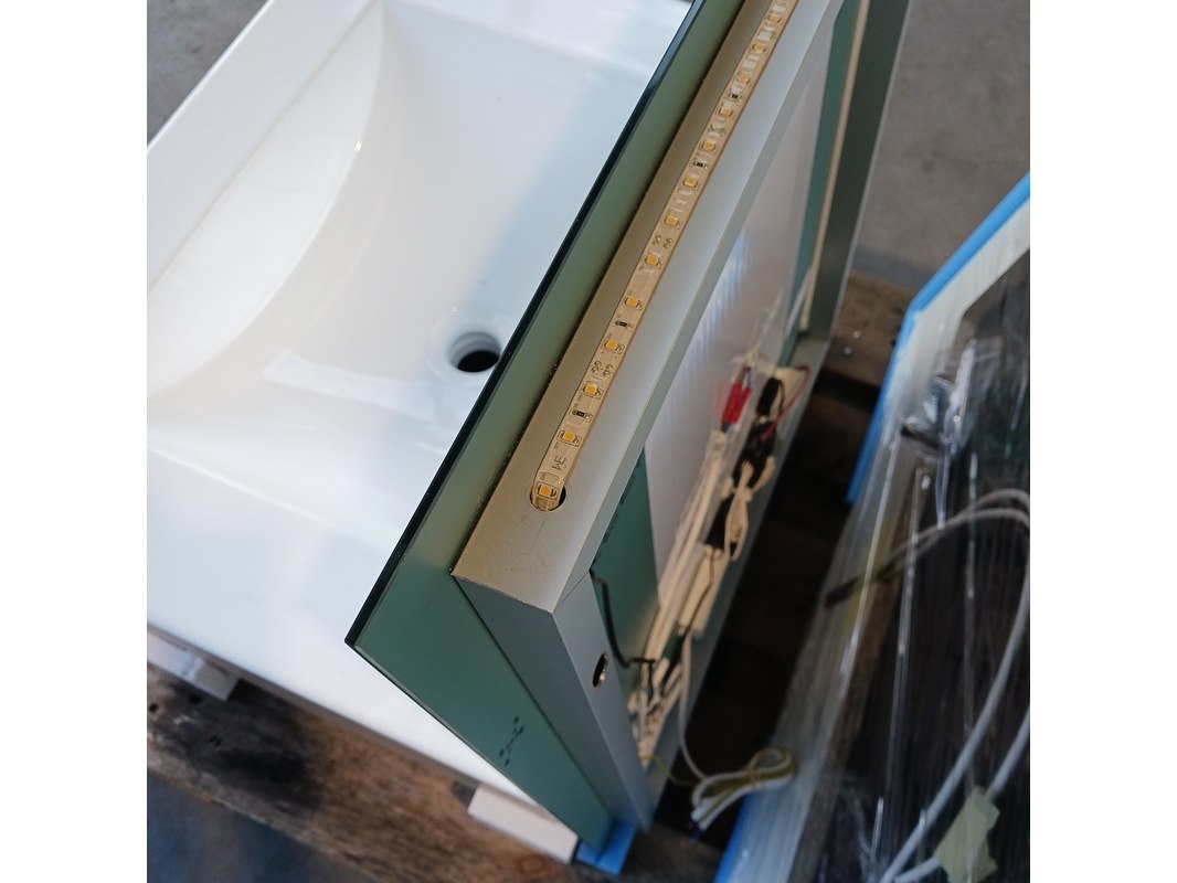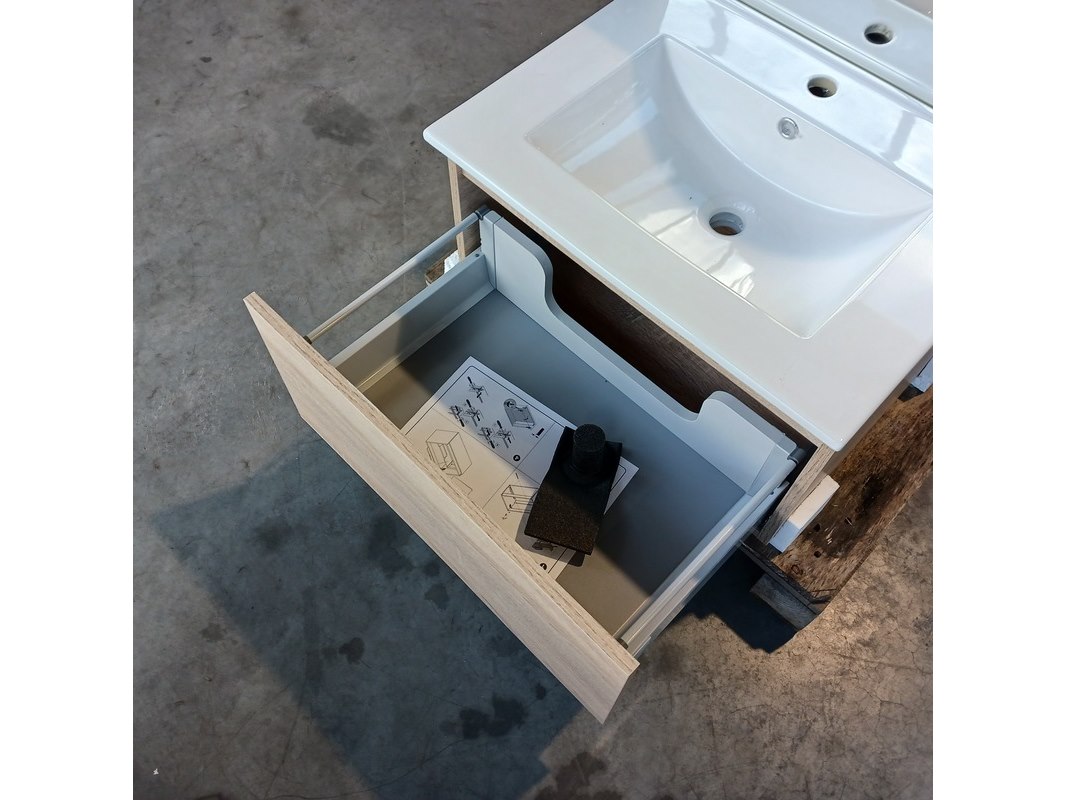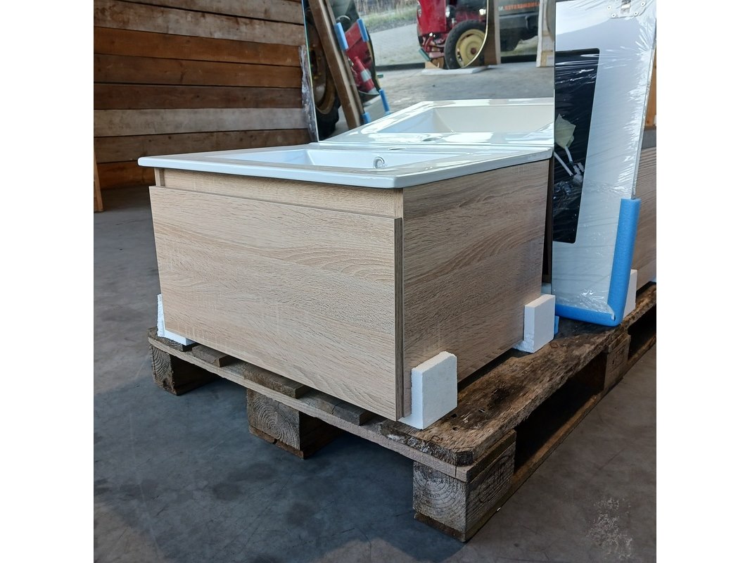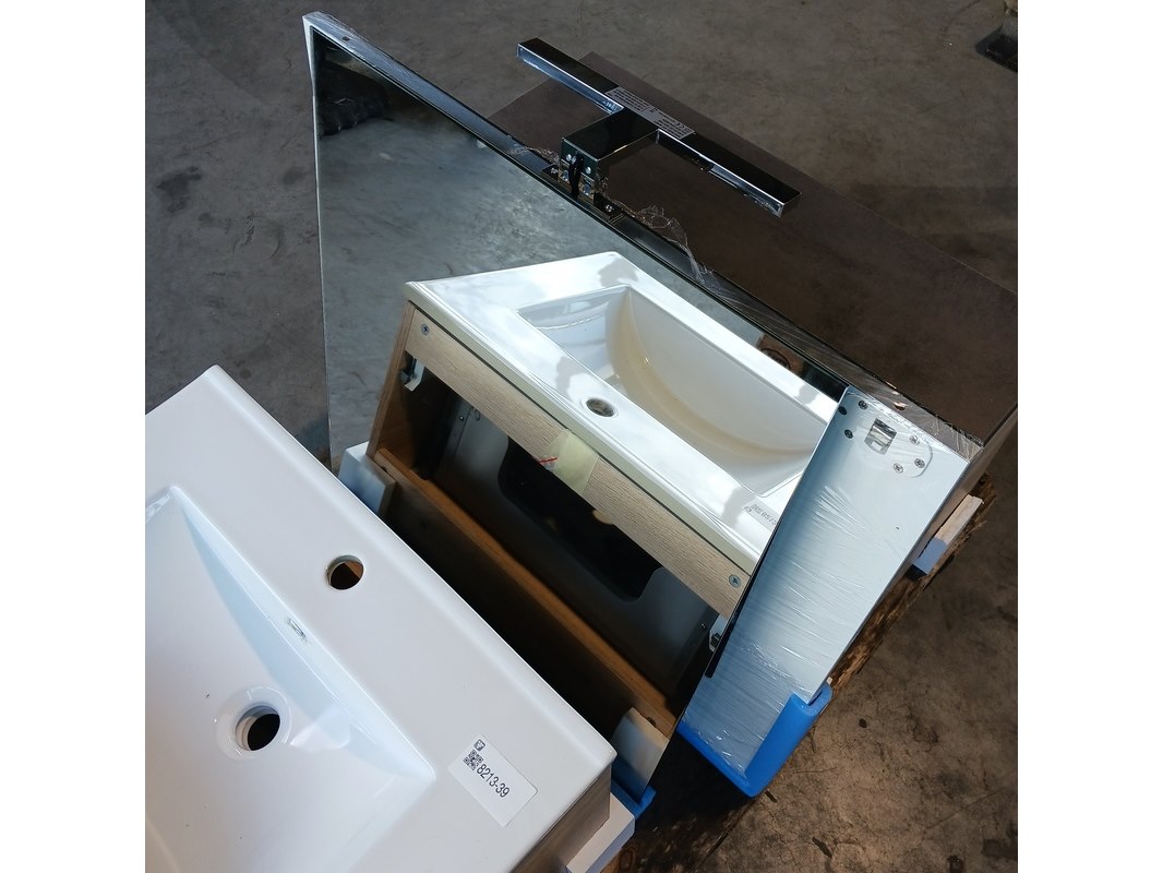 Merk: Blum Product: Badmeubel Kleur: Beach oak Afmeting: 60x46cm Specificaties: 1 lade met softclose en Blum geleide systeem, keramische wastafel, wit, spiegel, 60x70cm, indirecte LED onder en boven, spiegelverwarming, sensorbediening